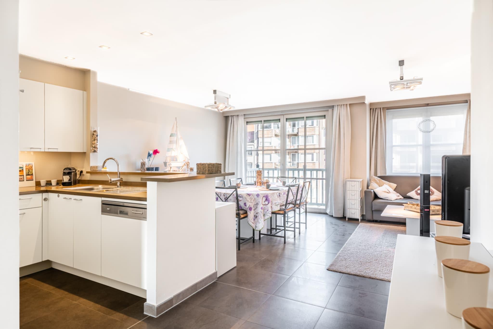 Oplev det perfekte fristed ved havet i denne moderne, stilfuldt indrettede lejlighed, kun få skridt fra sandstranden og den maleriske promenade. Den rummelige stue er designet til afslapning og åbner ud mod en solrig terrasse, der er ideel til at slappe af efter en dag ved kysten. Lejligheden har plads til op til 4 gæster og har to velindrettede soveværelser: et master-soveværelse med dobbeltseng og eget brusebad og et hyggeligt soveværelse med køjesenge og adgang til en solterrasse. Et elegant badeværelse med badekar og håndvask samt separat toilet sikrer ekstra komfort og privatliv. Nyd den livlige kystlivsstil med nærliggende caféer, restauranter og lokale markeder, der tilbyder friske fisk og skaldyr og regionale delikatesser. Udforsk vandre- og cykelstier for at fordybe dig i områdets naturlige skønhed, eller besøg nærliggende attraktioner for familievenlig underholdning. Det fuldt udstyrede åbne køkken med luksusapparater gør madlavningen til en leg, mens en privat parkeringsplads og opbevaringsrum med vaskemaskine giver ekstra bekvemmelighed. Med sin førsteklasses beliggenhed, moderne design og fremragende faciliteter er denne lejlighed din indgang til en uforglemmelig ferie ved havet.