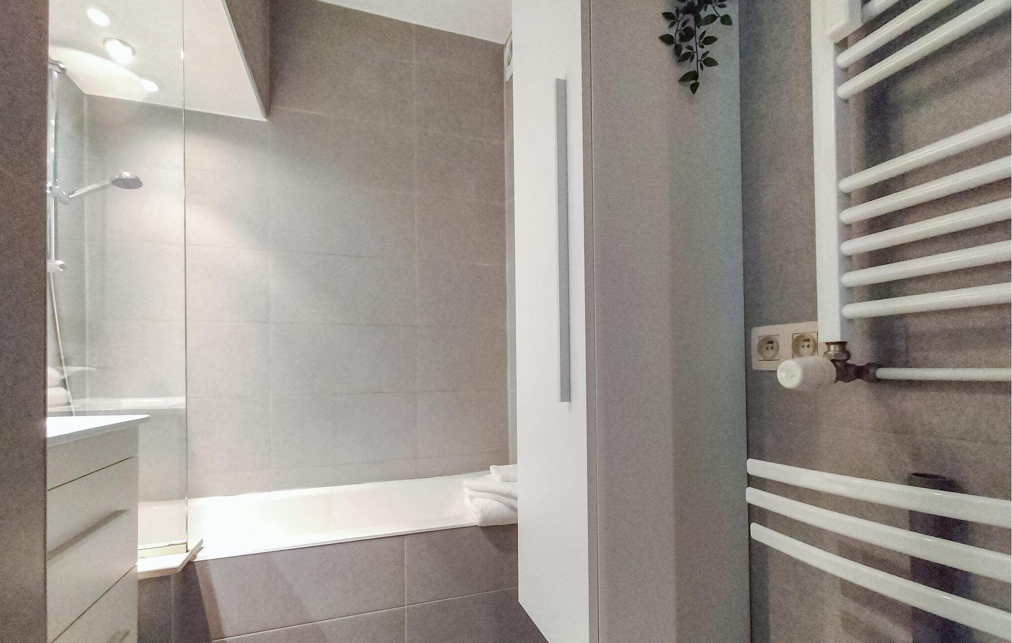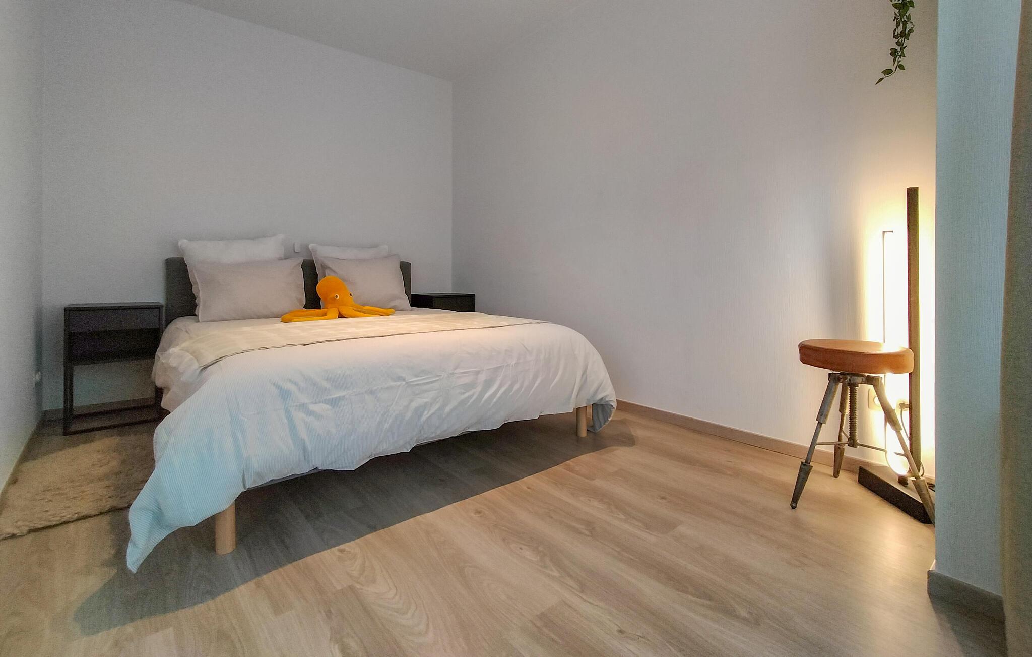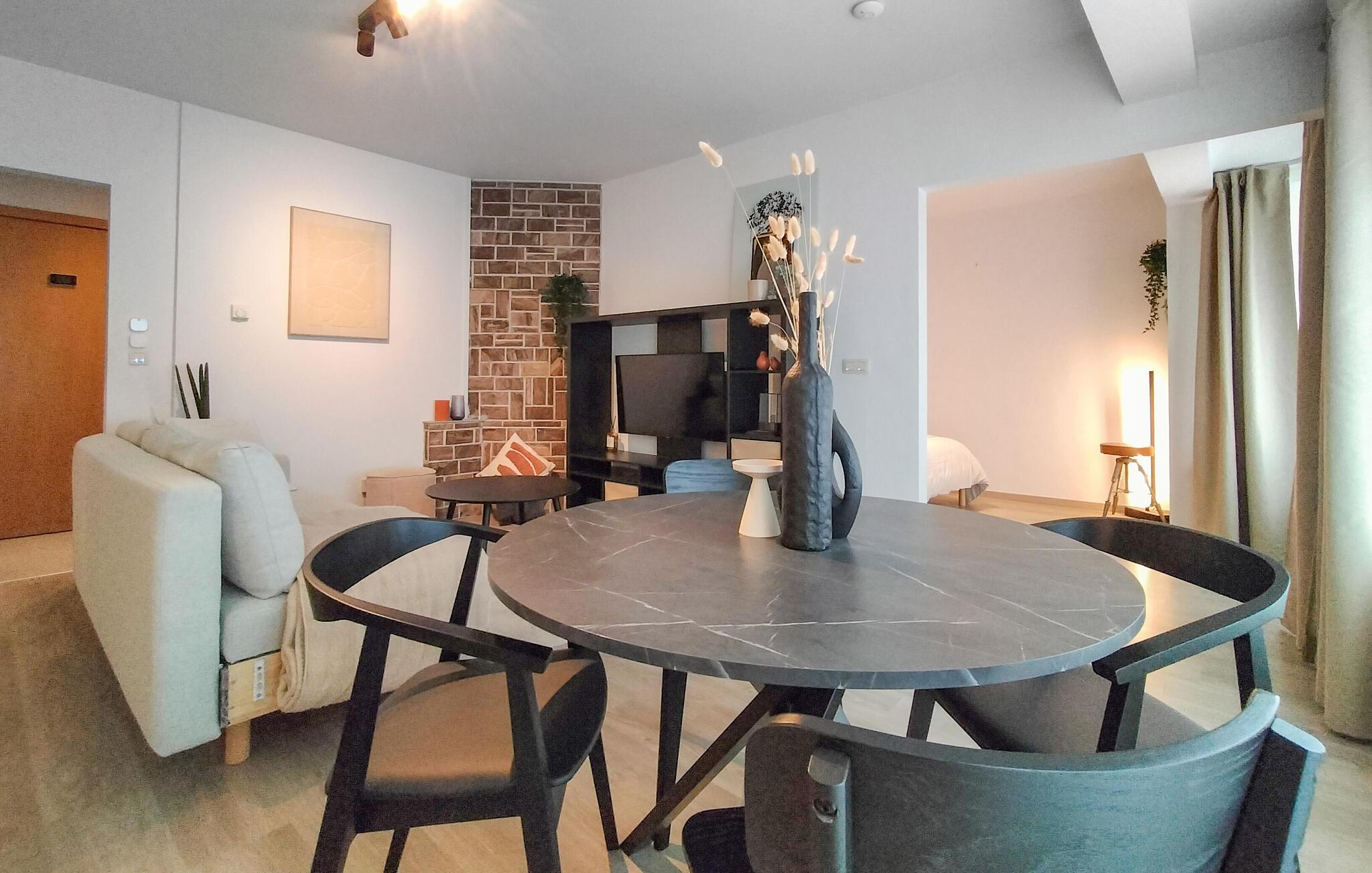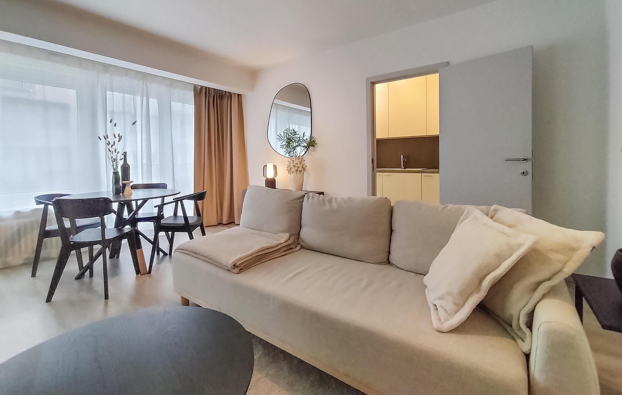 Velkommen til denne moderne og rummelige lejlighed, nogle få skridt fra sandstranden og med en smagfuld opholdsstue. Tilbered lækre måltider med regionale specialiteter og planlæg jeres aktiviteter i den hyggelige stue. Efter en lang dag kan I streame en film eller slappe af på sofaen med en god bog.