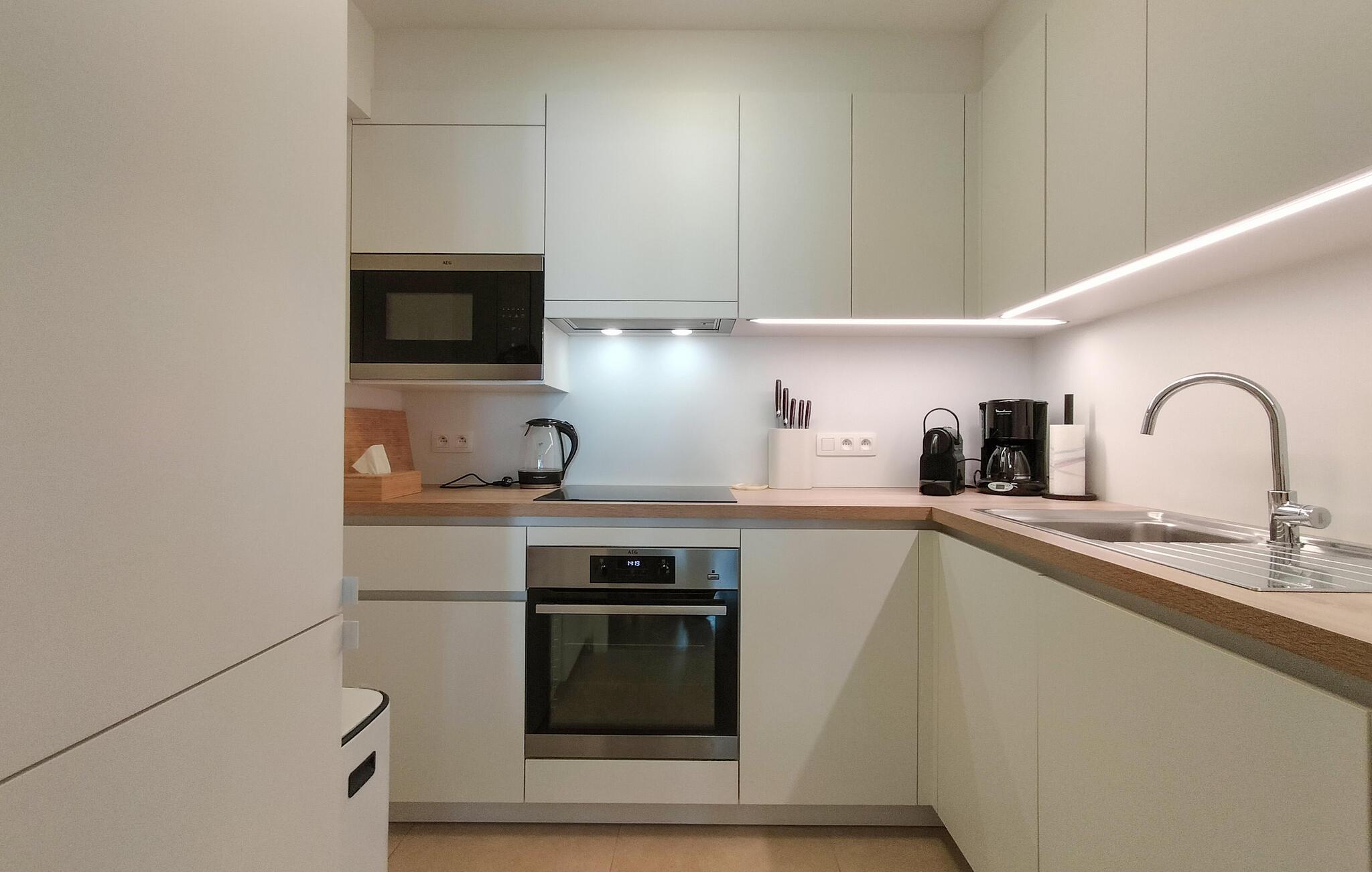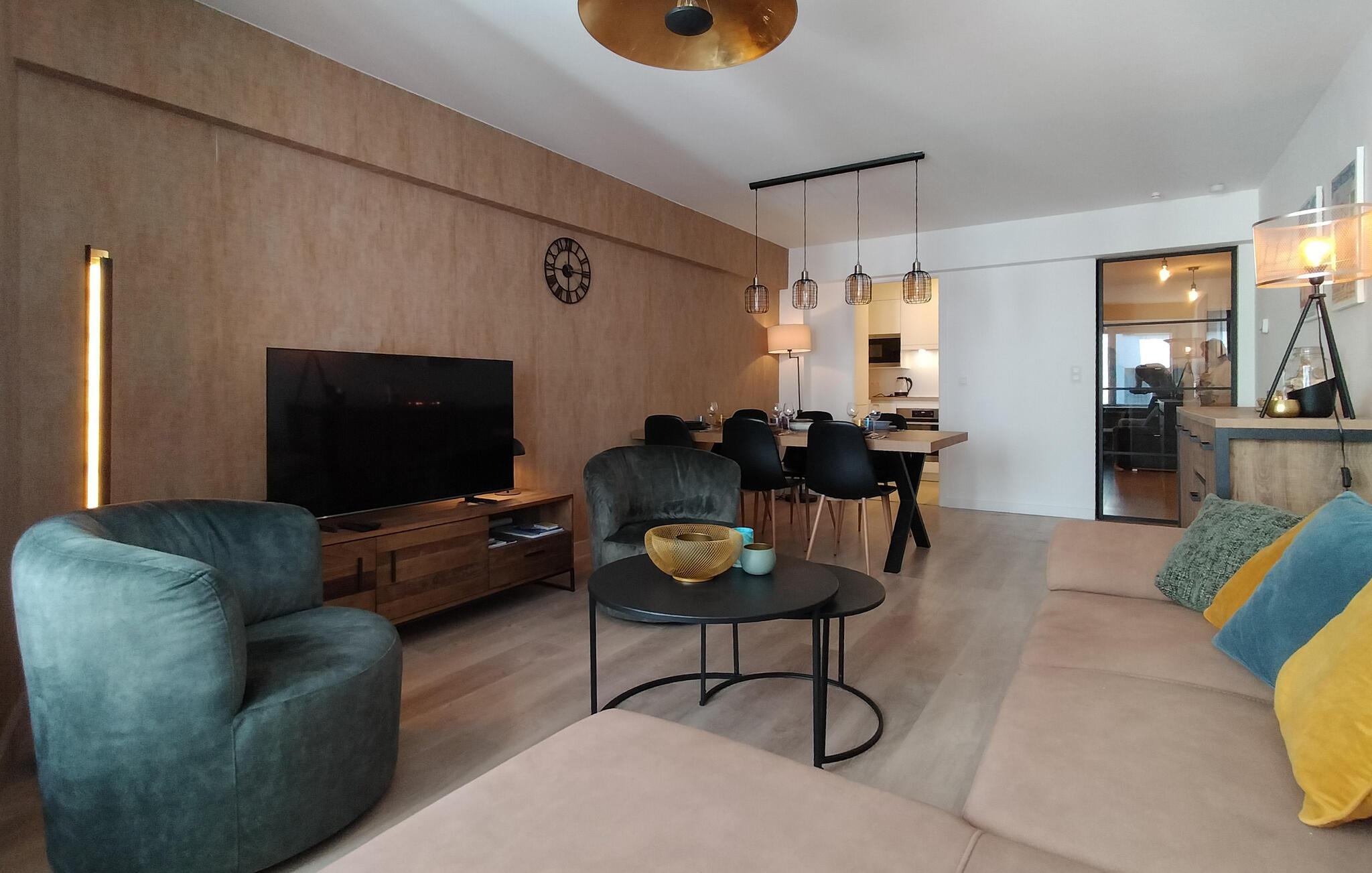 Slap af i den åbne opholdsstue med en behagelig sofa, lænestol og TV. Boligens flotte indretningsløsninger med smagfulde træmøbler, dekorativ belysning og farvekoordinerede accenter skaber en stilfuld atmosfære. Tilbered dagens måltider i det praktiske køkken og nyd dem ved det smukke spisebord under stemningsfuld belysning. Tag jer tid til samtaler, film eller en god bog. Lejligheden tilbyder plads til rolige stunder og sociale stunder. Brug vindueskarmen som udsigtspunkt for den urbane og maritime travlhed.