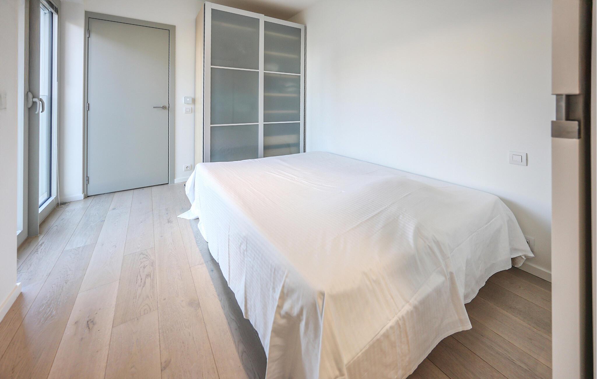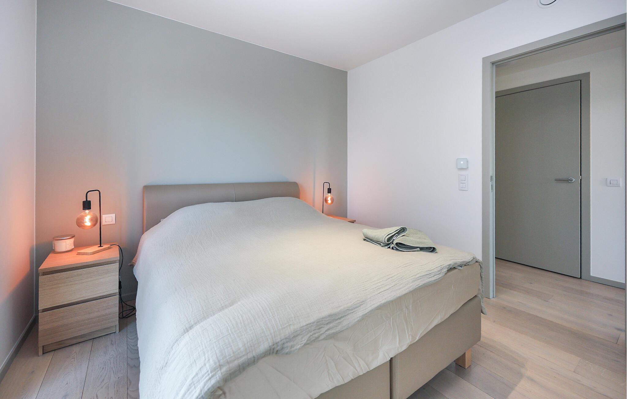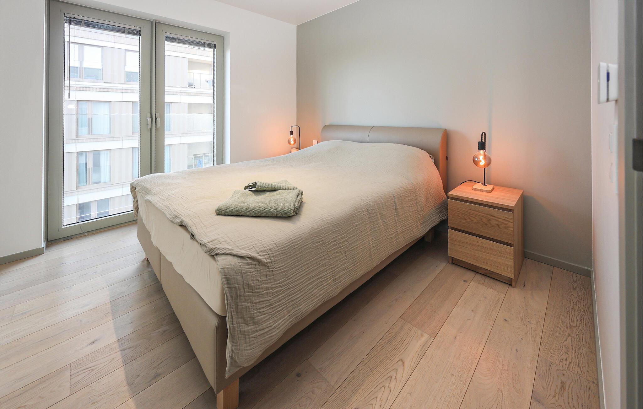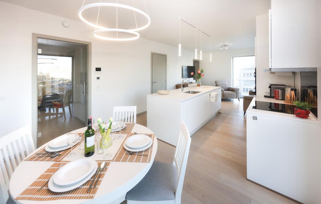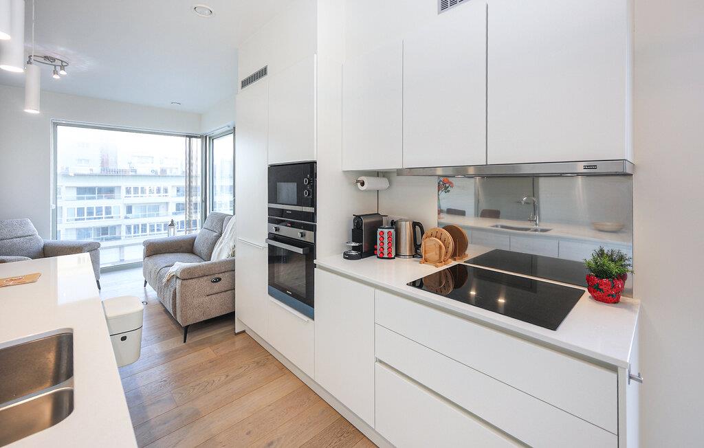 Denne stilfulde lejlighed er noget særligt med sit lyse, moderne design og åbne opholdsrum, der straks formidler en følelse af rummelighed og lethed. Store vinduer lukker masser af naturligt lys ind og tilbyder en smuk udsigt over omgivelserne, mens varme trætoner og elegante møbler skaber en behagelig og hjemlig atmosfære. Det moderne køkken med morgenmadsbar lægger op til at nyde øjeblikke med fornøjelse – ideelt til at starte dagen på en afslappet måde eller afslutte aftenen med et glas vin.
