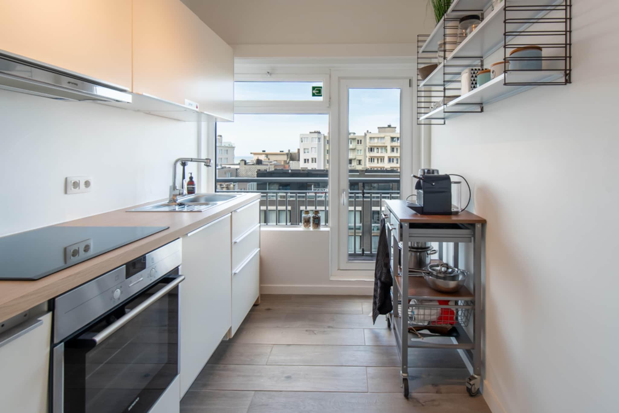 Denne moderne lejlighed med 2 soveværelser tilbyder den perfekte kombination af komfort, stil og kystcharme. Beliggende på 10. sal i en velholdt bolig kan den prale af en rummelig terrasse med en smuk havudsigt fra siden, det ideelle sted til morgenkaffe eller en aftensolnedgang. Indenfor er opholdsstuen lys og indbydende med smagfuld indretning, digital-tv og et røgfrit miljø, der skaber en frisk og afslappende atmosfære. Det fuldt udstyrede køkken er klar til alle dine kulinariske behov med elektrisk kogeplade, separat ovn og mikrobølgeovn, køleskab med frostboks, opvaskemaskine og en kaffemaskine med kopper. Terrassemøbler giver dig mulighed for at nyde dine måltider i den friske havbrise, mens et strygejern og strygebræt gør det nemt at ophold længere. Et separat toilet (uden for badeværelset) sikrer ekstra komfort for gæsterne. Lejlighedens moderne faciliteter, herunder Wi-Fi og en elevator i bygningen, gør dit ophold ubesværet og behageligt. Centralt beliggende kun 100 meter fra stranden har du alt, hvad du behøver, inden for gåafstand fra butikker og caféer til den travle Visserskaai med dens friske fiskerestauranter. Der er offentlig transport i nærheden, så man nemt kan tage på dagsture, og området byder på masser at udforske, uanset om du vil slentre langs promenaden, besøge lokale markeder eller blot slappe af ved kysten. Denne lejlighed er virkelig en perle for alle, der søger en afslappende og velbeliggende ferie ved havet.