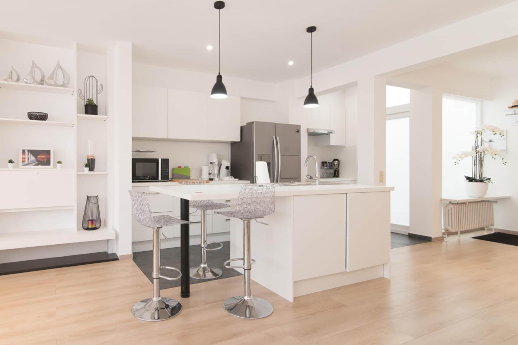 Charmerende og lys lejlighed i hjertet af Oostende, tæt på havet og stranden. Moderne interiør, store rum og terrasse på bagsiden. Cykelskur i boligen.