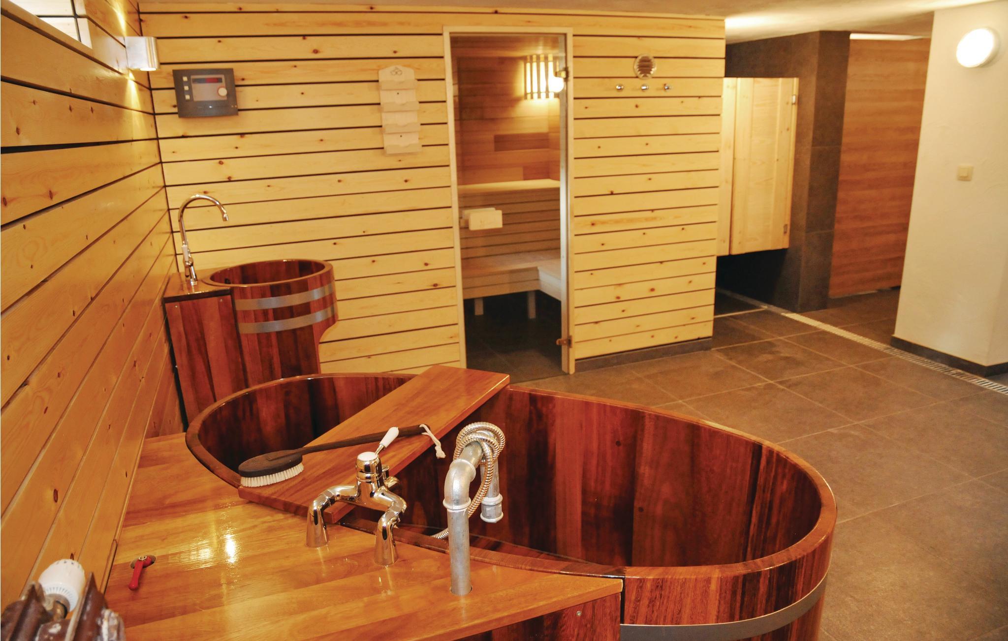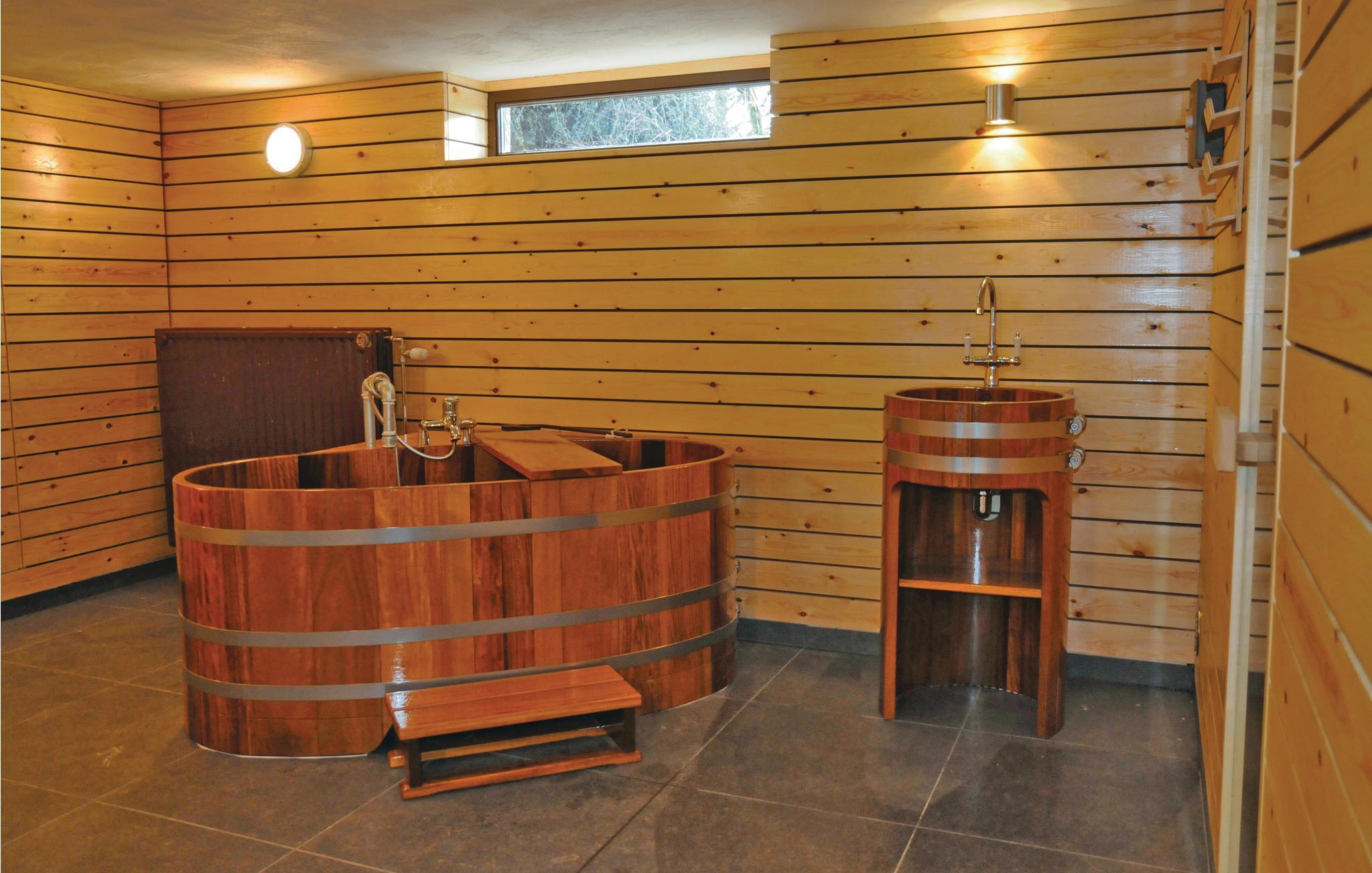 Når I ankommer til dette feriehus, overraskes I over, hvor komfortabelt og luksuøs det er. Ad en trappe er der adgang til stuen med kamin, digitaltv og PS4. Det moderne køkken er godt udstyret, soveværelset og badeværelset er komfortabelt. I stueplan ligger den store overraskelse: wellness med luksuøs sauna, badetønde og afslapningsrum med tv, barhjørne og køleskab. Her ligger det fjerde soveværelse også. Udendørs kan I slappe af på den overdækkede terrasse med loungemøbler.