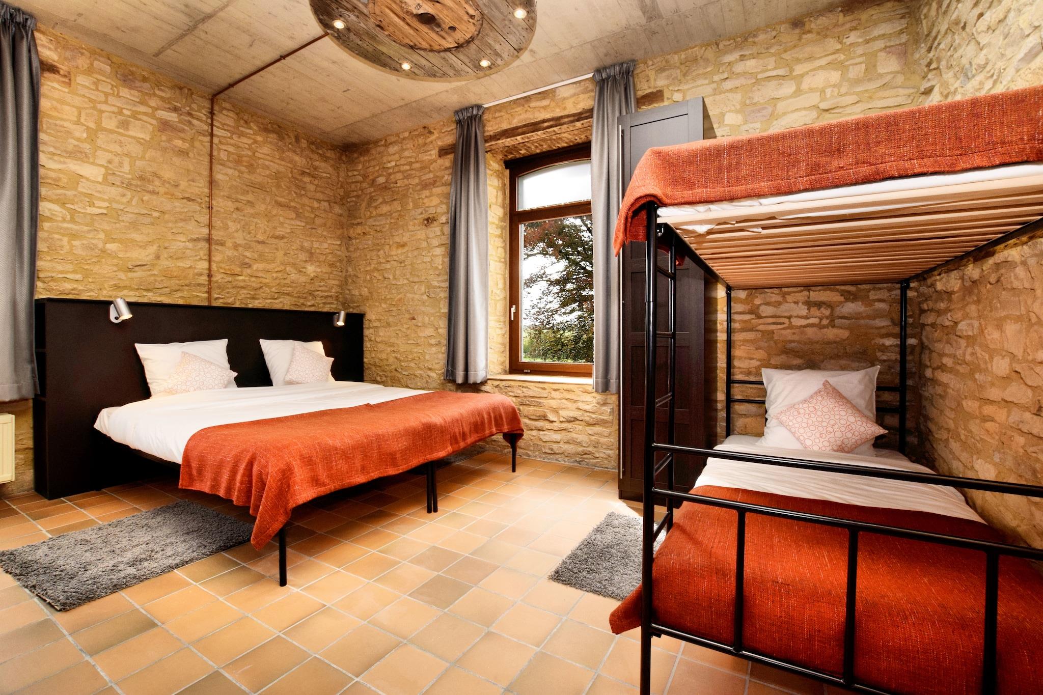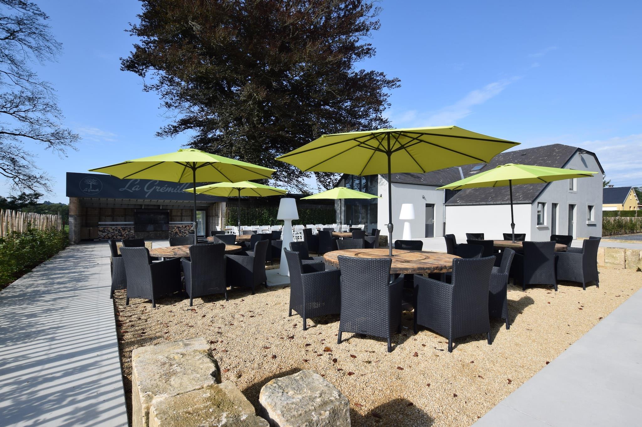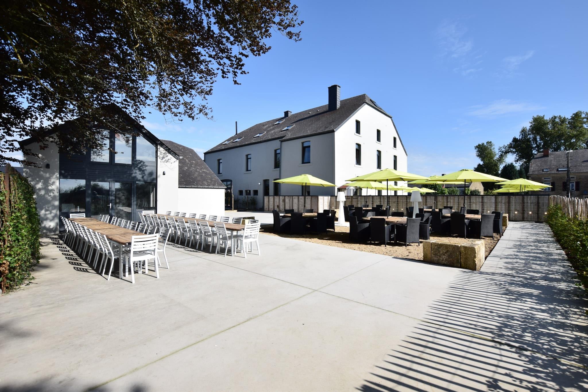La Grémille – Et autentisk tilflugtssted i hjertet af Gaume La Grémille ligger i den storslåede Gaume-region i det sydlige Belgien og er et stort, charmerende hus, der på en smuk måde kombinerer komfort, autenticitet og hygge. Med plads til op til 50 gæster er denne exceptionelle ejendom ideel til familiesammenkomster, bryllupper, seminarer, teambuilding-retreats eller private fester. La Grémille ligger kun 3 km fra Chassepierre, en af Valloniens smukkeste landsbyer kendt for sin internationale gadeteaterfestival, og 8 km fra Domaine des Épioux, et 1.500 hektar stort naturreservat med skove og damme. Det er den perfekte base for at udforske natur, kultur og lokal kulturarv. Huset har 17 elegante soveværelser, alle med eget badeværelse, og rummelige fællesområder designet til både afslapning og samvær. Gæsterne kan nyde en stor, lys stue, en hyggelig spisestue og en lille lounge inspireret af Orval Abbey, perfekt til rolige øjeblikke. Det professionelle køkken er fuldt udstyret til at tilberede måltider til store grupper, uanset om det er med egen mad eller en privat kok. For fritid og velvære tilbyder La Grémille et spillerum med billard, bordfodbold og bordtennis samt et saunaområde til afslapning. Fra 1. april til 31. oktober kan gæsterne også nyde den indendørs swimmingpool - ideel til afslapning i al slags vejr. Udenfor omfatter ejendommen en stor terrasse, grillplads og petanquebane, omgivet af den charmerende landsbys fredfyldte atmosfære.