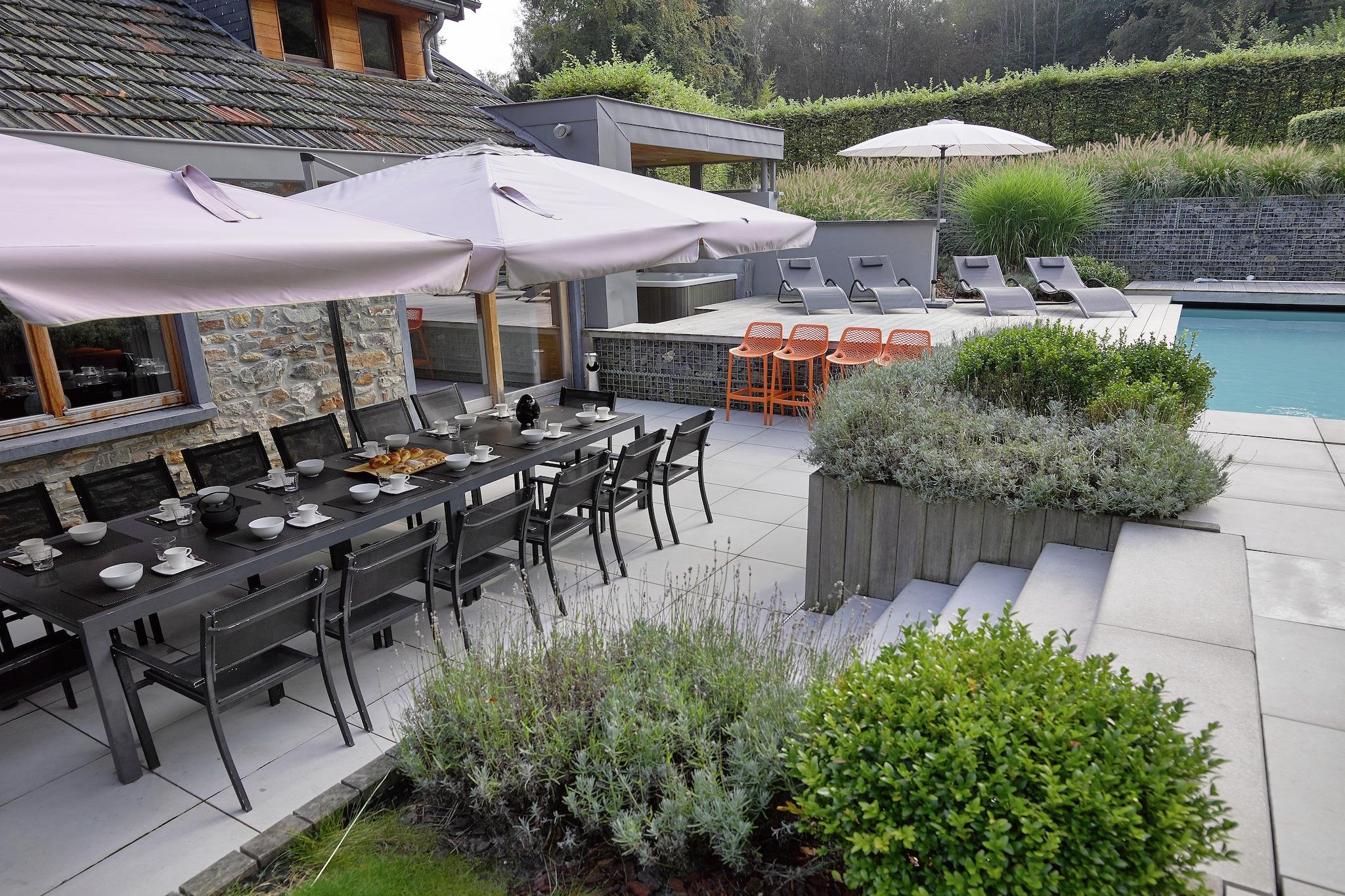 I denne meget moderne villa med subtile Zen-elementer kan du virkelig slappe af. Varmt indrettet, en udendørs swimmingpool, fuld privatliv og et spa med alle de wellness-faciliteter, du kan ønske dig. Byen Spa ligger inden for gåafstand. Villaen har en opvarmet udendørs swimmingpool (tilgængelig fra 15/05 til 30/09 og opvarmet op til 26 grader), jacuzzi og sauna. Gennem en automatisk port og en privat parkeringsplads har du adgang til dette drømmehus. På domænet er der 2 andre hytter til 4 og 6 personer samt en rideskole, hvor du kan ride en hest eller ride i en vogn. Denne storslåede villa er ideelt placeret til alle former for aktiviteter og sightseeing. For eksempel: golfbaner, kurbade, kasinoer, restauranter, luksusbutikker, Warfaaz-søen med pedalbåde, Francorchamps-kredsløbet og mange vandre- og cykelstier. Noter til familier med små børn: Huset har to trapper og nogle trin (niveauforskelle ) mellem de forskellige etager indendørs. Udenfor er der nogle lave vægge og trapper. Attention: swimming pool open from 01 May to the end of September