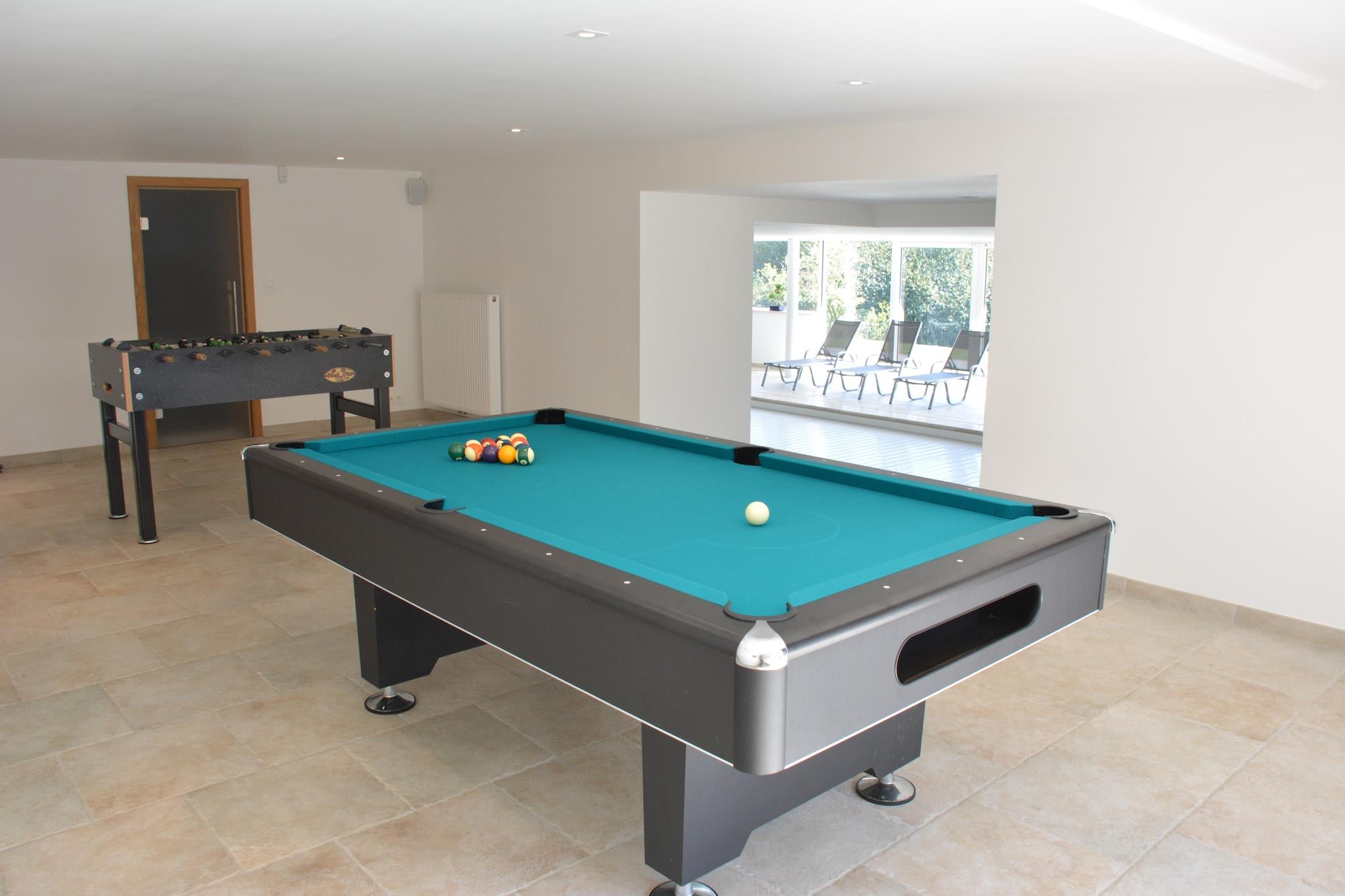 Stueetage: (åbent køkken(elkedel, brødrister, komfur(gas), kaffemaskine, espressomaskine, ovn, mikrobølgeovn, opvaskemaskine , køleskab(amerikansk)), stue / spisestue(Fjernsyn, pejs, DVD-afspiller), Soveværelse med badeværelse(via forholdsvis stejle trapper)(2x dobbeltseng(140 x 200 cm, 160 x 200 cm), bruser, håndvask), toilet) På 1. etage: (soveværelse(dobbeltseng, balkon), soveværelse(dobbeltseng, balkon), soveværelse(enkeltseng, køjeseng), badeværelse(badekar, bruser, 2x håndvask), toilet) Kælderetage: (toilet, opholdsrum(legeredskaber, bordfodbold, biljard), loungerum(bruser, sauna), bruser, vaskemaskine, liggestole, swimmingpool(privat, opvarmet, overdækket, 10 x 5 m.)) terrasse(180 m2), terrasse, have(> 1000 m2), havemøbler, grill, parkering, petanquebane, barneseng, barnestol