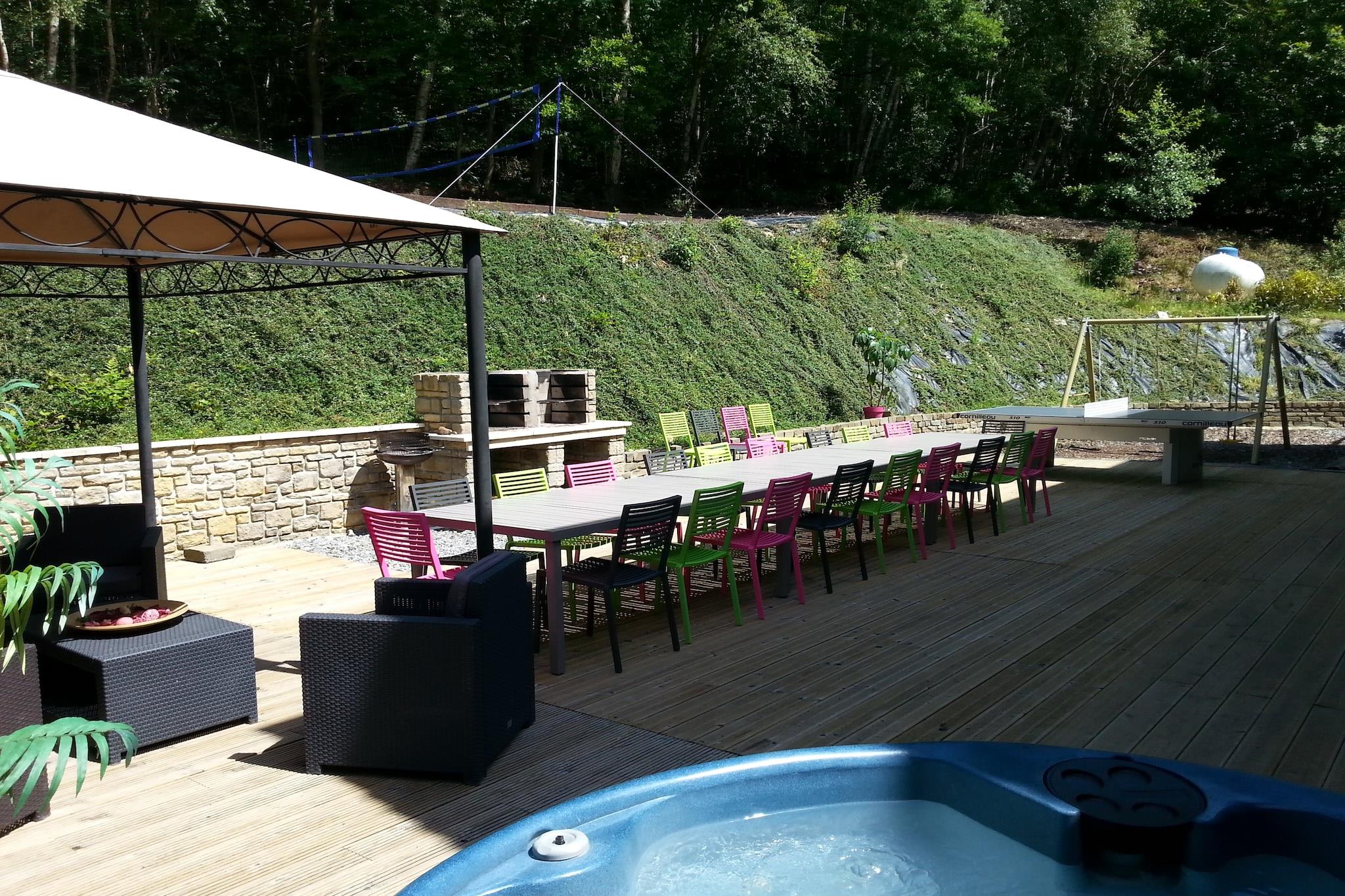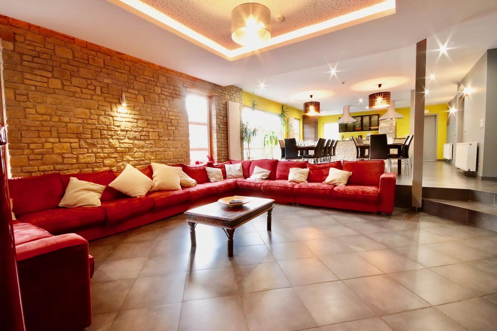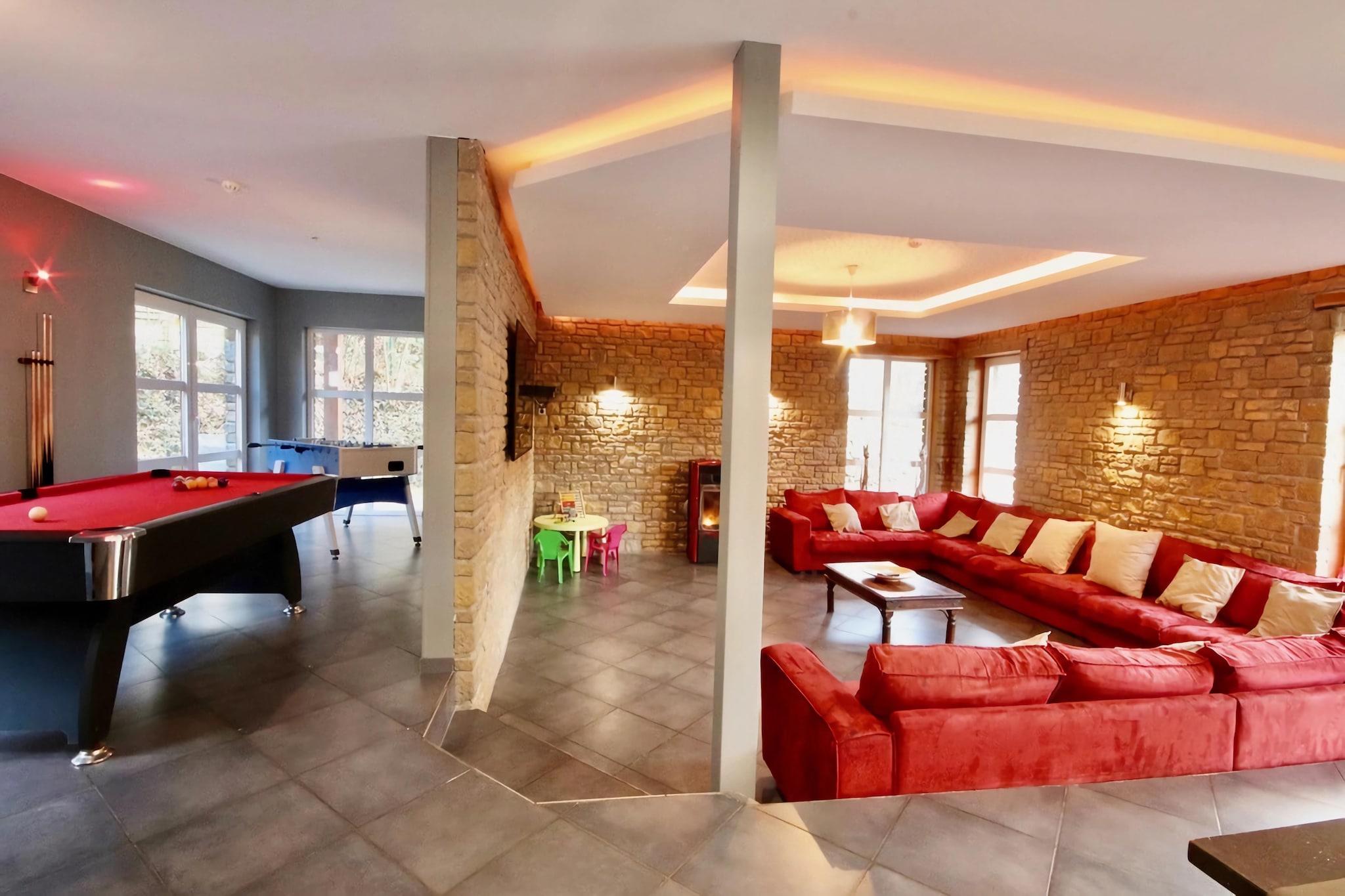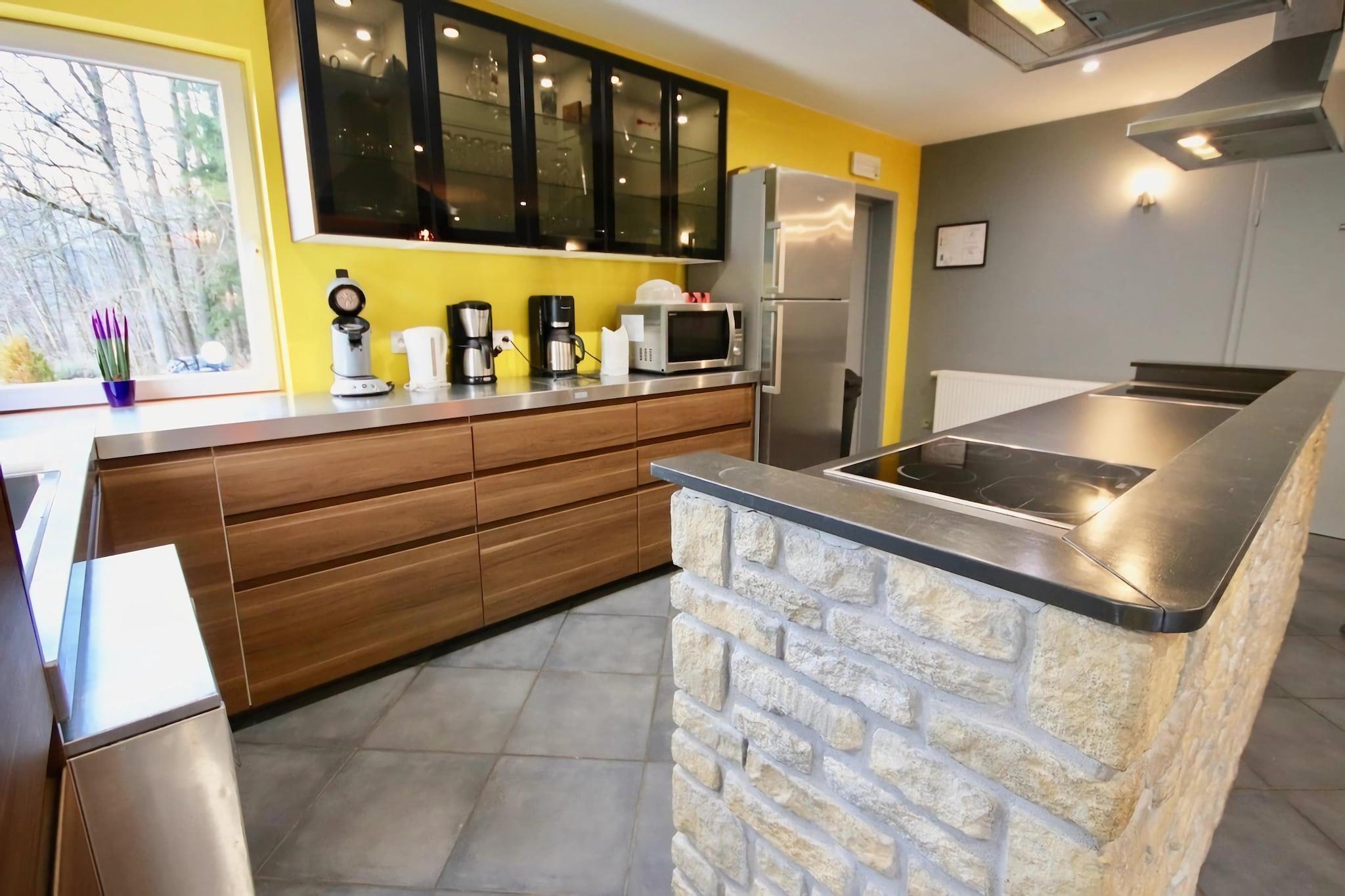 Dette er et luksuriøst kæledyrsvenligt 7-værelses feriehus i Stoumont til ophold i nærheden af skoven. Det tilbyder en privat sauna og boblebad til at slappe af og en privat swimmingpool til en forfriskende dukkert. Opholdet er perfekt for en gruppe på 24 eller familier med børn. Den smukke beliggenhed har en dejlig skov på 300 m og en flod på 500 m. Den offentlige swimmingpool, skiliften, søen og langrend sikrer mange spændende aktiviteter. Du kan udforske Coo-vandfaldene og byerne Spa og Malmedy. Byens centrum ligger 5 km derfra, mens supermarkedet og restauranterne ligger 1 km derfra. I stuen spisestue er der pilleovn til aften. Til underholdning er der bordfodbold og billard. Du kan tilberede måltider over grillen på terrassen. I den møblerede have kan du nyde solen. Der er børneseng, høj stol, trampolin og legeredskaber til børn. Parkering og plads til 3 husdyr mod betaling er der. Indtjekningstiderne er 16.00 til 18.00, og udtjekningstiderne er 9.00 til 10.00. Bemærk: Vi beder gæster omhyggeligt udfylde gruppesammensætningen, når de foretager en reservation, og være særligt opmærksomme på antallet af voksne, børn og babyer, fordi grupper af personer under 30 år ikke accepteres.
