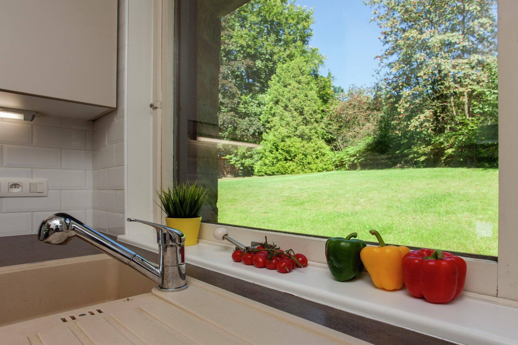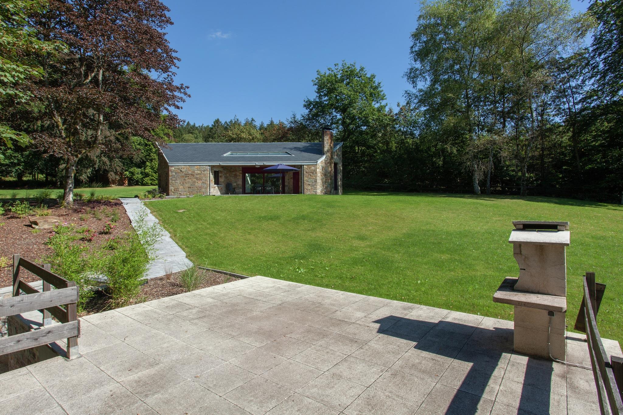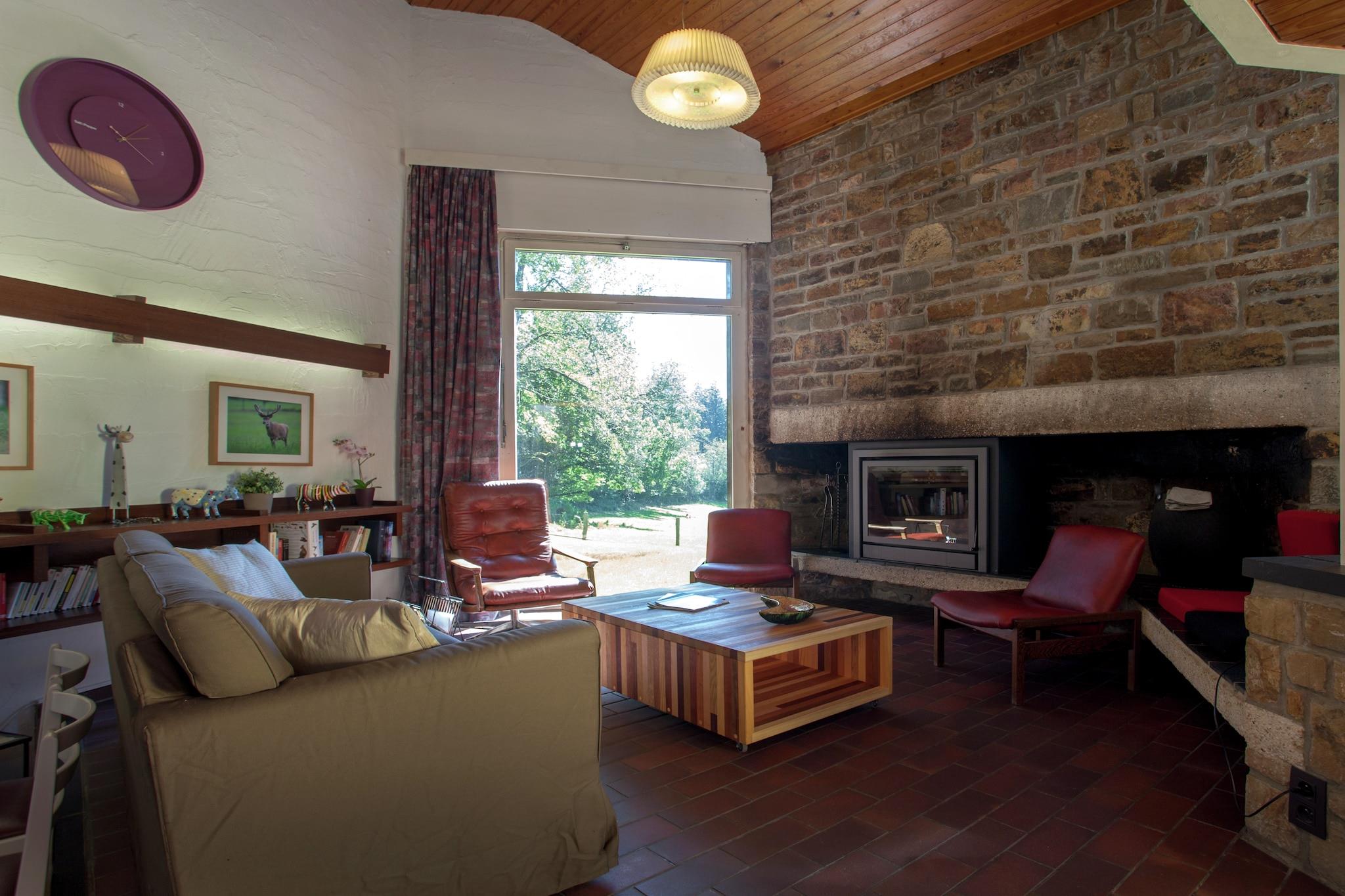 Dette unikke 4-værelses feriehus i Monhouet (Stoumont) er et fredeligt tilflugtssted for op til 7 gæster, designet i slutningen af 1960'erne af den berømte arkitekt Liège. Bygget med naturlige materialer som sandsten, skifer og træ, tilbyder den sekskantede struktur et varmt, lyst interiør med panoramaudsigt over haven, skoven og engene. Beliggende i et skovområde er det perfekt for naturelskere, med vandre- og mountainbikestier lige uden for din dør. Skiløjperne, Spa og Francorchamps-kredsløbet er alle inden for rækkevidde. Den sydlige terrasse er ideel til at slikke solen, mens en anden terrasse med grill indbyder til hyggelige aftener udendørs. Indenfor kan du nyde en pejs, moderne køkken og to badeværelser. Boligen indeholder tv, dvd-afspiller, opvaskemaskine og garage. Der er gratis WiFi og en børneseng. En rolig, arkitekttegnet flugt i hjertet af Ardennerne.
