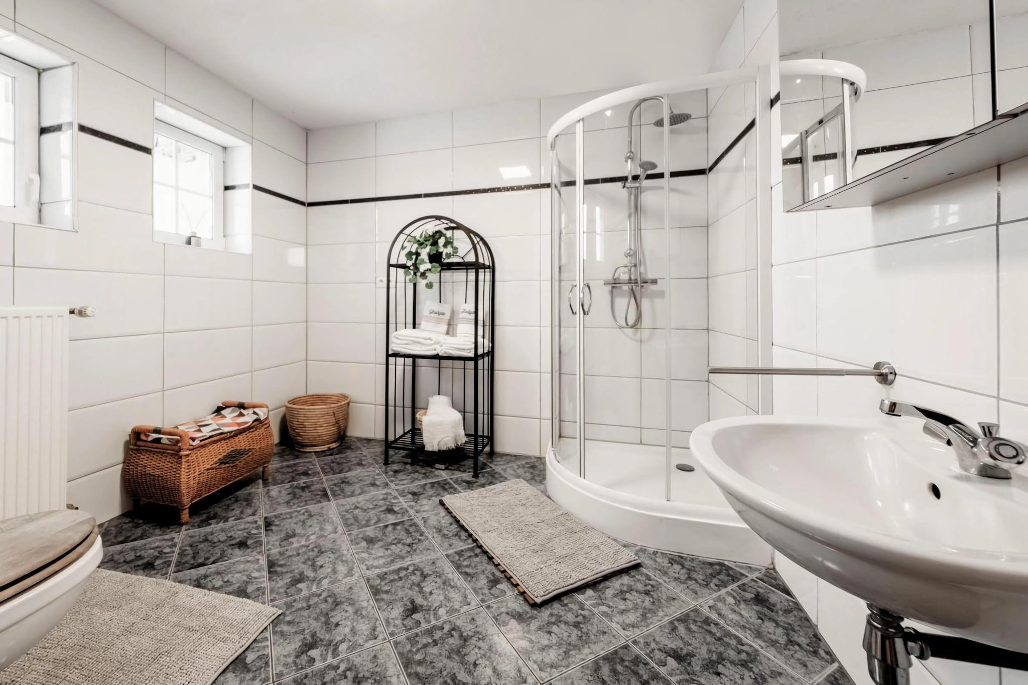 Stueetage: (Stue(dobbeltsovesofa, Fjernsyn), Køkken(spisebord, komfur, kaffemaskine, mikrobølgeovn, opvaskemaskine , køle-fryseskab)) På 1. etage: (soveværelse(dobbeltseng, køjeseng), soveværelse(dobbeltseng), badeværelse(bruser, håndvask, toilet)) have, parkering, legeredskaber