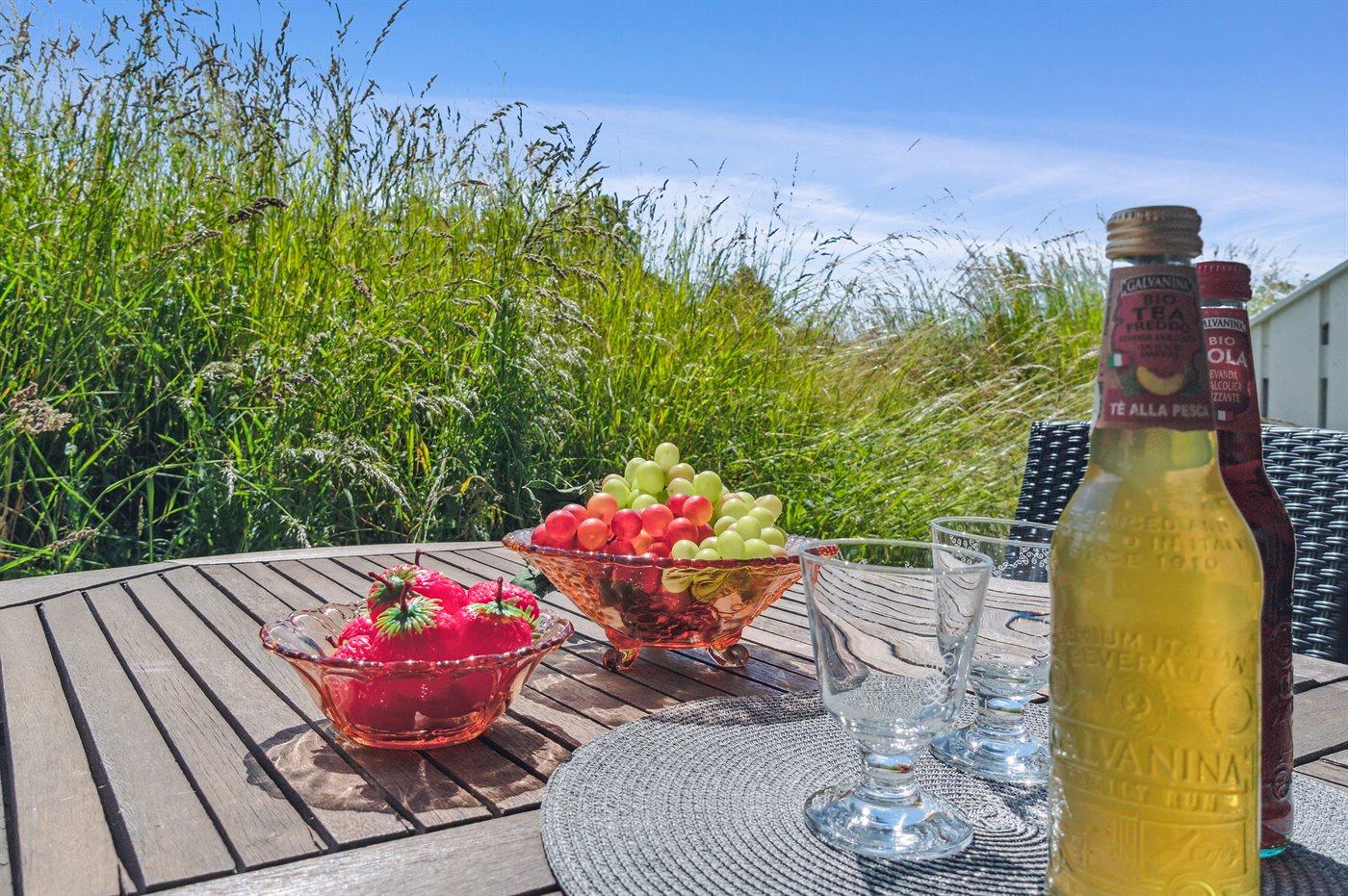Fra den lyse stue er der direkte udgang til terrassen, der er delvis overdækket. Ferielejligheden er løbende renoveret og senest med ny køkkenafdeling. Pæn møblering og god indretning - endda med to badeværelser, hvoraf det ene byder på badekar.
