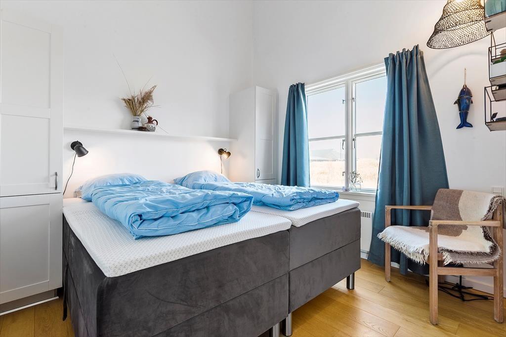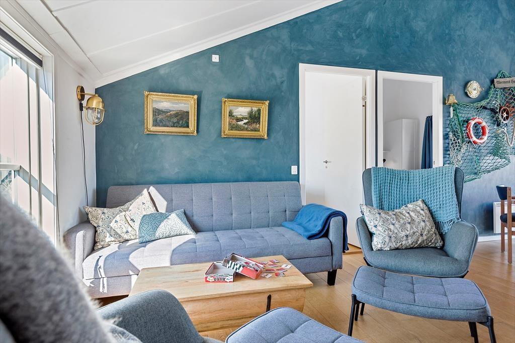 Træd indenfor i en lys og indbydende ferielejlighed, hvor I straks føler jer hjemme. Stuen er hyggeligt indrettet og indbyder til afslappende stunder med en god bog eller et spil fra "husets" samling. Stuen ligger i åben forbindelse med en hyggelig spisekrog og et godt, veludstyret køkken. Lejligheden rummer to skønne soveværelser med dobbeltseng og god opbevaringsplads. På overetagen finder I en dejlig alkove med sovesofa og TV, som familiens store børn vil elske. Badeværelset er pænt og rummeligt med en stor brusekabine.