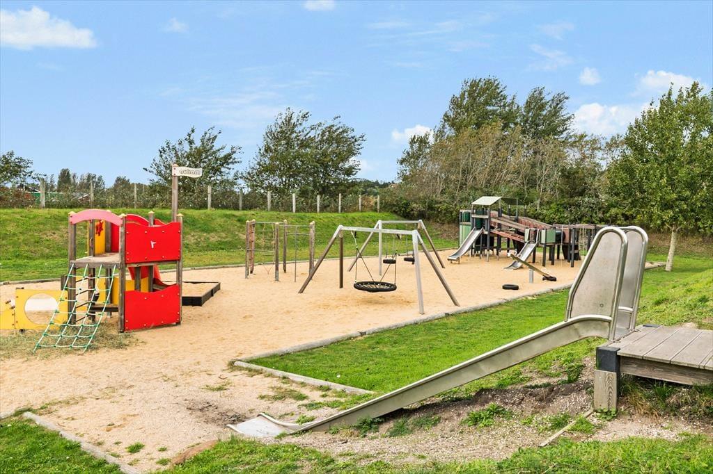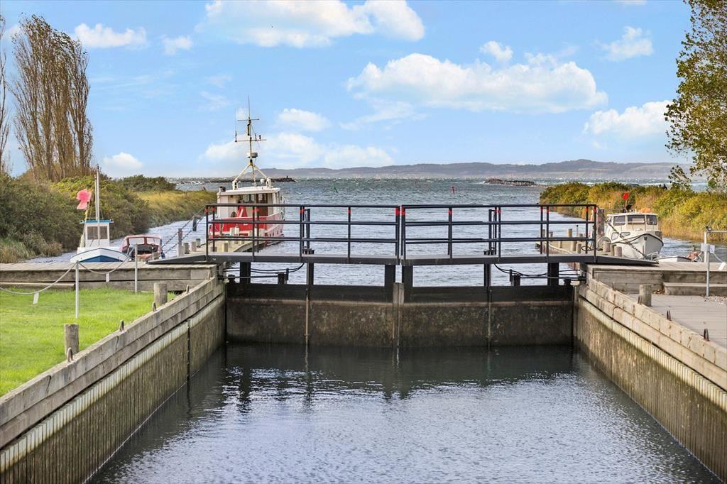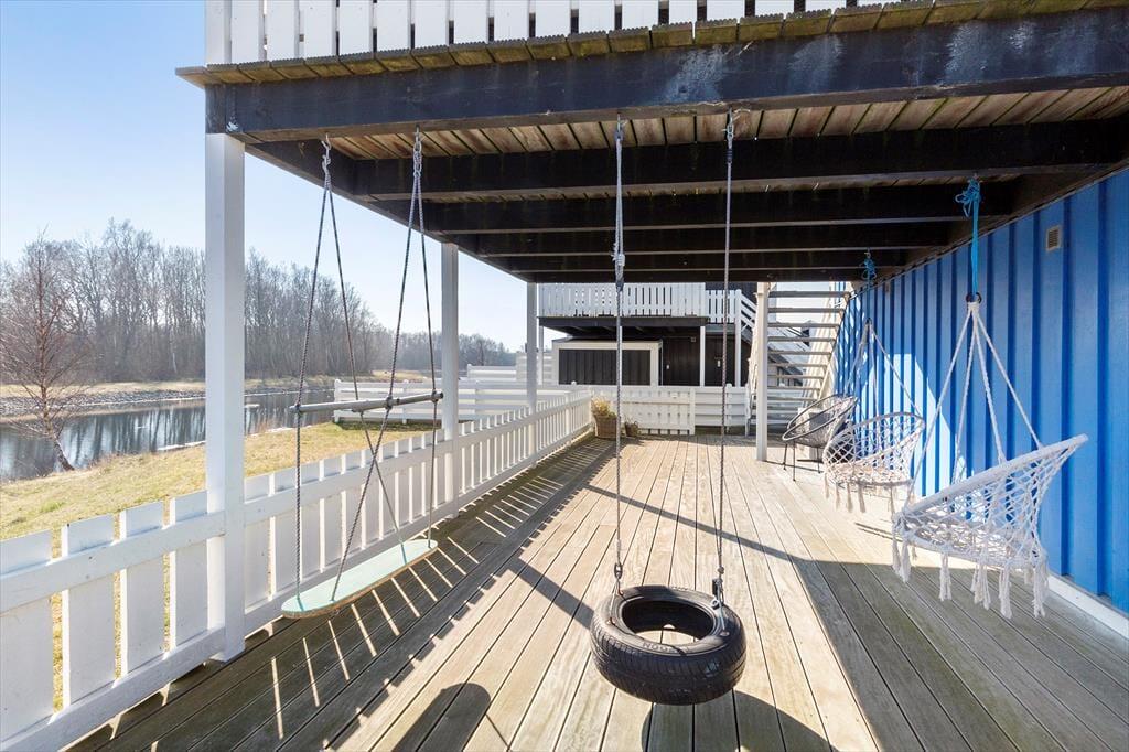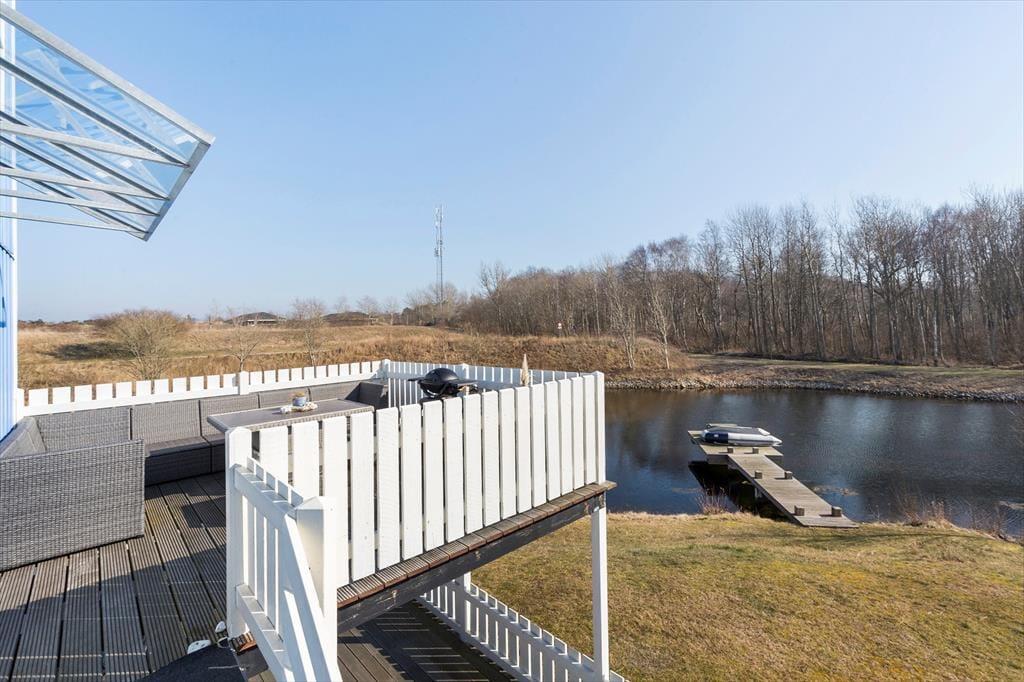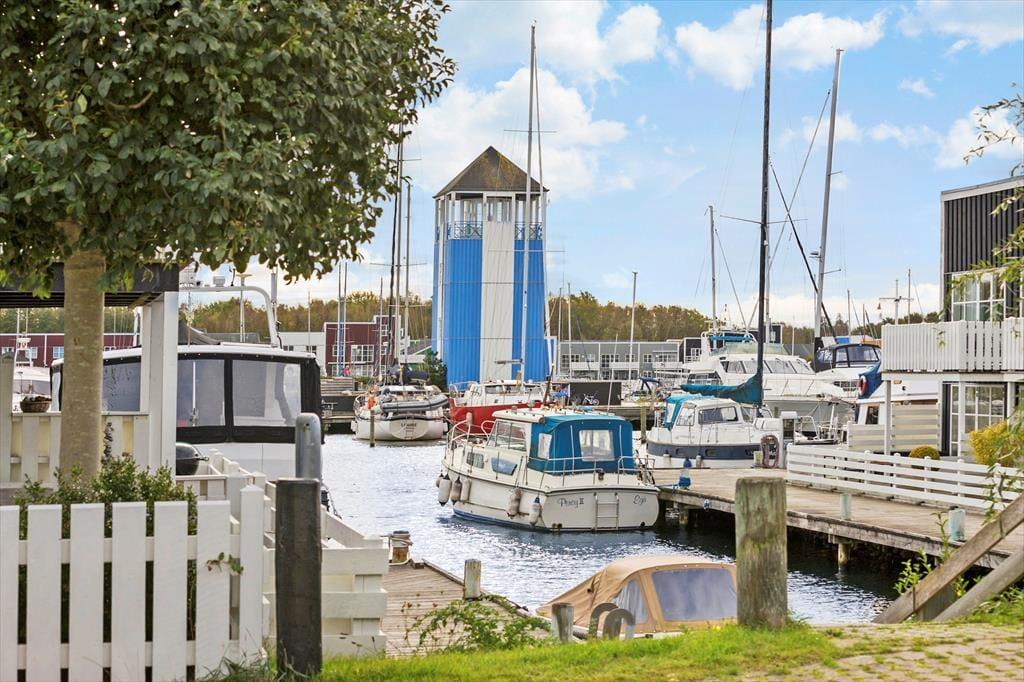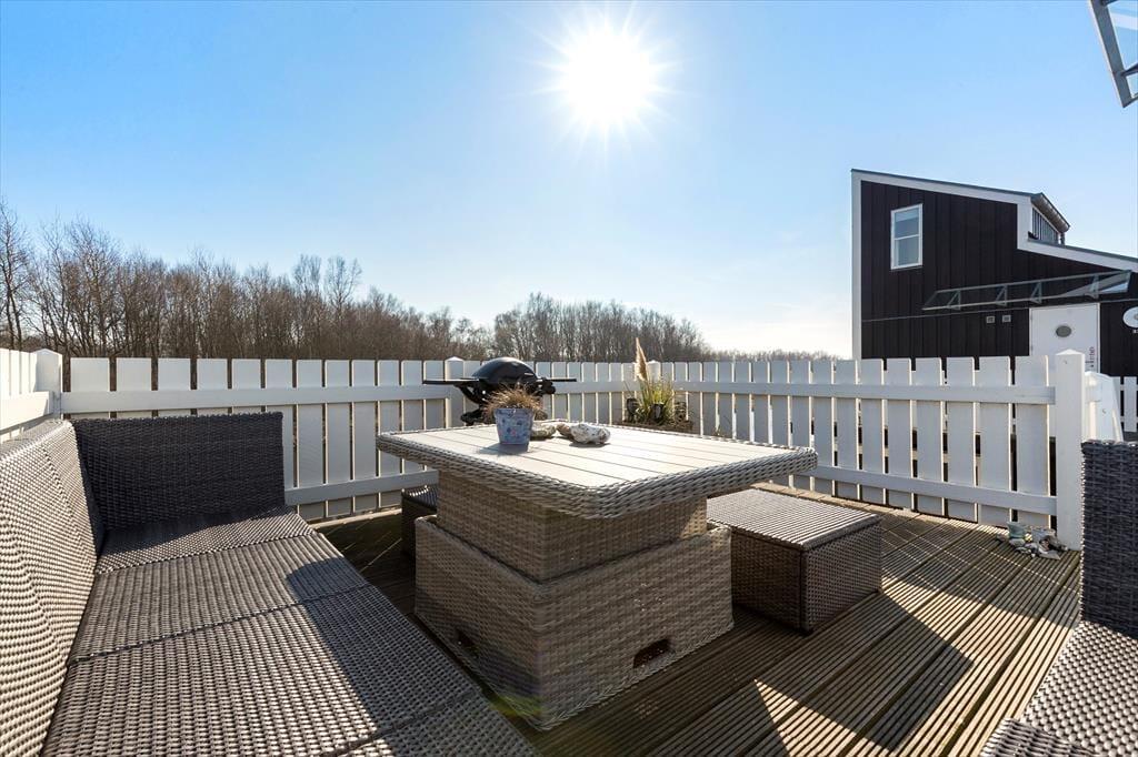 Med to store terrasser er der rig mulighed for at nyde ferien i det fri. Den sydvendte terrasse på 1. sal er indrettet med komfortable møbler og en grill, hvor I kan nyde lange sommeraftener. På terrassen i stueplan kan børnene more sig med gyngen eller slappe af i hængestolene. Ferielejligheden er omgivet af farverige feriehuse og ligger direkte ved kanalen, hvor den hyggelige maritime stemning skaber en helt særlig atmosfære.