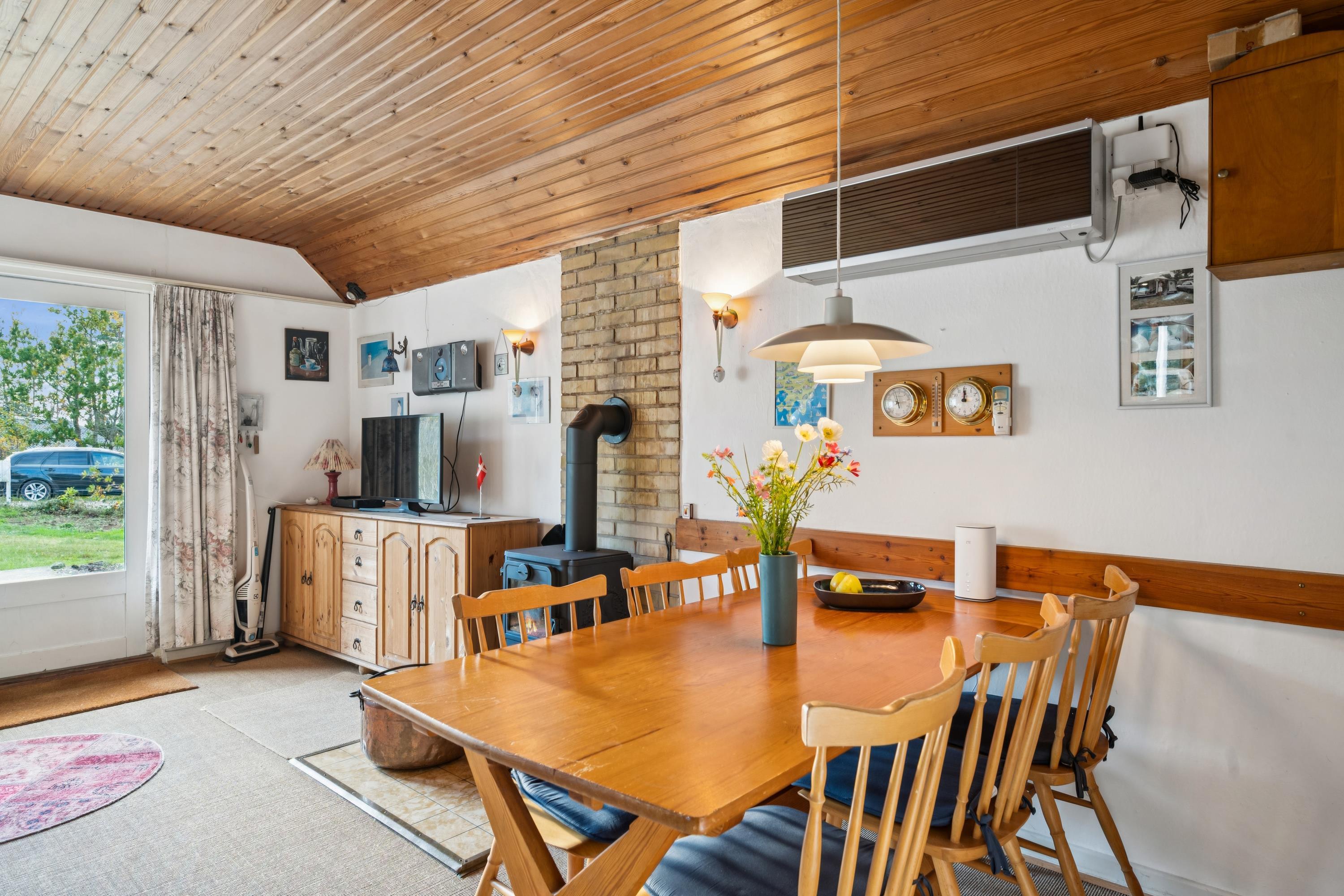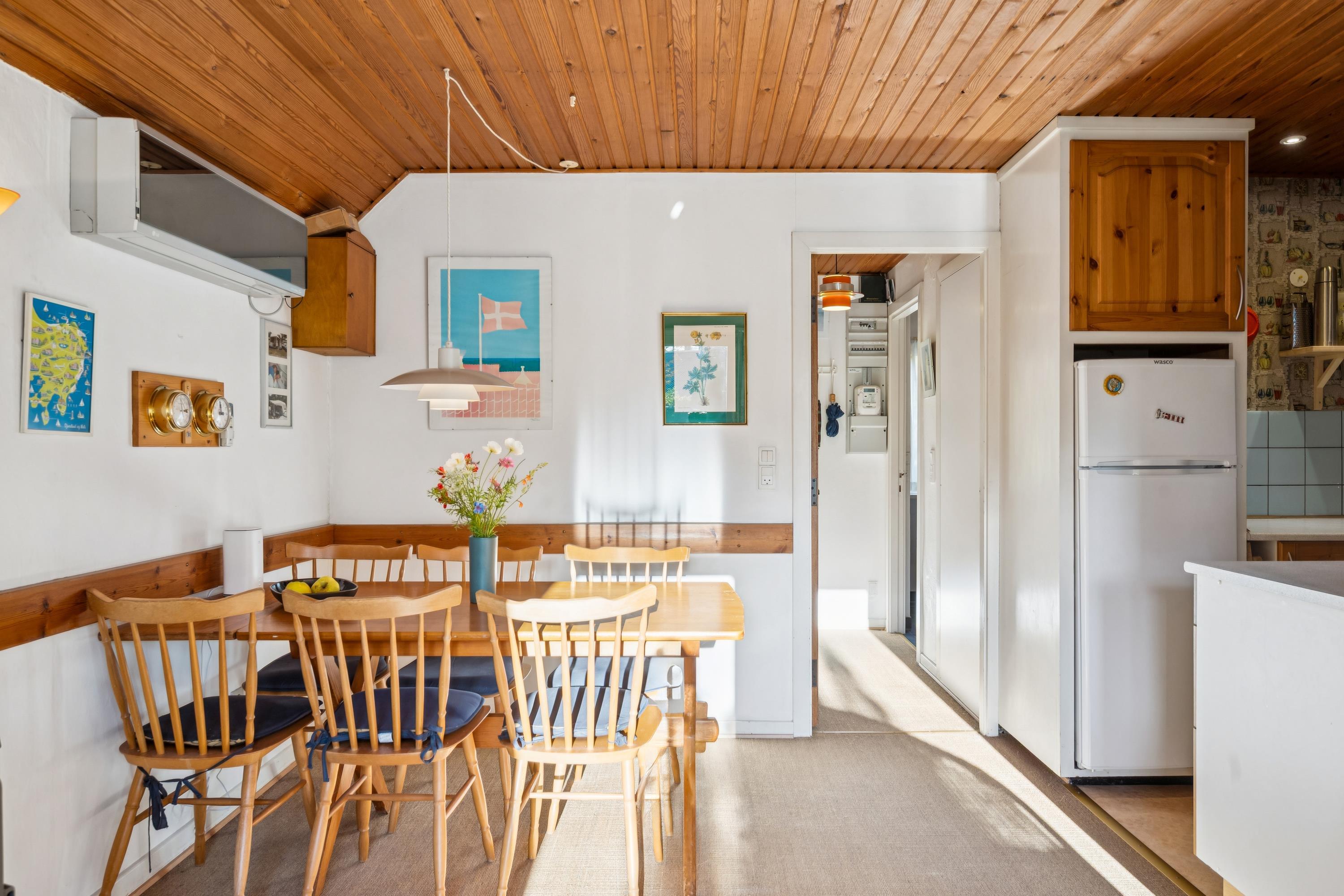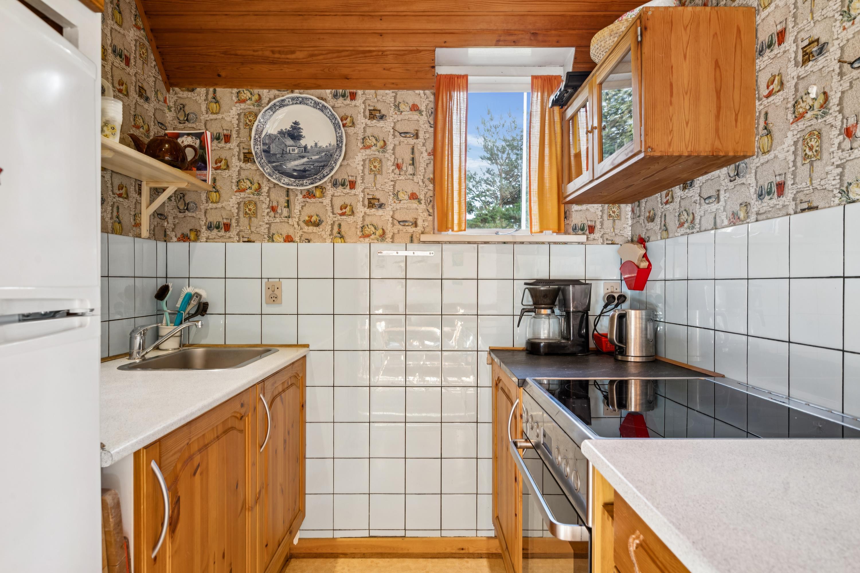 Velkommen til dette lille autentiske retrohus med stråtag. Her har ejeren valgt at beholde det originale look, de fleste steder, dog med nogle nutidige tiltag. Her finder man en lille hyggelig stue med brændeovn og varmepumpe som let kan opvarme det hele. I forbindelse med stuen ligger det lille køkken med original køkkentapet og hvor opvasken foregår med håndkraft. Soveværelse med en god dobbeltseng samt et nyere badeværelse med bruseniche, gulvvarme og vaskemaskine samt et babybadekar og puslepude. Husets sidste to sovepladser finder man i et nyere anneks med to enkeltsenge og som opvarmes med en el radiator. Til de små feriegæster er der høj barnestol og barneseng. Udendørs er der en hyggelig terrasse med havemøbler og til de små feriegæster er der en sandkasse. Der er en stor græsplæne, velegnet til leg og udendørs hygge. Hvis der skal grilles, henstilles der til, at det bliver på græsplænen og ikke på terrassen af hensyn til husets stråtag og brandfare.