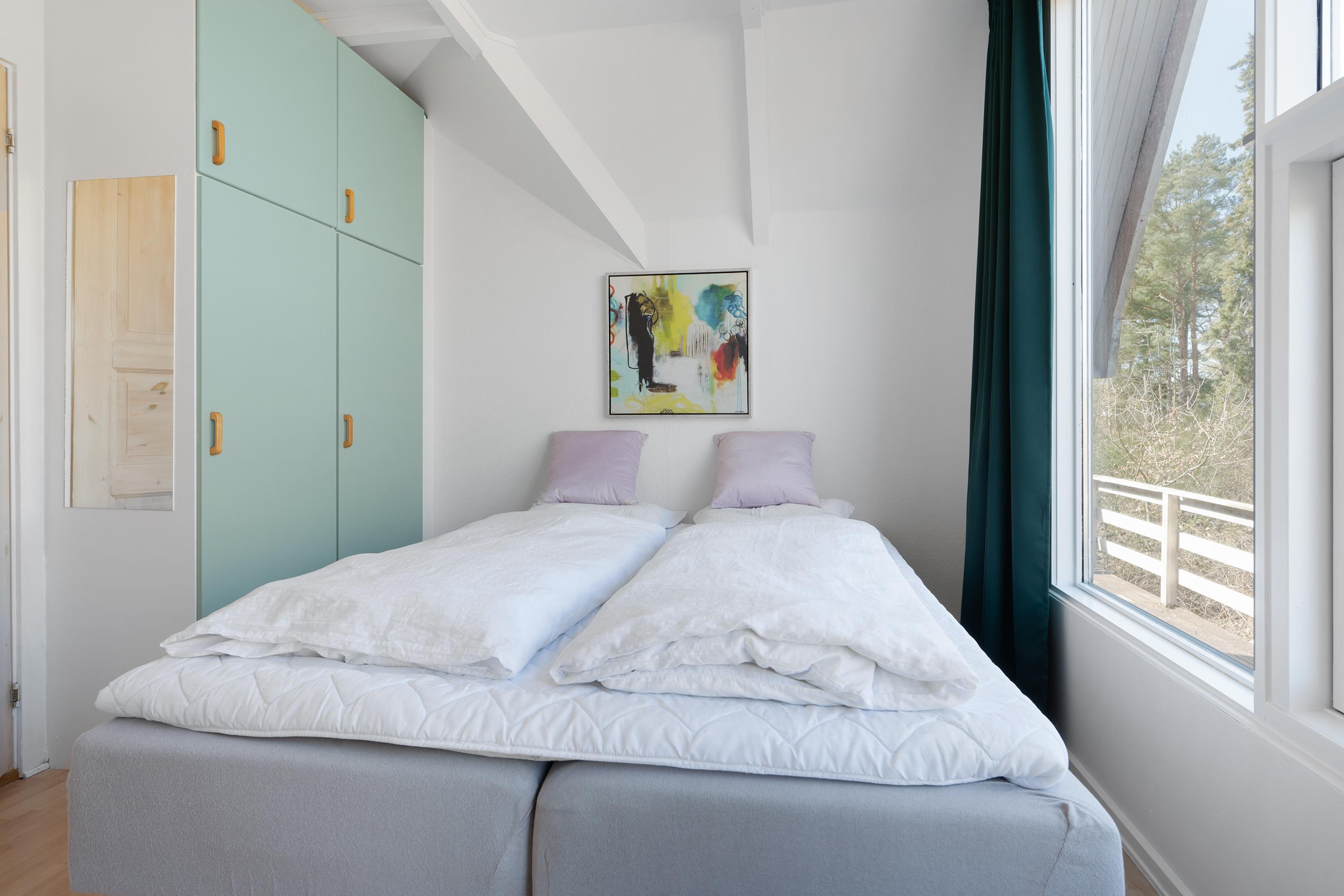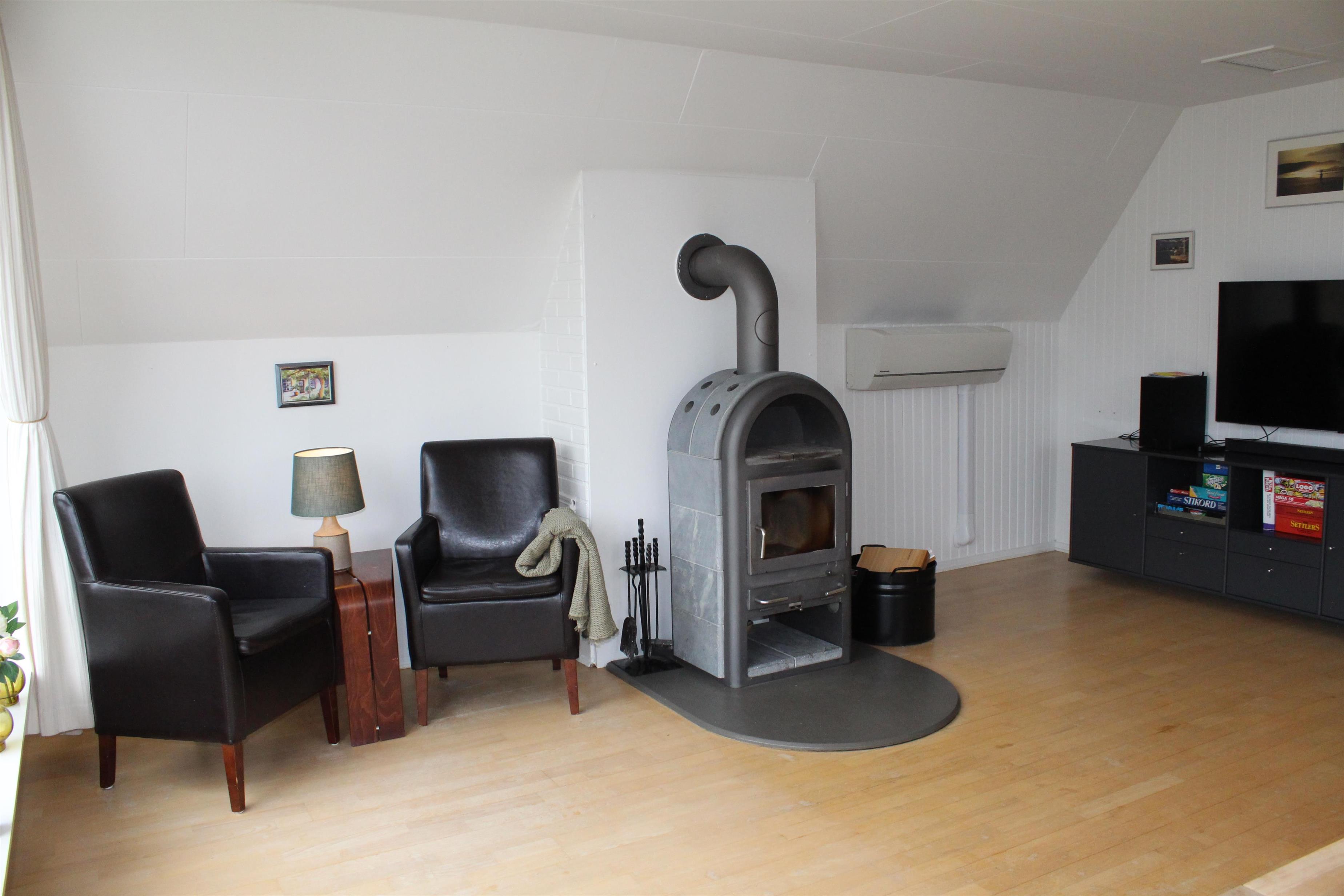 Stor, lys og velindrettet stue med udgang til terrasse. Hyggeligt sofamøblement, brændeovn, TV med danske (inkl. TV2) og tyske kanaler samt radio. Det rummelige og veludstyrede køkken med synlige loftsbjælker har god spiseplads til 6 personer, komfur med keramiske kogeplader og ovn, køleskab, opvaskemaskine og mikrobølgeovn samt udgang til stor, hævet terrasse. I stueplan er der desuden 1 rummeligt soveværelse med dobbeltseng, mens 1. sal har 2 værelser med lofter til kip, begge med 2 enkeltsenge, i alt 6 sovepladser. Nyere, lyst og godt badeværelse med bruseniche, skabsarrangement og vaskemaskine foruden et gæstetoilet, begge i stueetagen. Der er internetadgang.