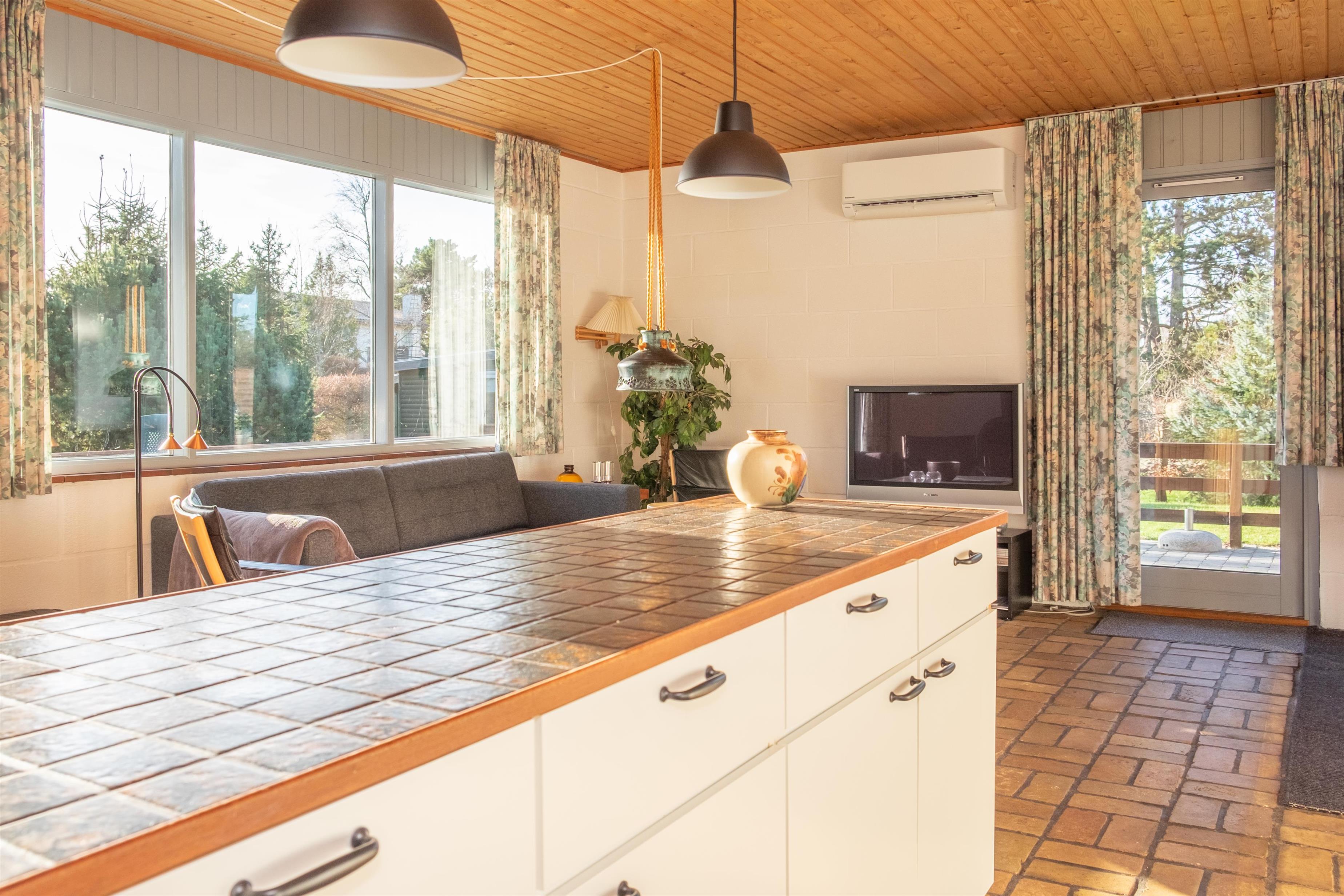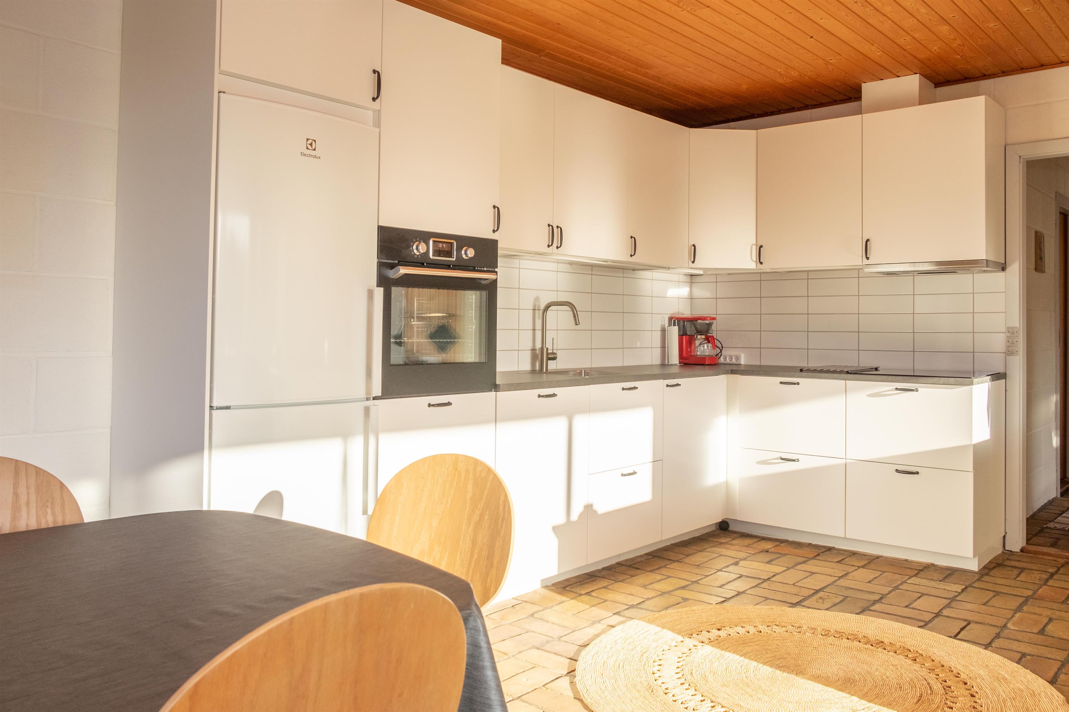 Den lyse stue i åben forbindelse med køkken har klinkegulv, brændeovn, spiseafdeling til 6 personer, sofamøblement med gode lænestole, TV med danske (inkl. TV2) og tyske kanaler samt DVD-afspiller. Dejligt, nyt køkken med god arbejdsplads, keramiske kogeplader, indbygningsovn, køle-/fryseskab og opvaskemaskine. Huset rummer 2 store, lyse soveværelser med dobbeltseng, det ene med udgang til terrasse, samt 1 lidt mindre værelse med dobbeltseng, i alt 6 sovepladser. Godt, nyere flisebadeværelse med gulvvarme, bruseniche, vaskemaskine og tørretumbler. Huset har varmepumpe med aircondition. Der er barnestol til de mindste. Internetadgang.