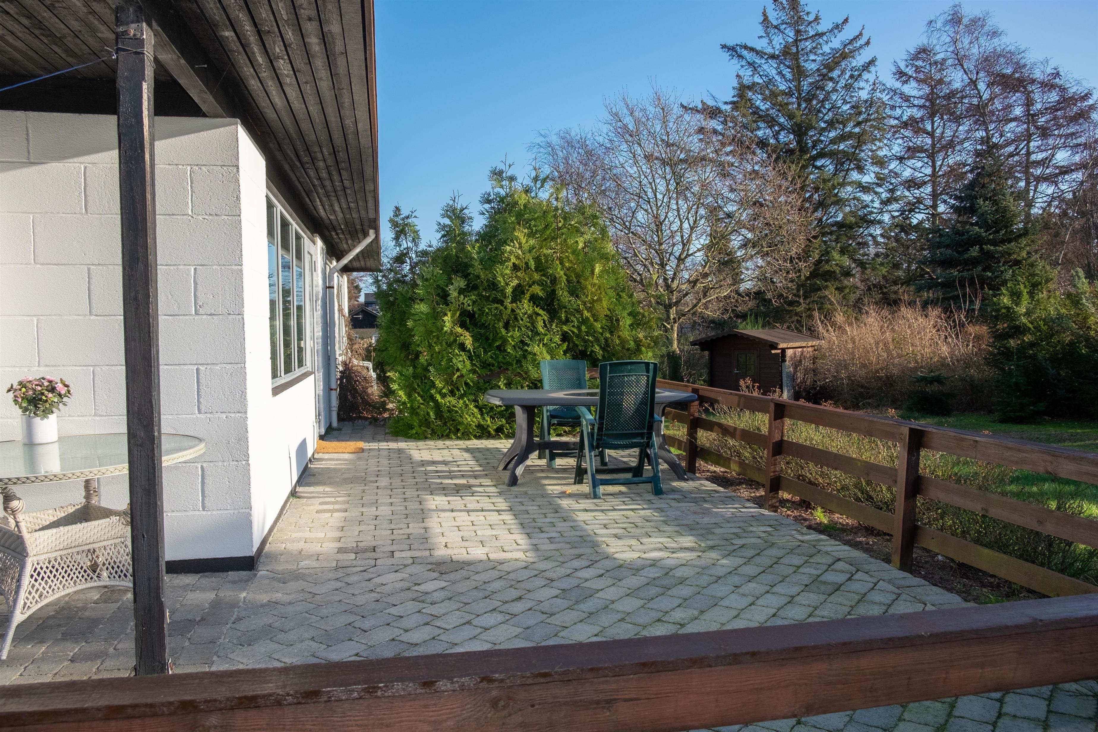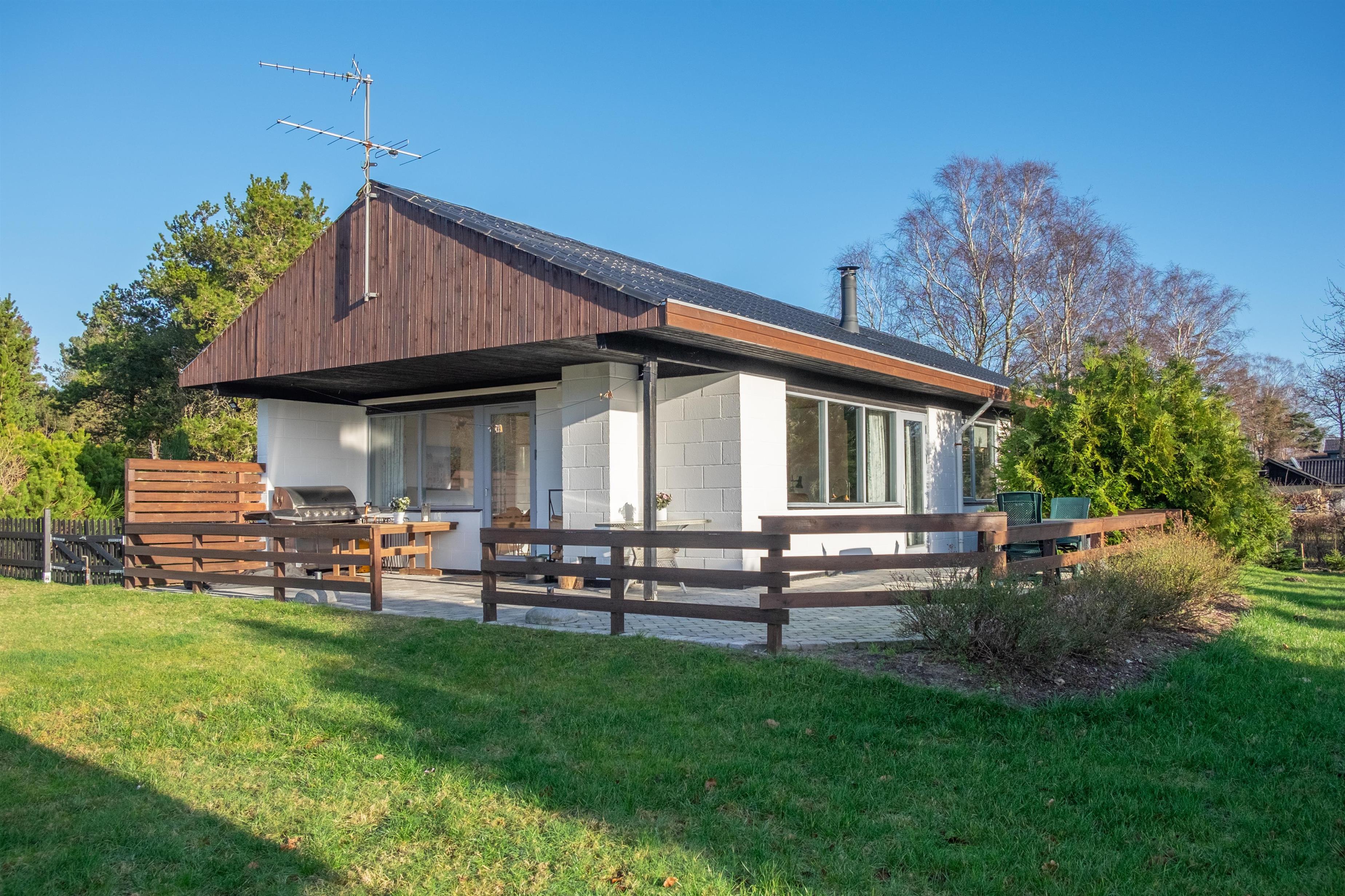 Hyggeligt og veludstyret feriehus i Lærkelunden nær Øer Strand med stor terrasse, brændeovn og moderne faciliteter.