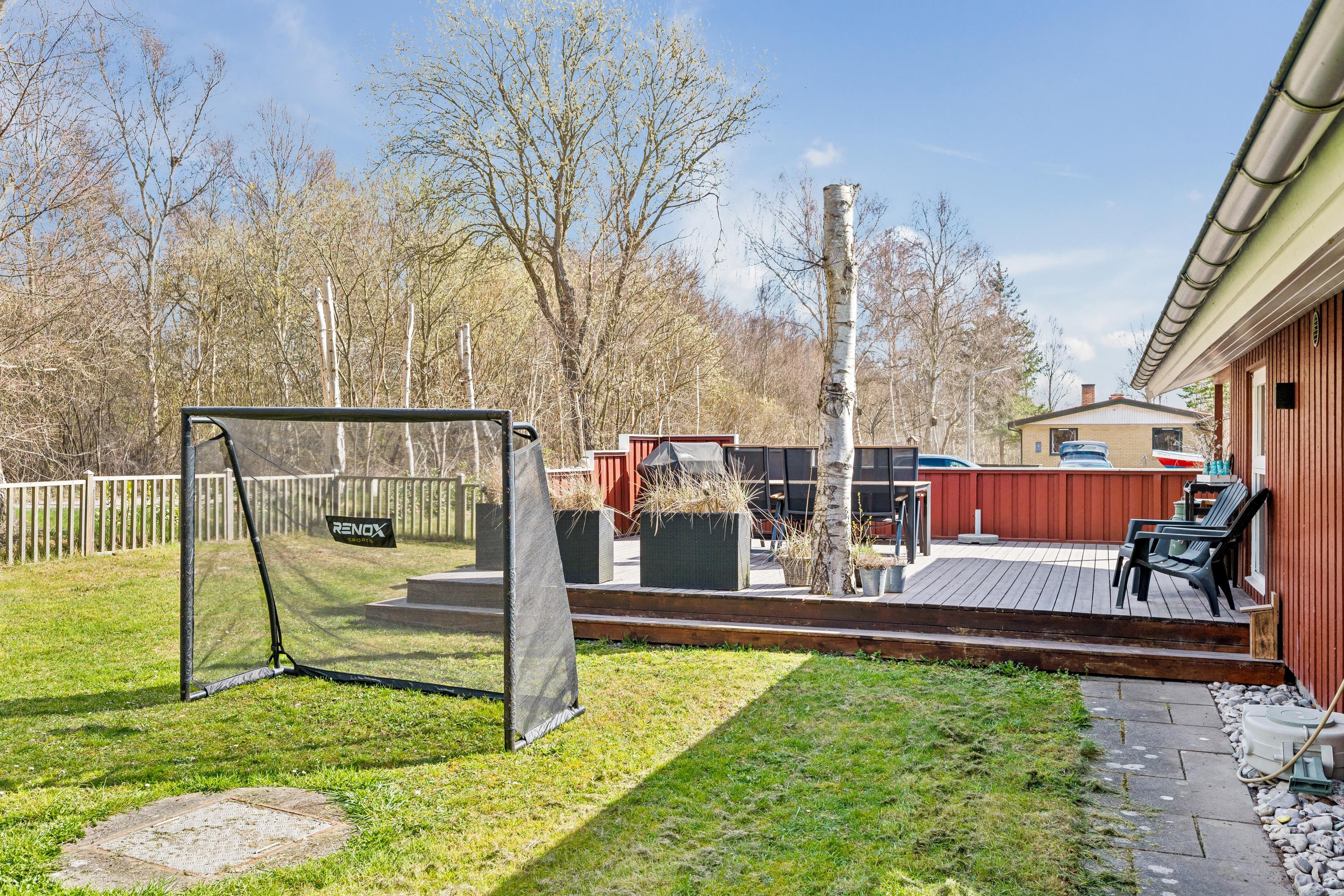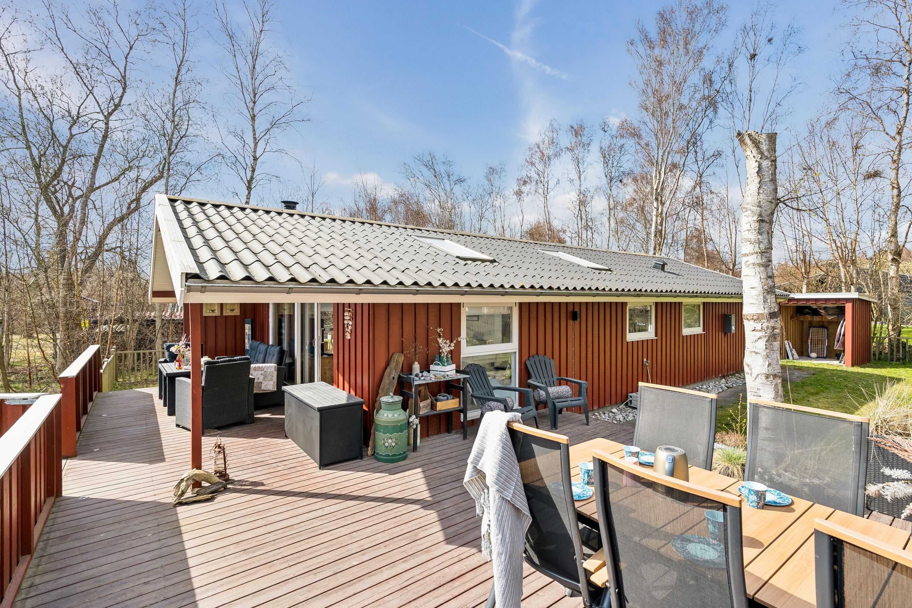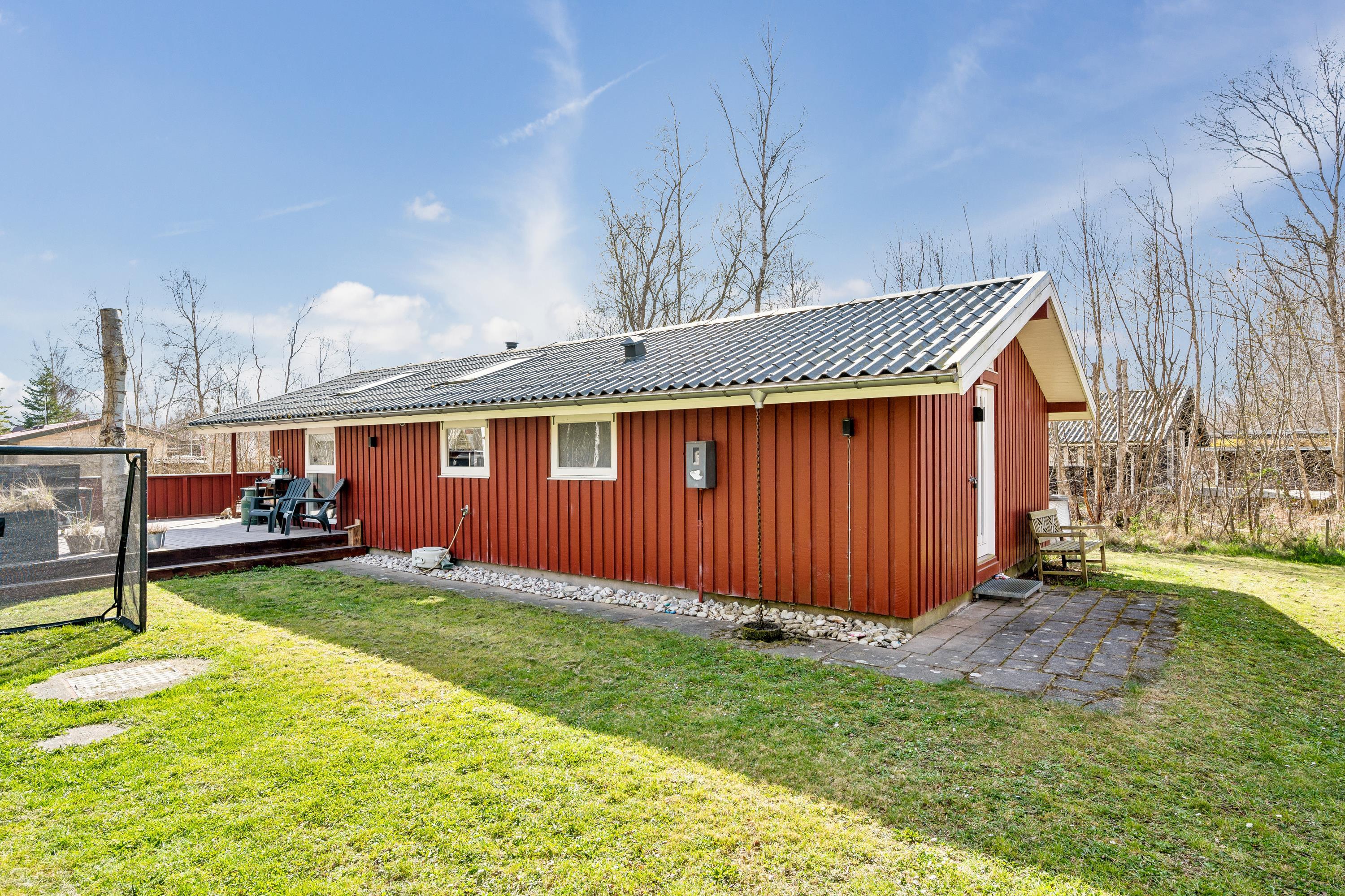 Allerede når man åbner døren og træder ind i entreen, fornemmer man den ægte sommerhusstemning, der er i dette hus. Her finder man en velindrettet og rigtig hyggelig stue med gode møbler og med varmepumpe og brændeovn. Fra stuen er der udgang til en dejlig overdækket terrasse med loungemøbler samt til en stor åben terrasse – også med havemøbler og grill. I forbindelse med stuen finder man den hyggelige køkkenafdeling med b.la. opvaskemaskine og god spiseplads. Husets sovepladser finder man i tre hyggelige værelser, heraf et værelse med dobbeltseng, et værelse med to enkeltsenge og et værelse med en enkelt seng. Flot badeværelse med bruseniche. Huset er beliggende på en rigtig skøn grund med stor græsplæne, velegnet til leg og boldspil. Der er masser af udendørs spil til fri afbenyttelse b.la. kongespil, ærtepose spil m.m. samt gynger, rutschebane og fodboldmål. Et virkelig hyggeligt hus til den lille børnefamilie. Huset ligger i gå-afstand til stranden.