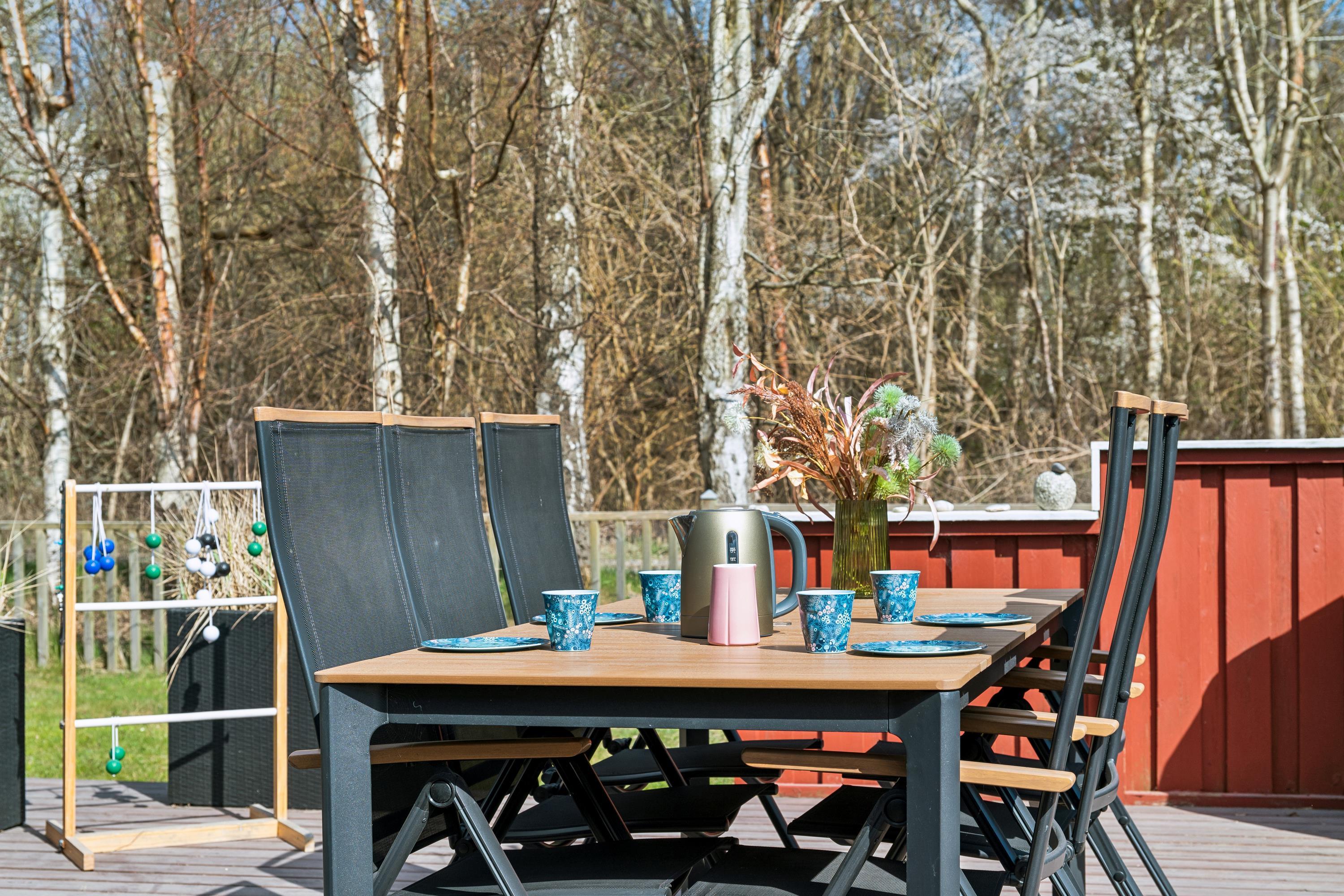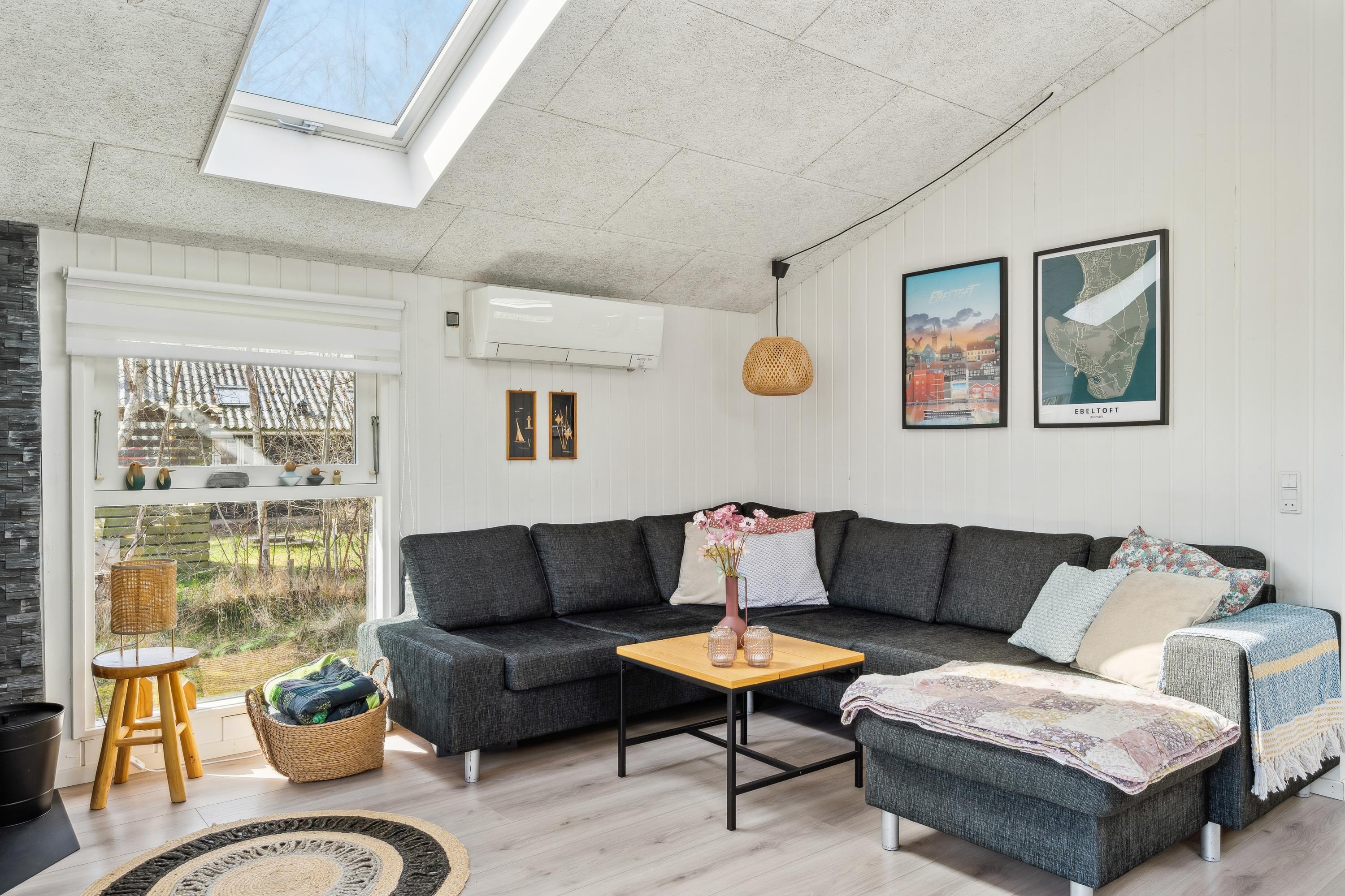 Hyggeligt sommerhus i Øer Strand med terrasse, legeplads og nær strand.