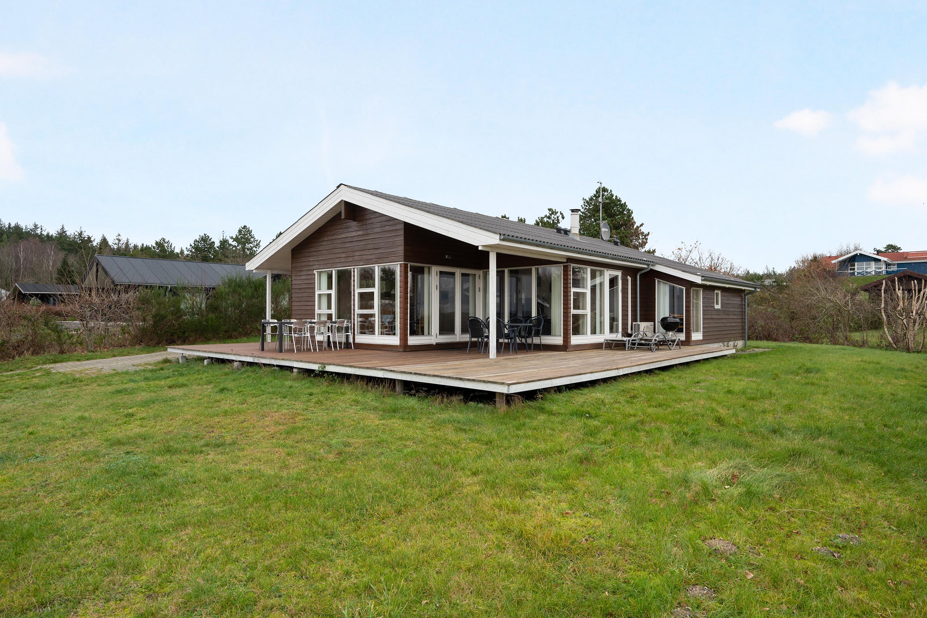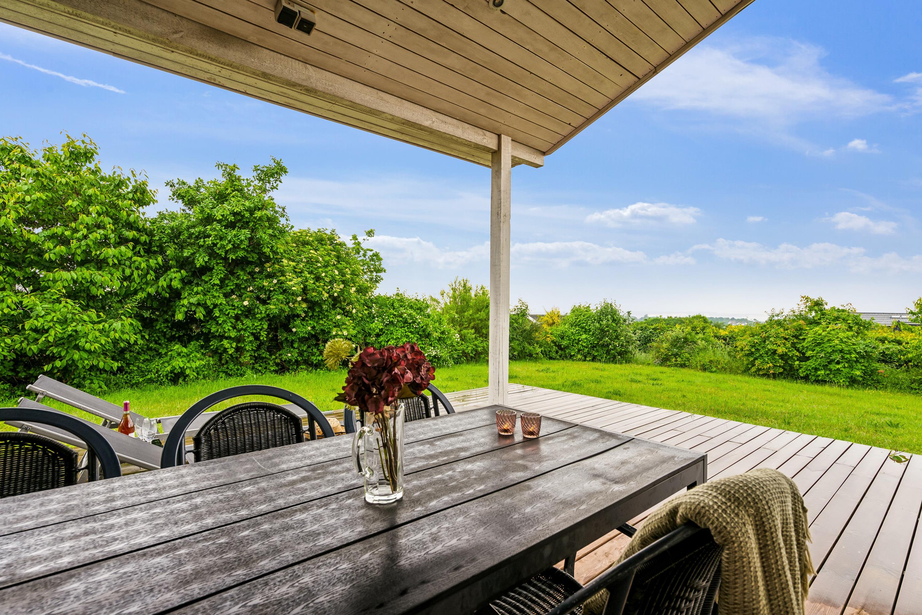 Dette rummelige og velindrettede feriehus med plads til 8 personer ligger på skrånende naturgrund med dejlig udsigt over Kattegat og landskabet ved Øer. Stor, vestvendt og delvist overdækket træterrasse med havemøbler, liggestole, parasol og grill.