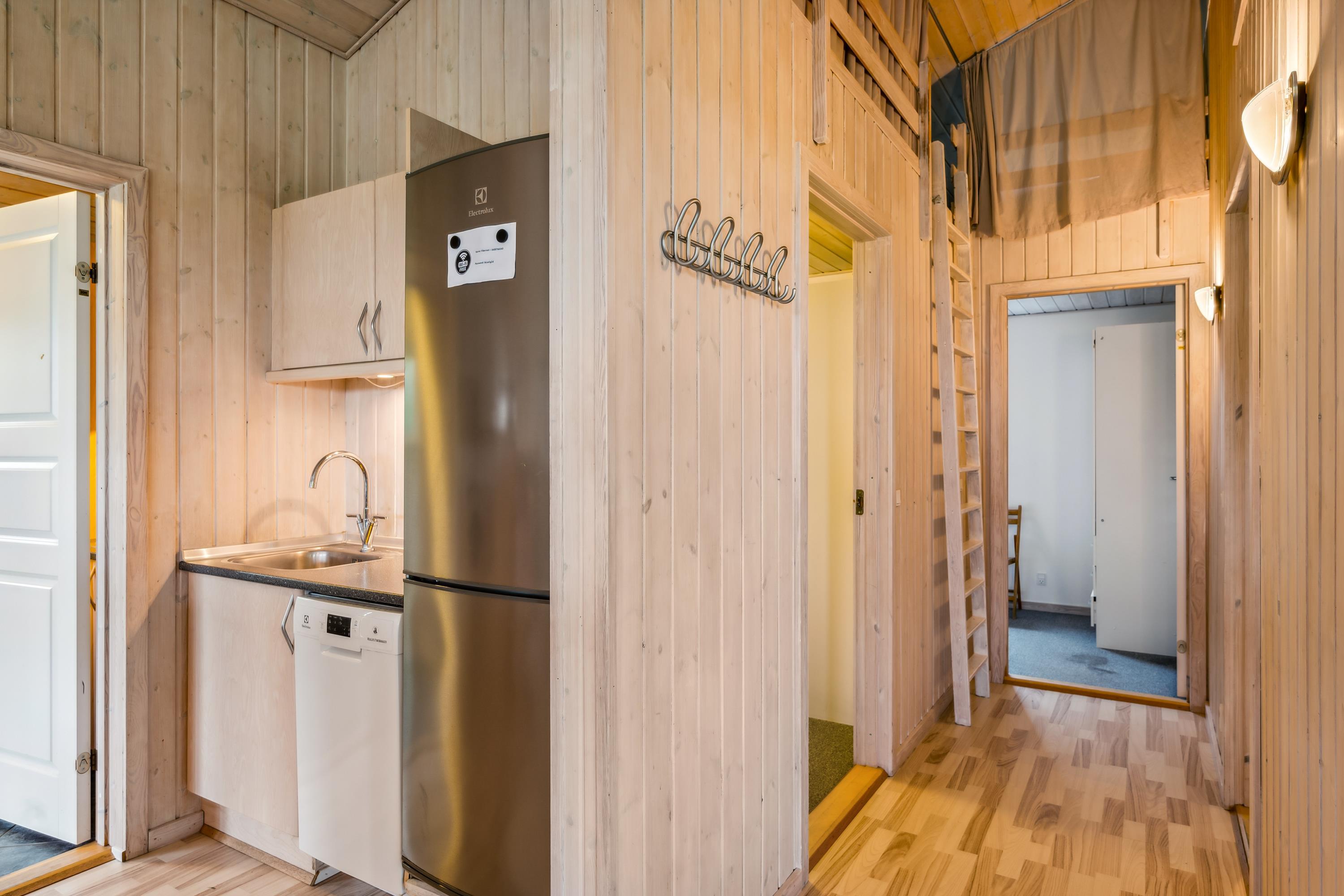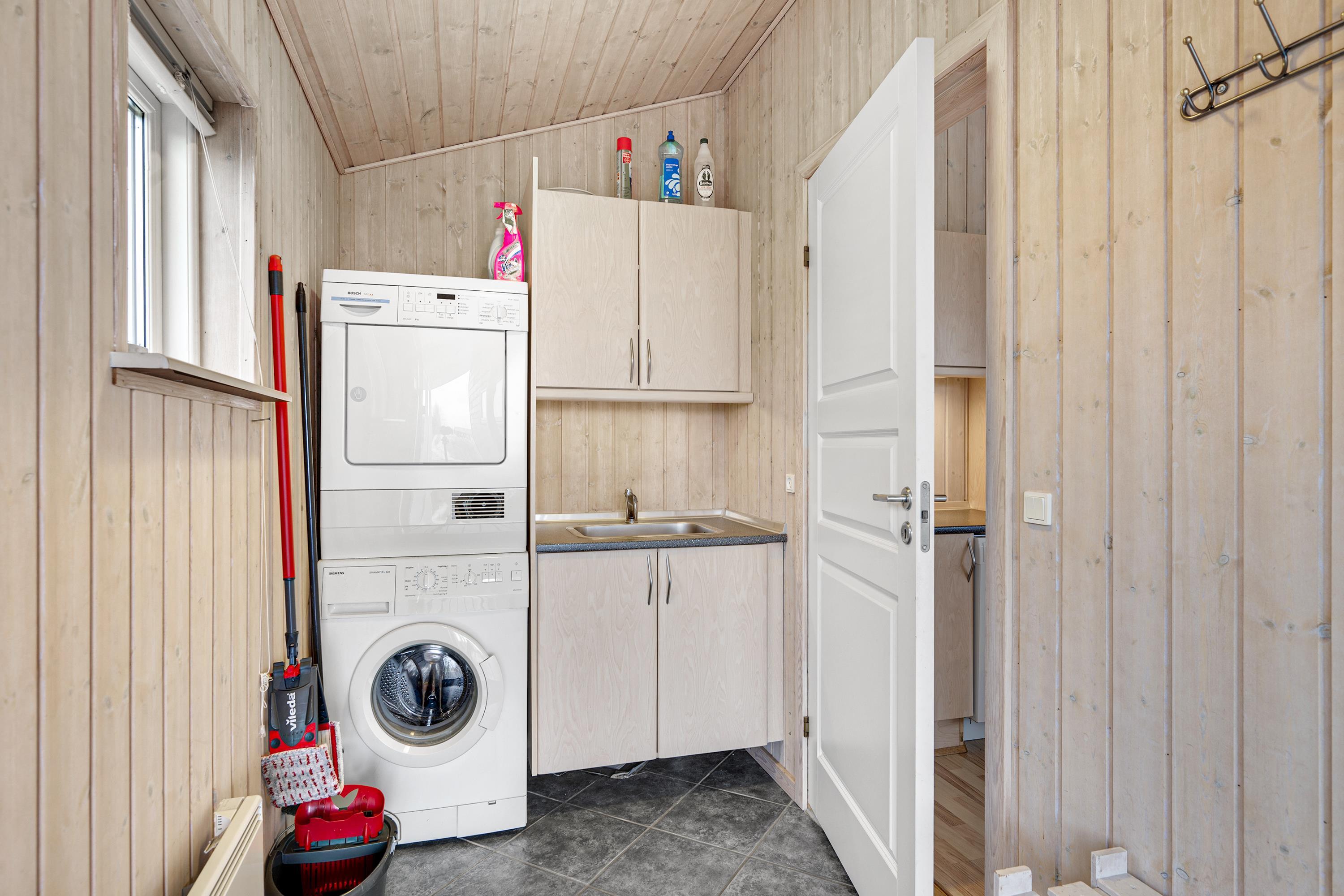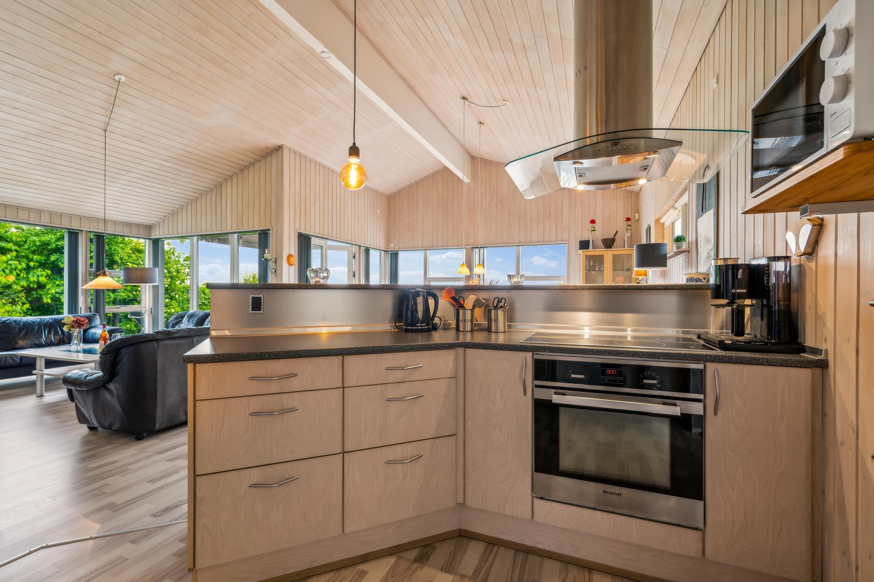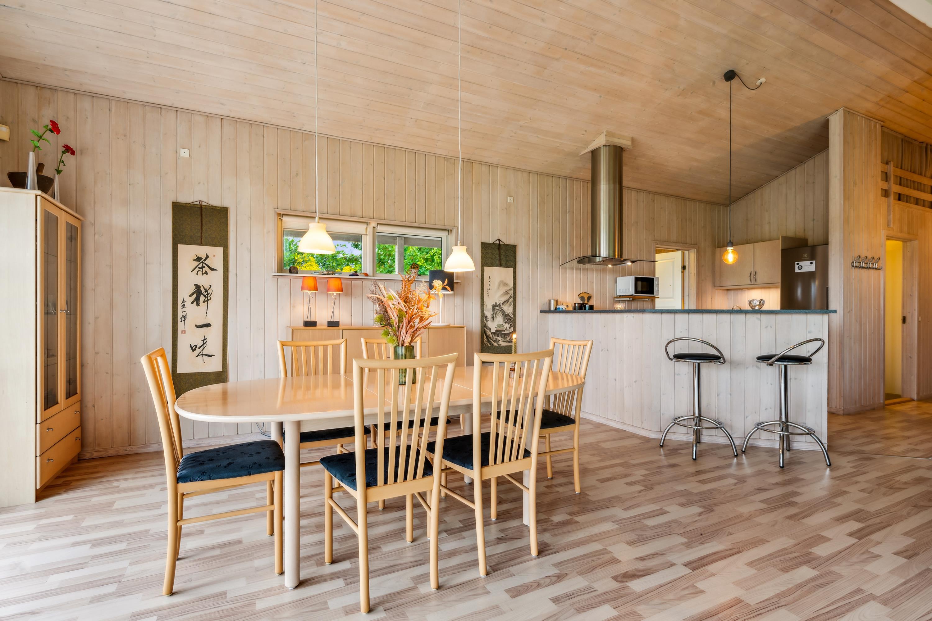 Huset fremstår overalt lyst og venligt med lofter til kip og godt lysindfald. Den store stue med panoramavinduer og udgang til terrasse har brændeovn, komfortabel sofaafdeling, TV med danske (inkl. TV2) samt god spiseplads til 8 personer. I åben forbindelse med stuen ligger godt, nyere køkken med keramiske kogeplader, ovn, køle-/fryseskab, opvaskemaskine og mikrobølgeovn. De 8 sovepladser er fordelt på 2 store værelser med dobbeltseng, 1 mindre værelse med 1 enkeltseng og køjeseng samt stor hems med dobbeltseng og 1 enkeltseng. Dejligt badeværelse med bruseniche, spabad og sauna. Gulvvarme i alle vådrum. I separat rum i forbindelse med køkken forefindes desuden vaskemaskine og tørretumbler. Der er internetadgang.