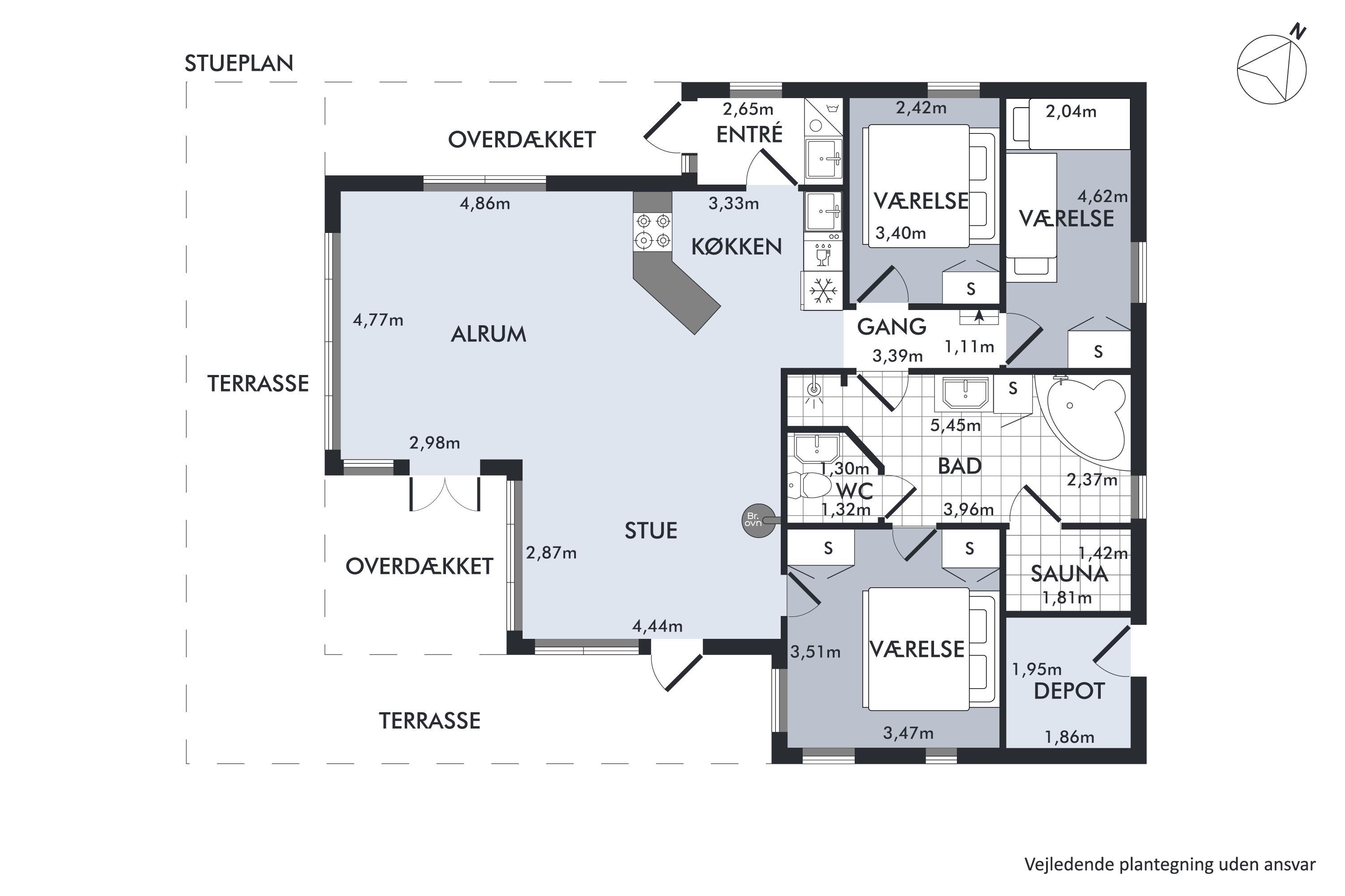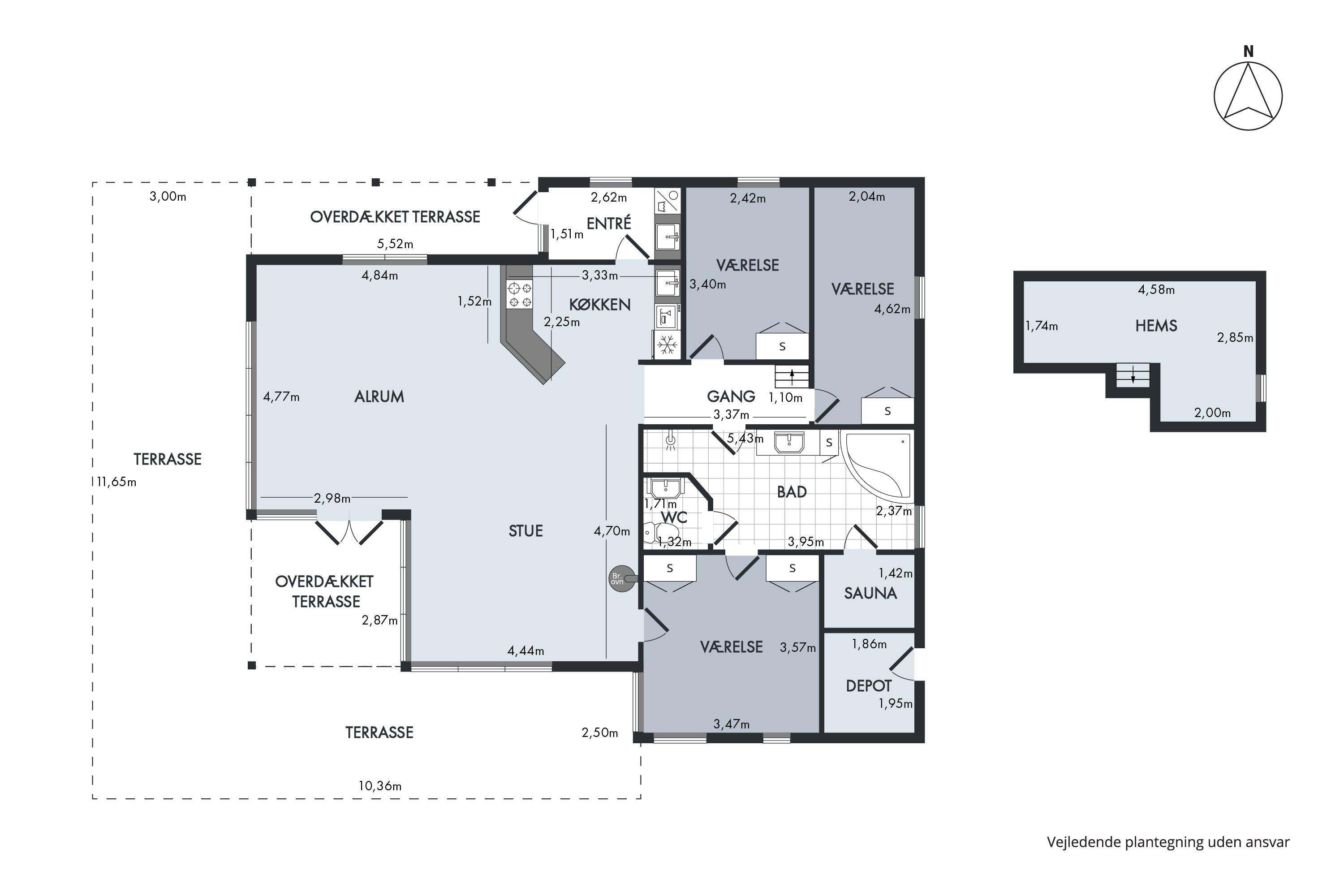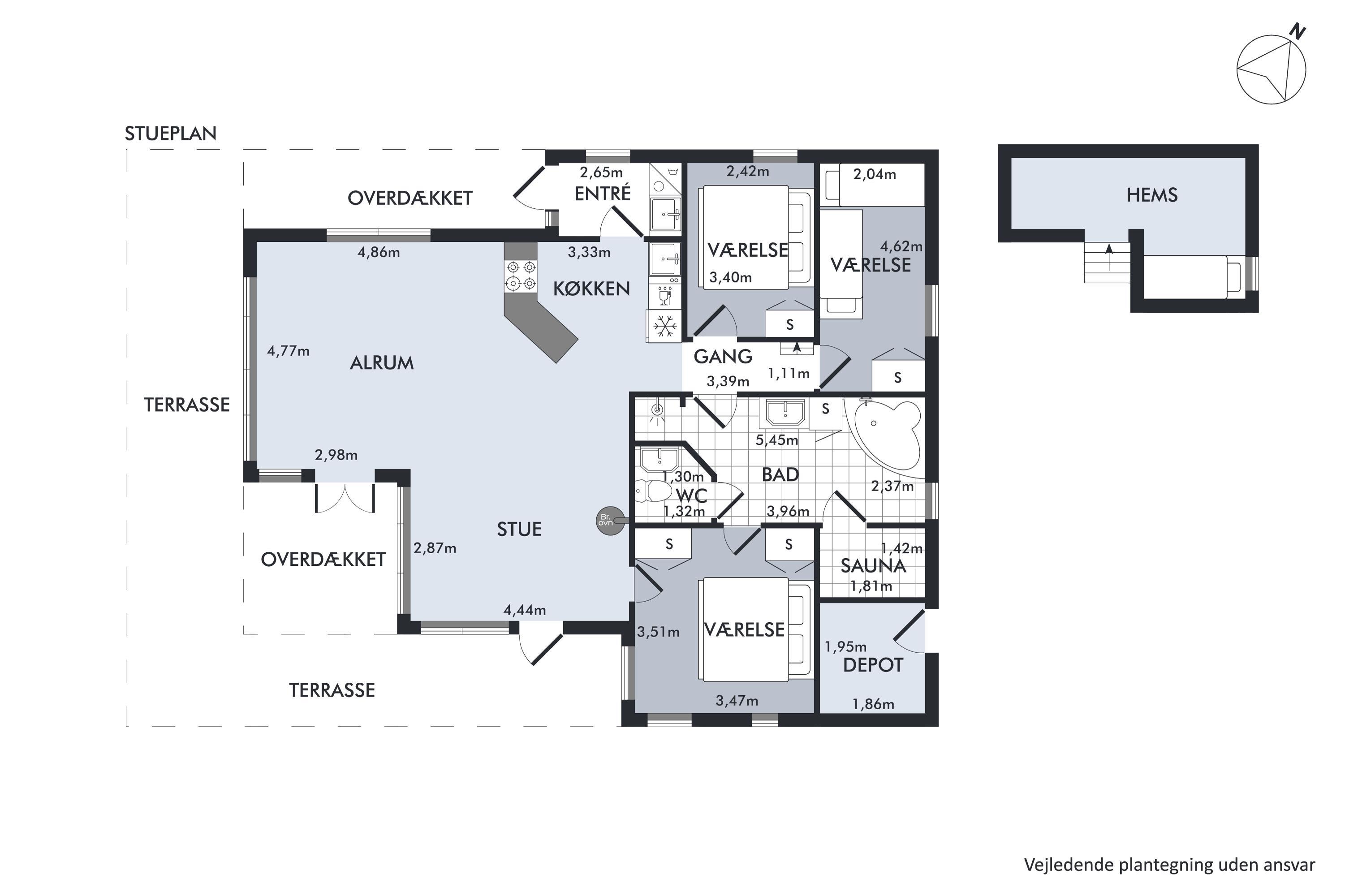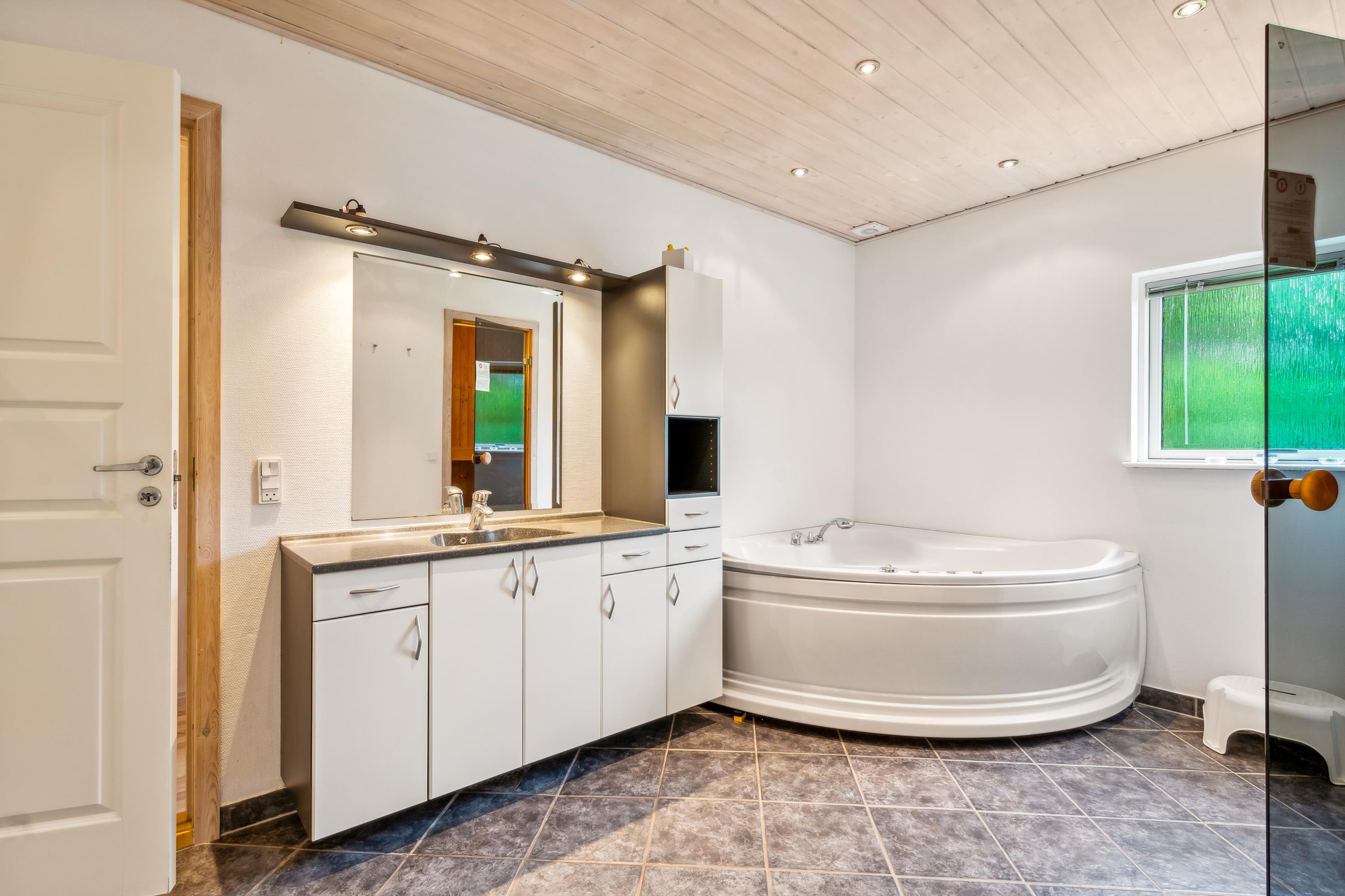 Huset fremstår overalt lyst og venligt med lofter til kip og godt lysindfald. Den store stue med panoramavinduer og udgang til terrasse har brændeovn, komfortabel sofaafdeling, TV med danske (inkl. TV2) samt god spiseplads til 8 personer. I åben forbindelse med stuen ligger godt, nyere køkken med keramiske kogeplader, ovn, køle-/fryseskab, opvaskemaskine og mikrobølgeovn. De 8 sovepladser er fordelt på 2 store værelser med dobbeltseng, 1 mindre værelse med 1 enkeltseng og køjeseng samt stor hems med dobbeltseng og 1 enkeltseng. Dejligt badeværelse med bruseniche, spabad og sauna. Gulvvarme i alle vådrum. I separat rum i forbindelse med køkken forefindes desuden vaskemaskine og tørretumbler. Der er internetadgang.