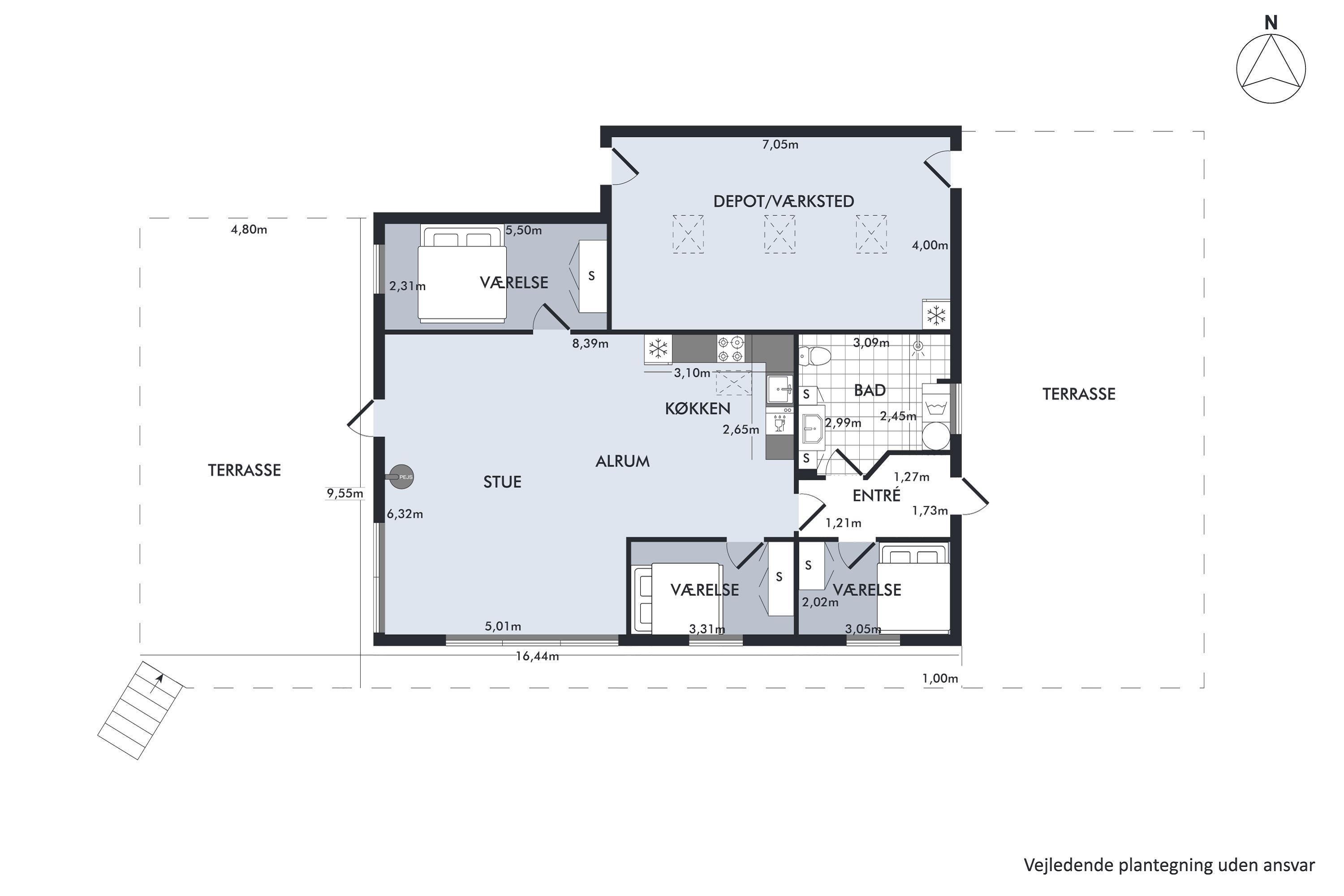 Fra entréen kommer man ind i den store, lyse stue med panoramavinduer og i åben forbindelse med køkken. Her er god spiseplads til 6 personer, brændeovn, komfortabel sofaafdeling, TV med danske (inkl. TV2) og én tysk kanal (ZDF), CD-afspiller og radio. Nyt, dejligt køkken med komfur med keramiske kogeplader og ovn, køle-/fryseskab, opvaskemaskine og mikrobølgeovn. Huset råder over 3 soveværelser, de 2 med indgang fra stuen og 2 med dobbeltseng og 1 værelse med sovesofa , i alt 6 sovepladser. Stort, nyt badeværelse med bruseniche, vaskemaskine og tørretumbler. Der er internetadgang.