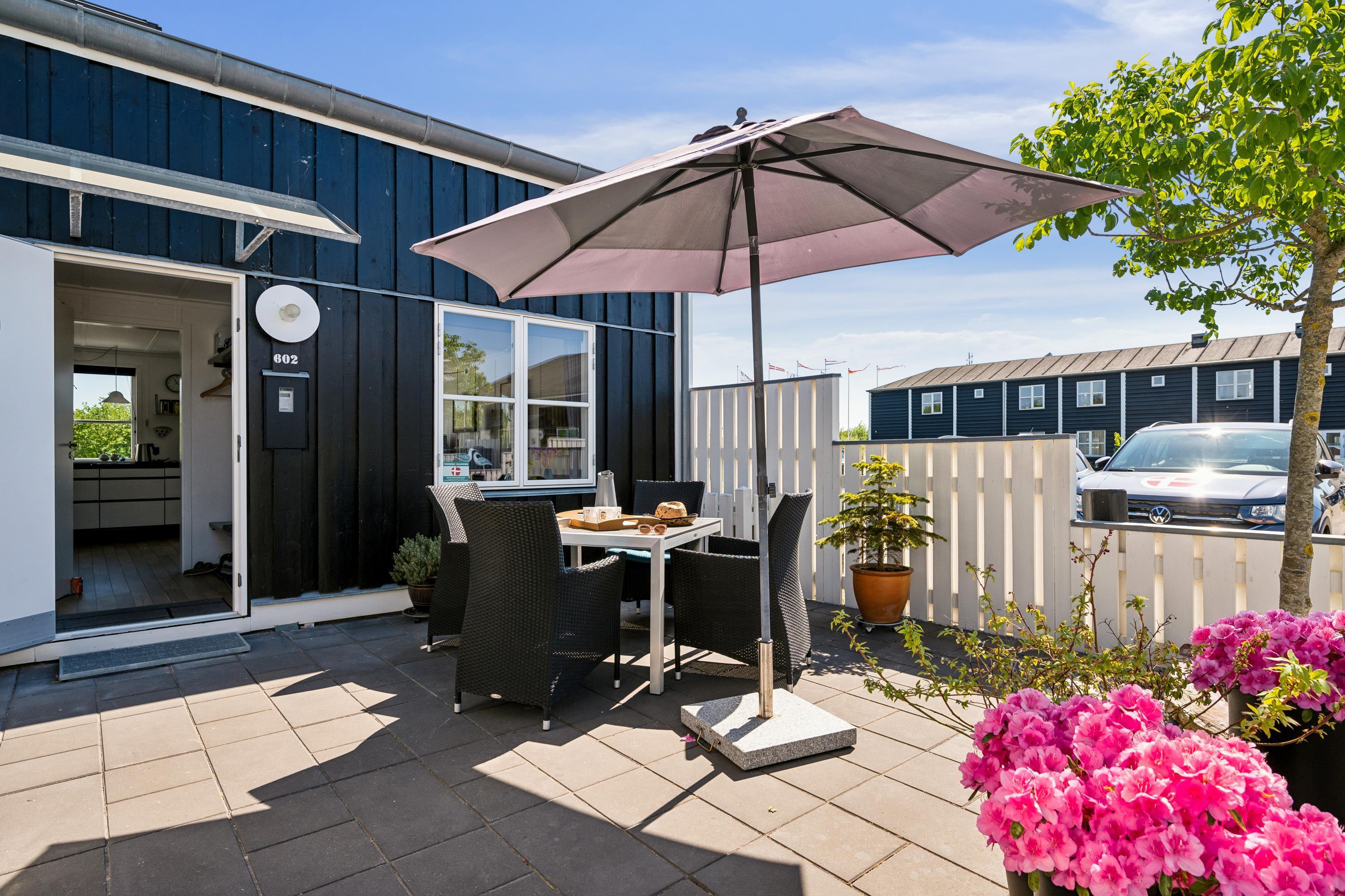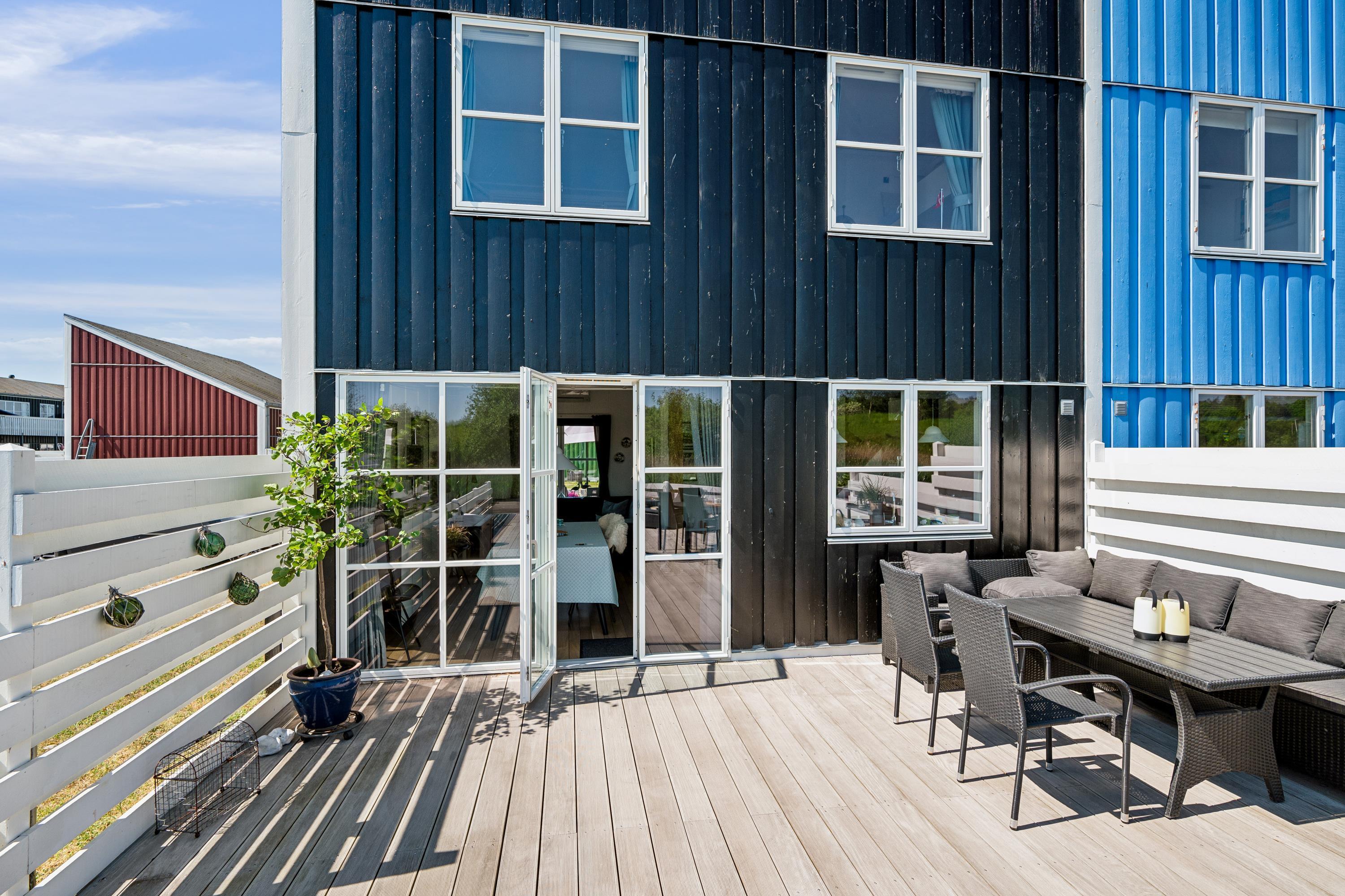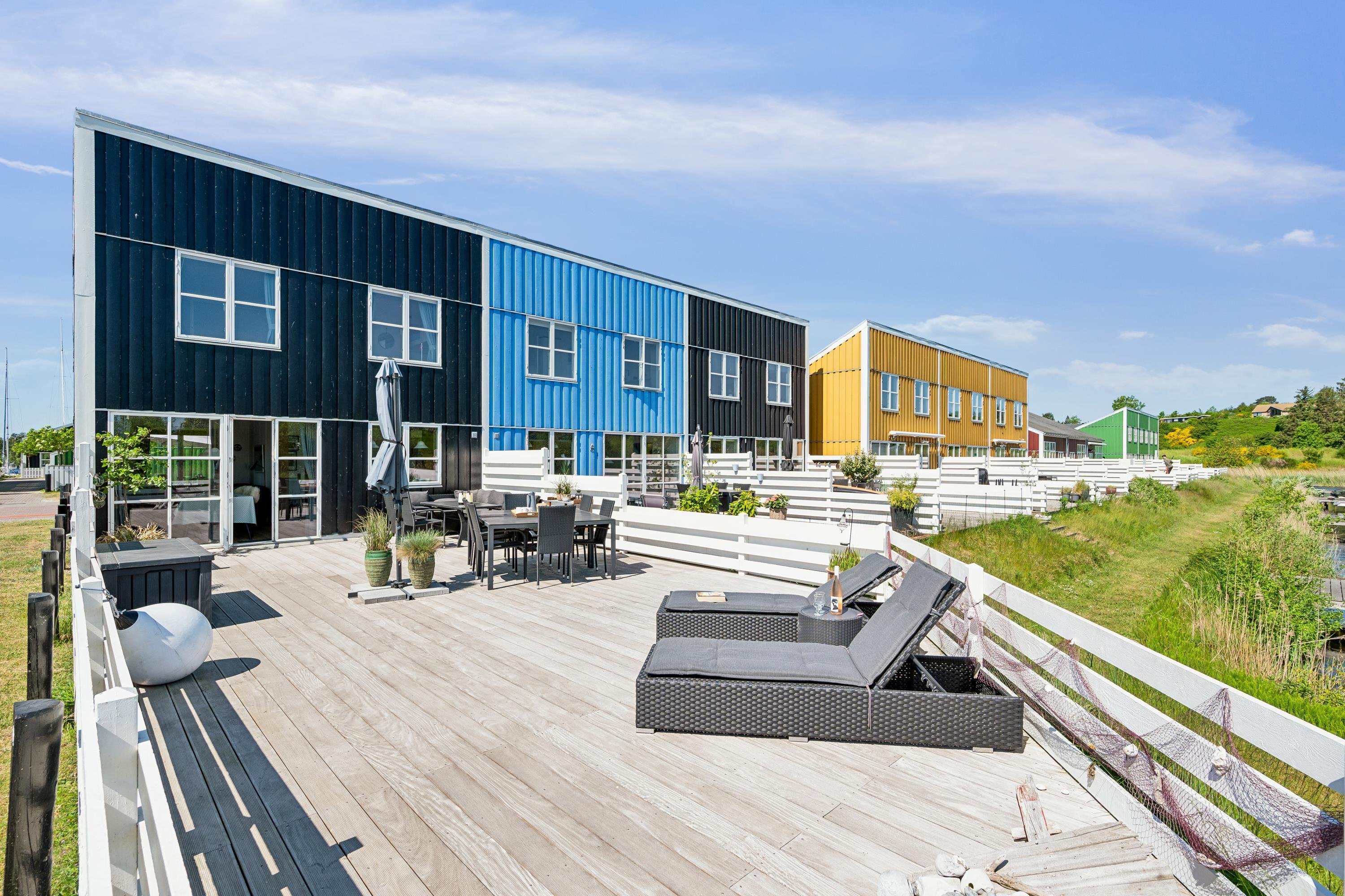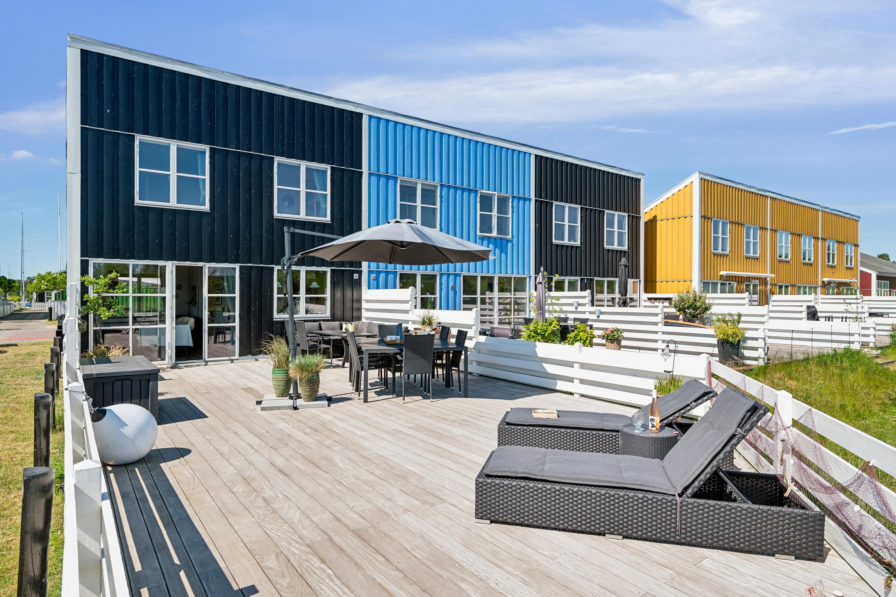 Flot feriehus i Øer Maritime Ferieby med terrasse, badebro og adgang til mange sportsaktiviteter.