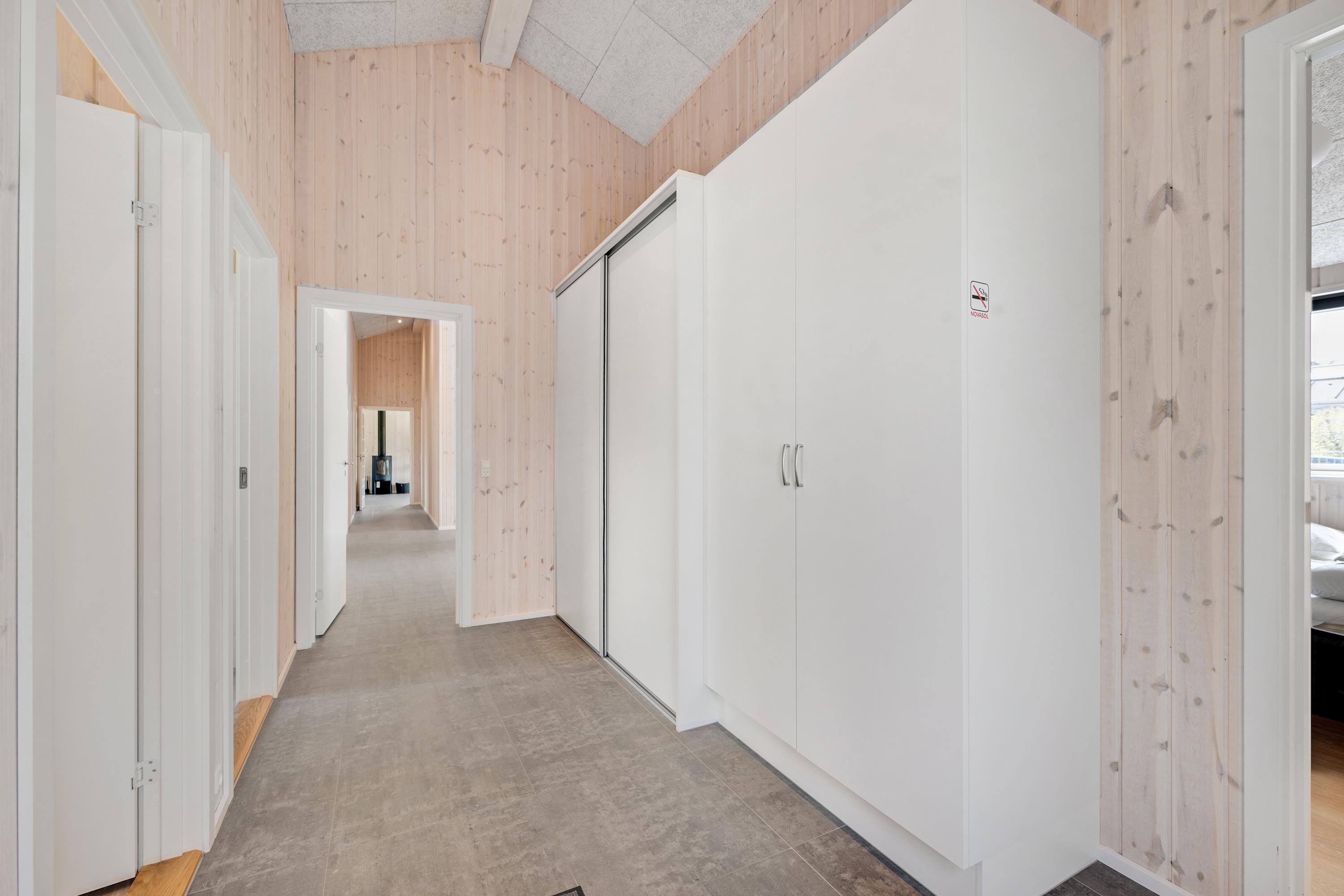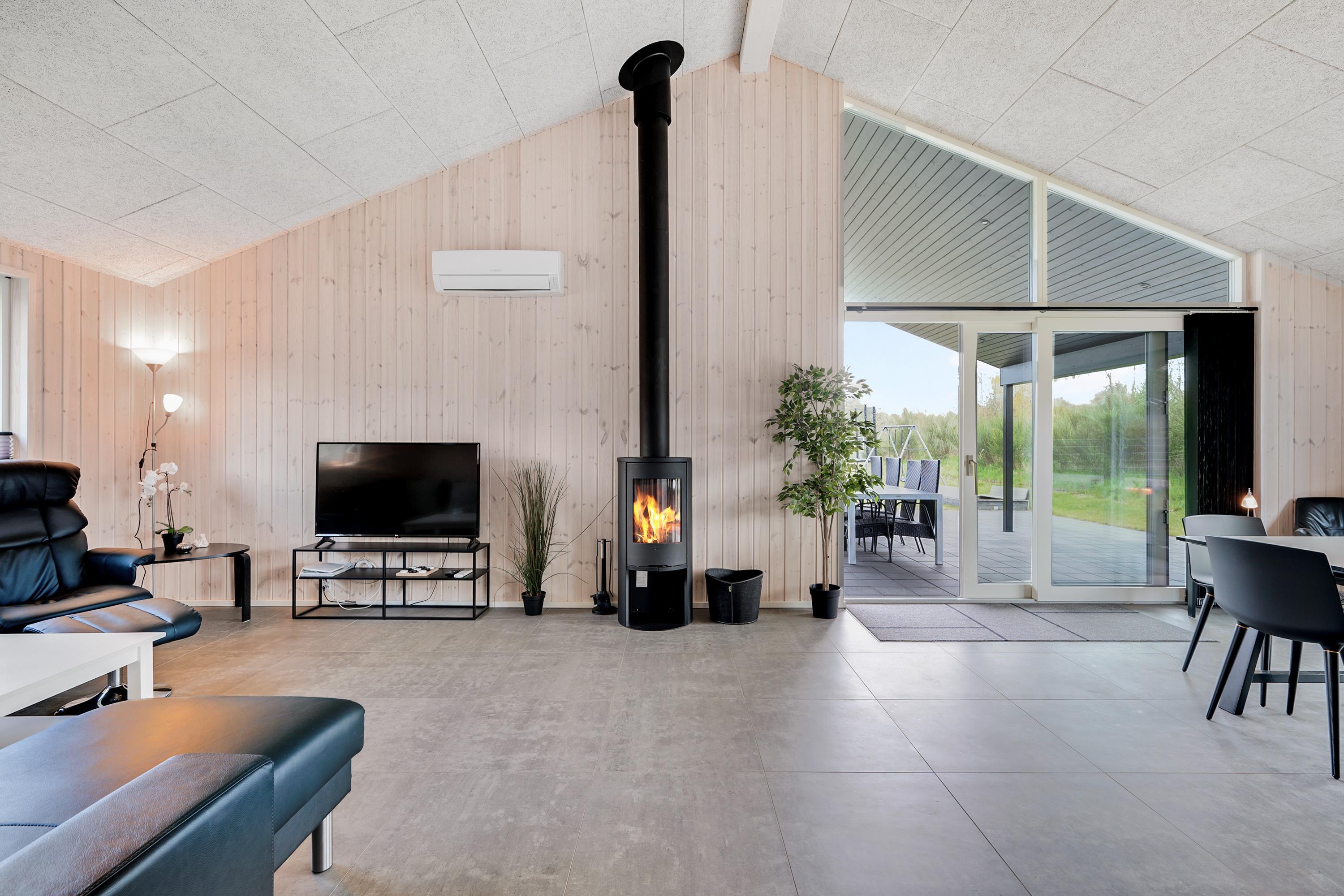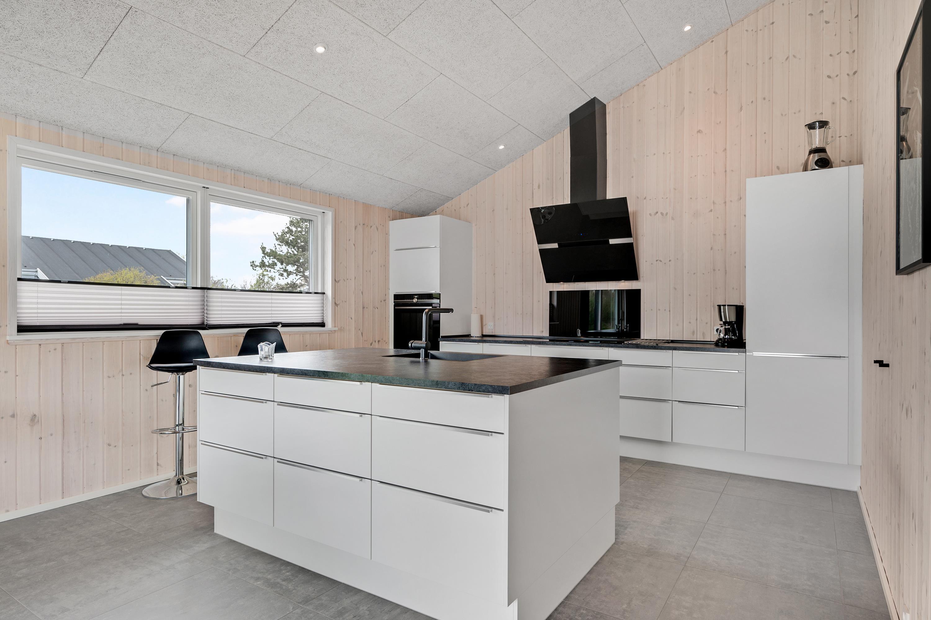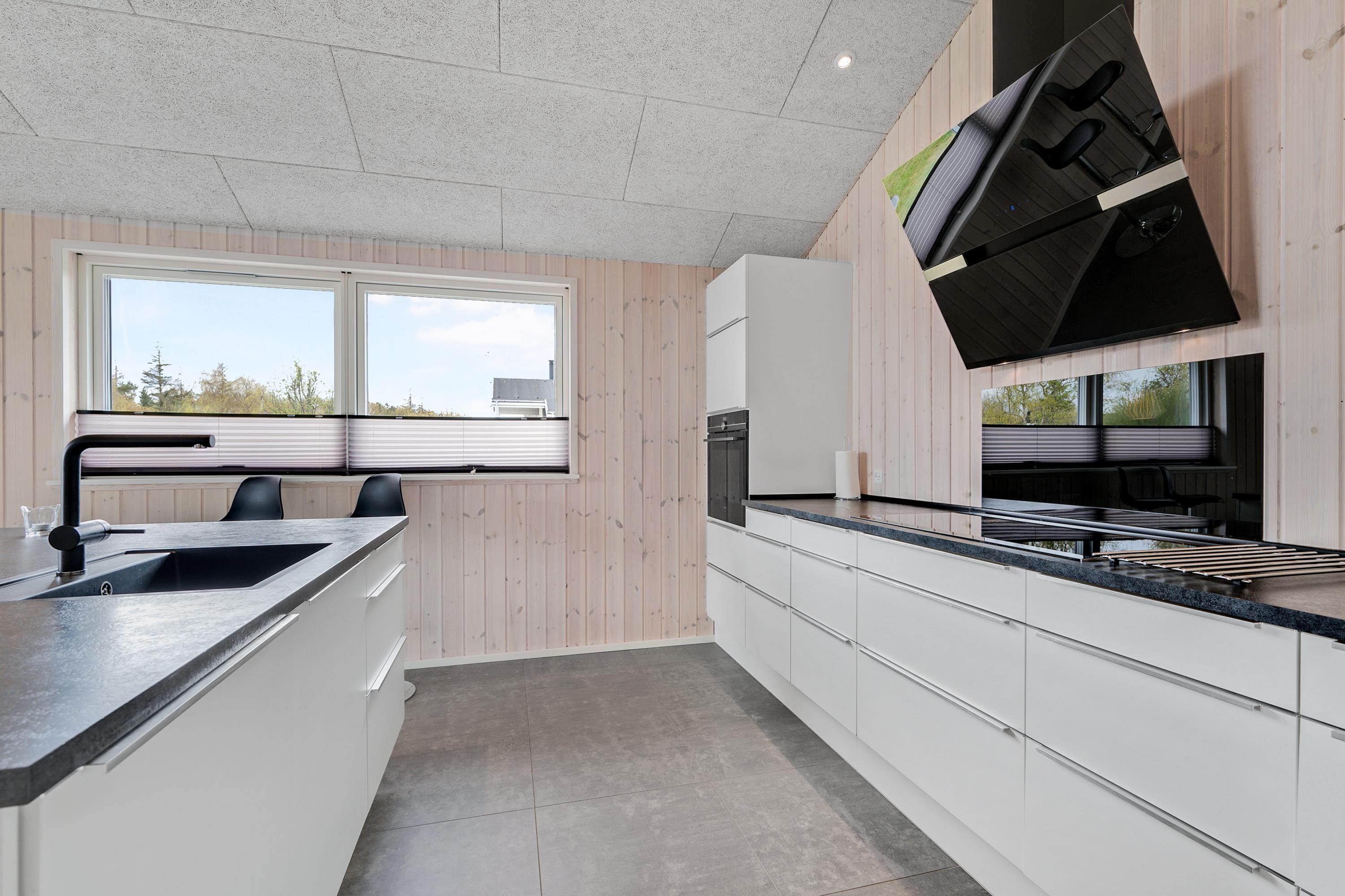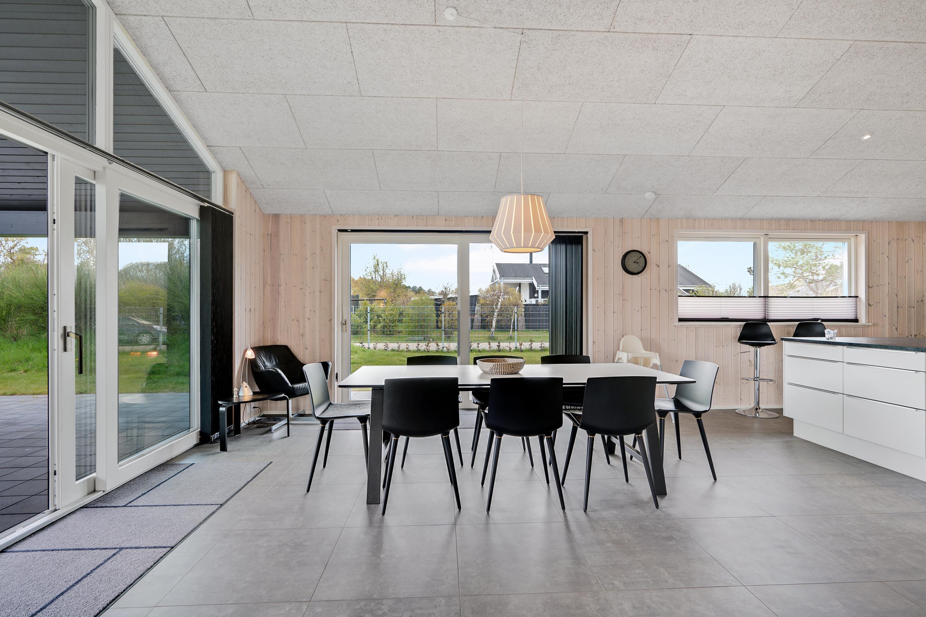 Hele huset er åbent til kip med stor loftshøjde, som bidrager til følelsen af masser af plads og lys. Den store stue ligger i åben forbindelse med køkken og har panoramavinduer og udgang til terrassen. Her er spiseafdeling til 8 personer, brændeovn, dejlig sofaafdeling samt TV med danske (inkl. TV2) og tyske kanaler. Virkelig lækkert og velindrettet køkken med induktionskogeplader, indbygningsovn, køle-/fryseskab, opvaskemaskine og mikrobølgeovn. Som en del af fordelingsgang finder man stort aktivitets-/multirum med poolbord og bordfodbold. Husets 8 sovepladser fordeler sig på 4 dejlige, lyse soveværelser – 2 med dobbeltseng og 2 med 2 enkeltsenge. Stort, virkelig flot badeværelse med bruseniche, spabad og sauna samt lidt mindre badeværelse med bruseniche. Der er gulvvarme i begge vådrum. I den store entré er der desuden vaskemaskine og tørretumbler. Internetadgang.