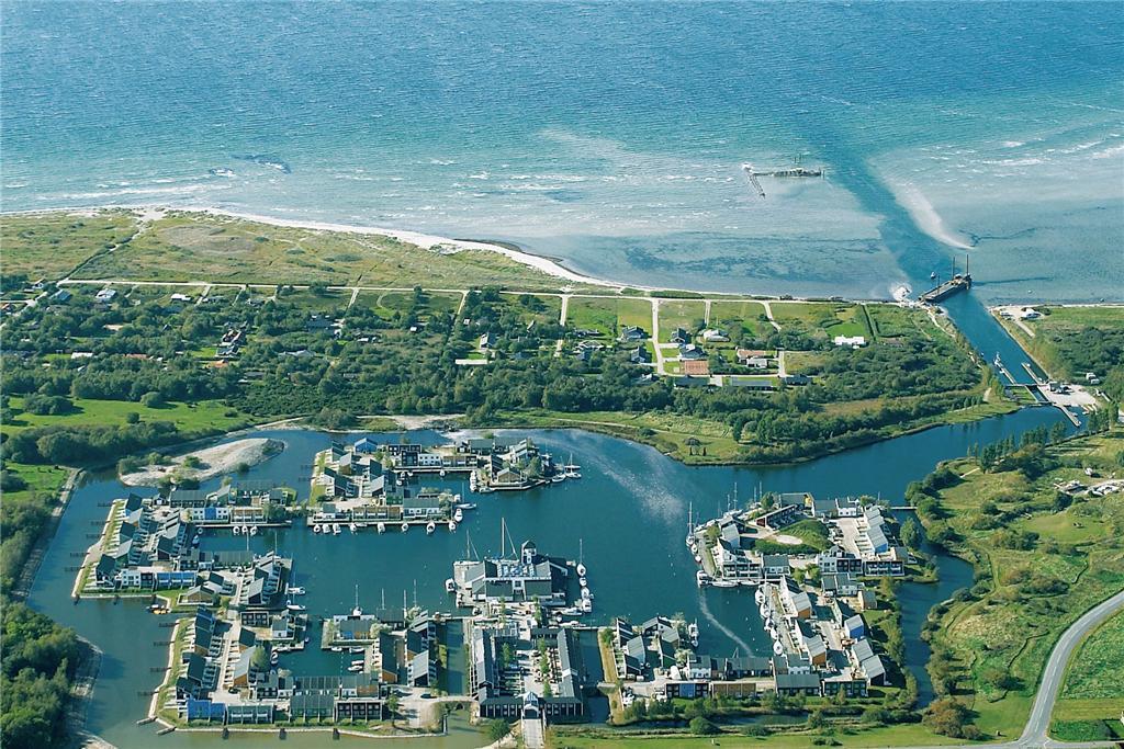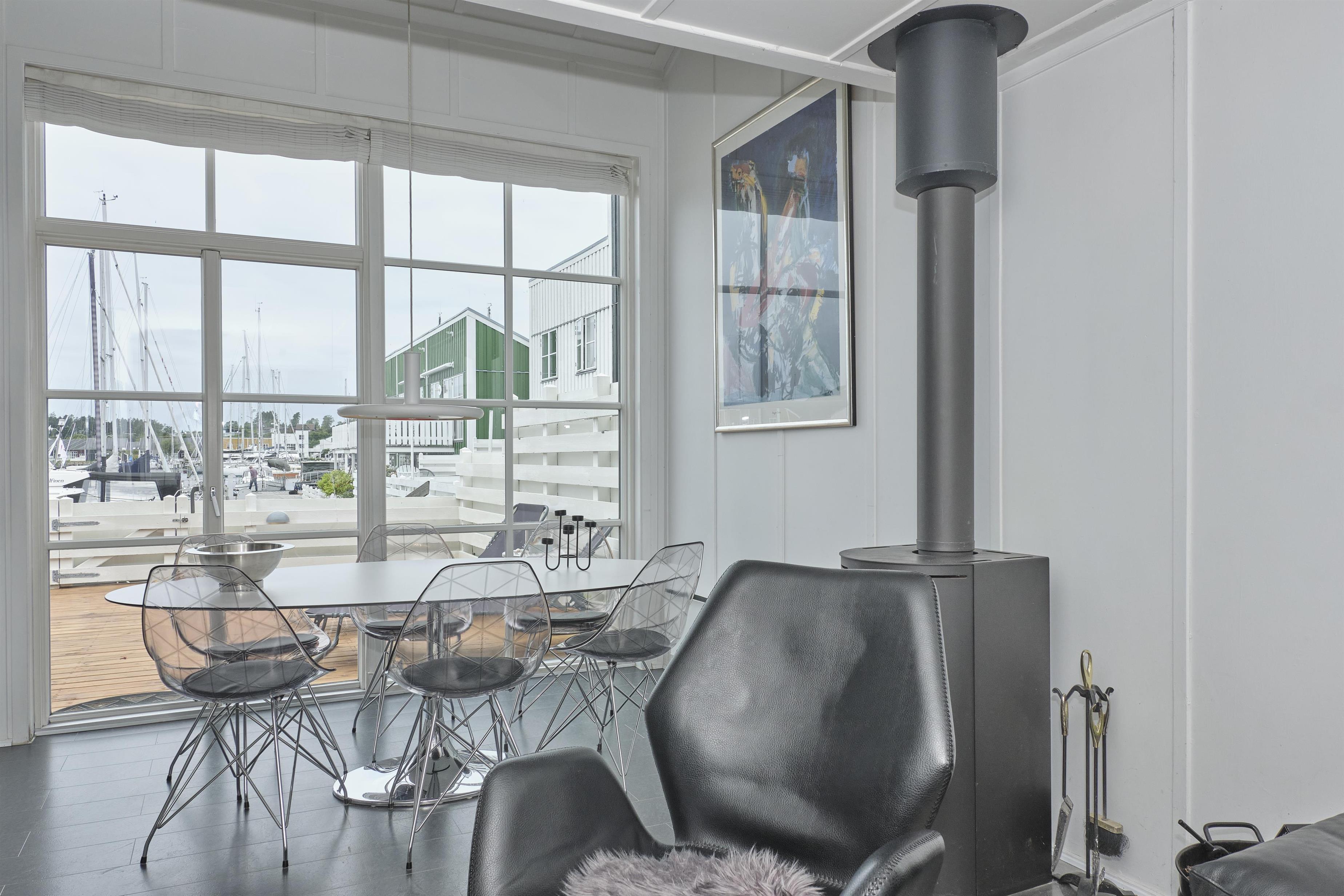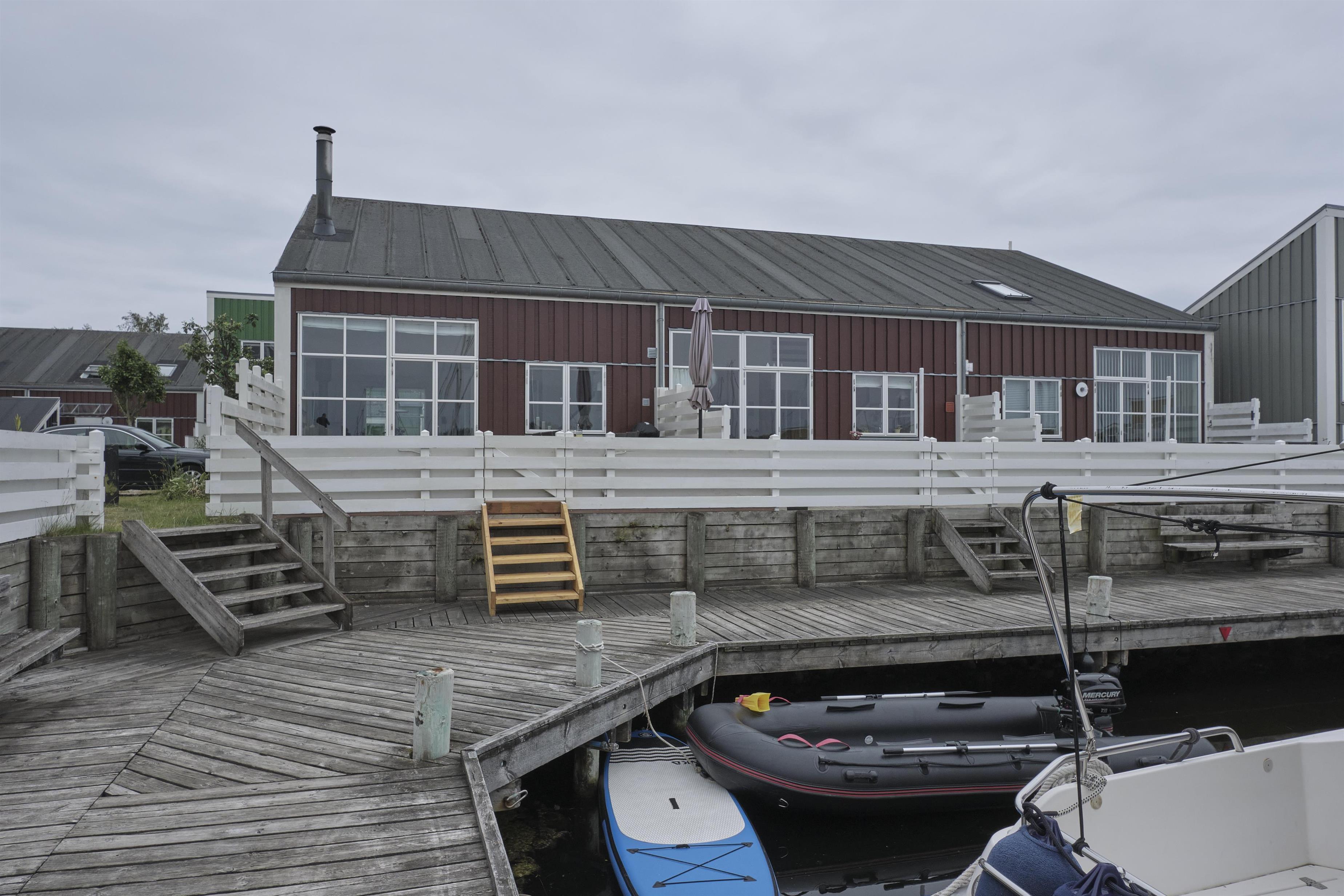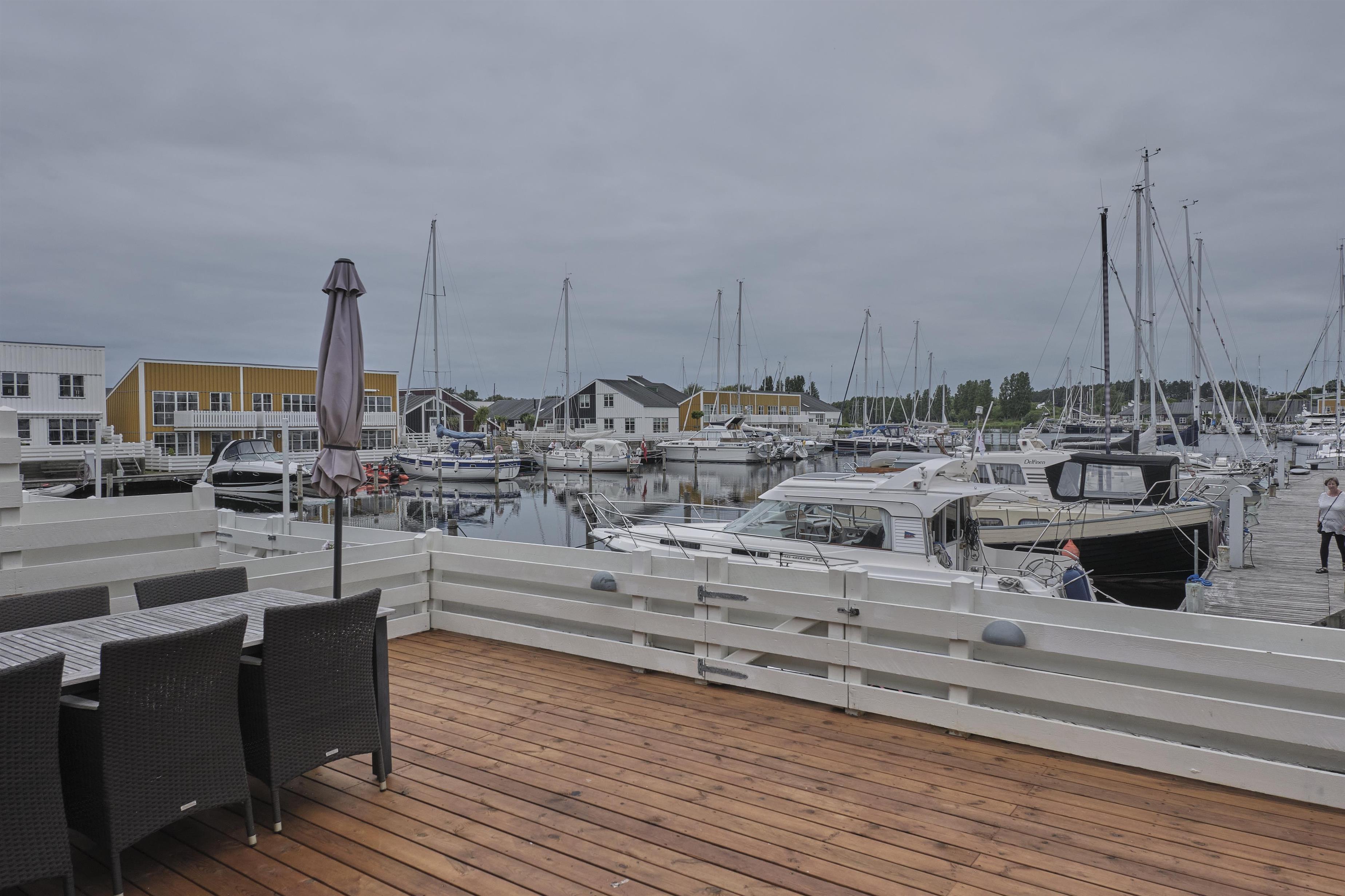 Flot ferielejlighed i Øer Maritime Ferieby med dejlig udsigt til bådpladser og stor træterrasse.