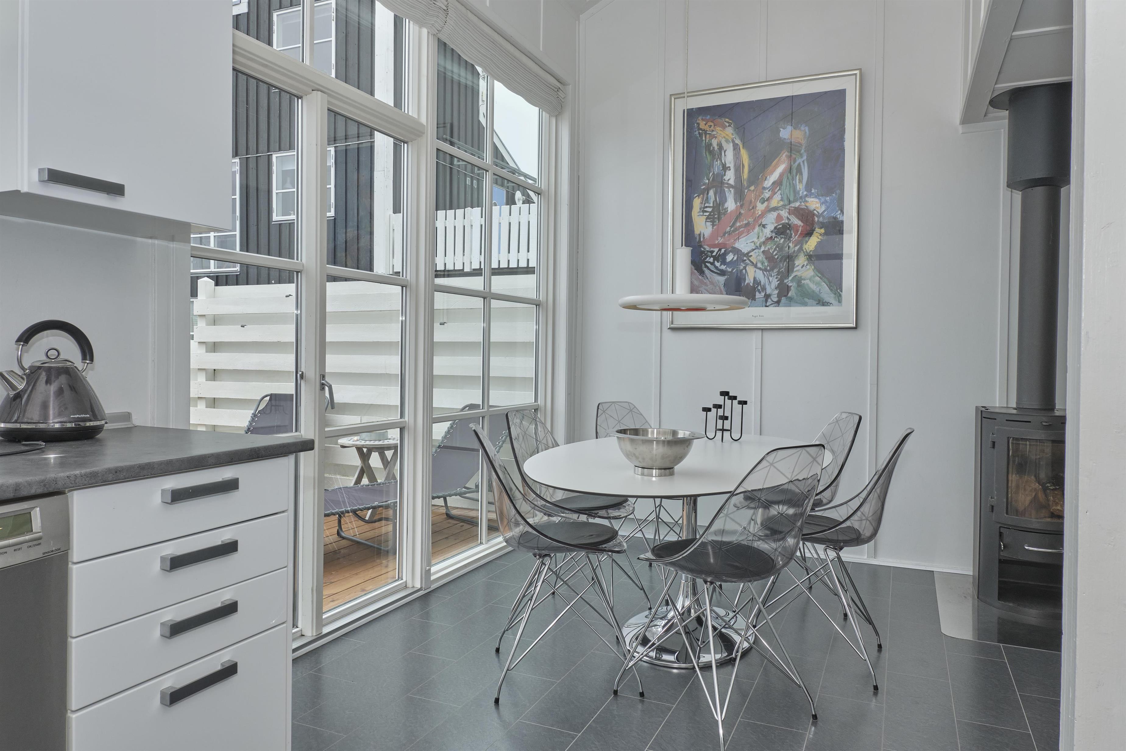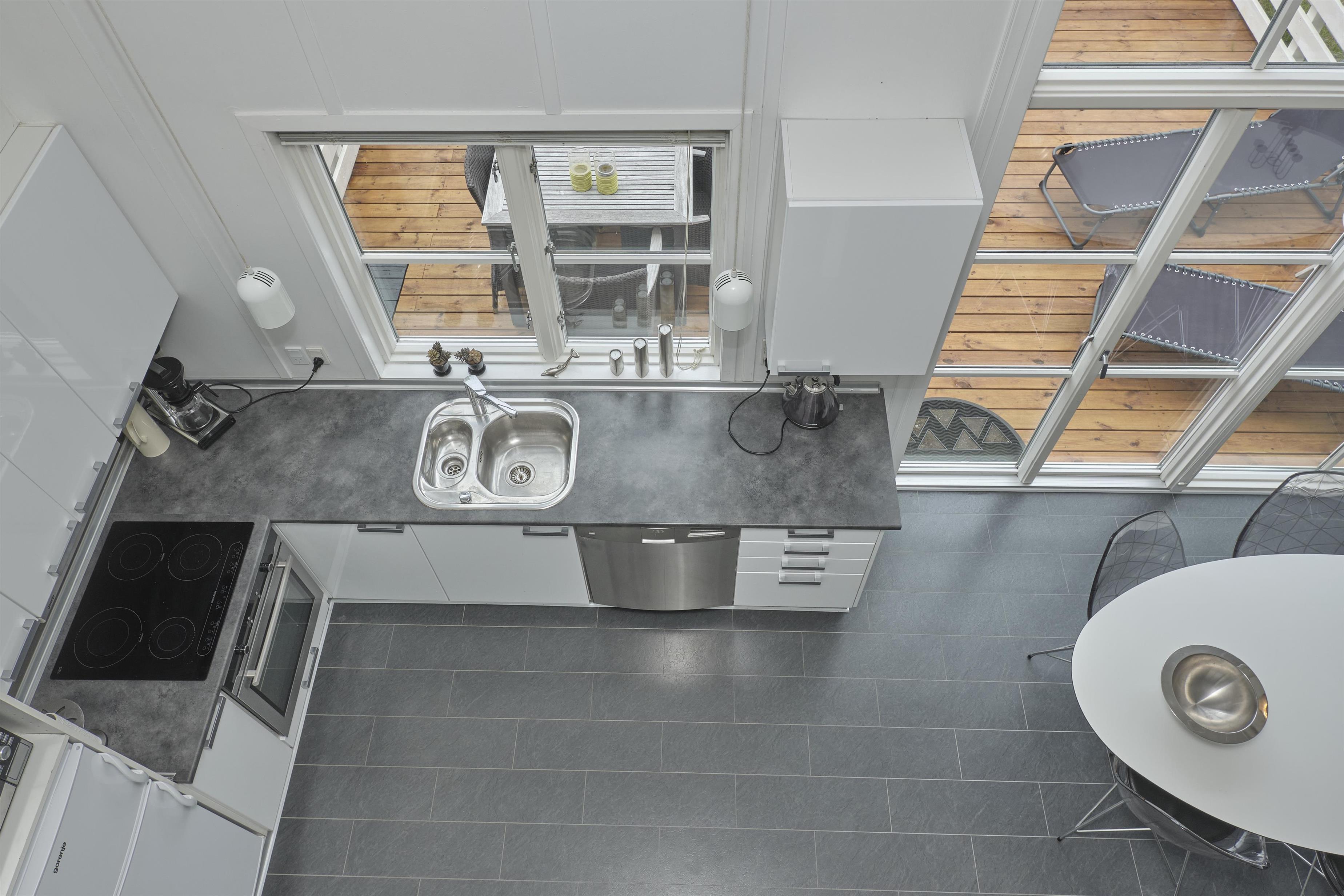 Lys og dejlig opholdsstue med udgang til terrasse og i åben forbindelse med køkken. Her er spiseplads til 5 personer, rummeligt sofamøblement, brændeovn, TV med danske (inkl. TV2) og tyske kanaler, DVD-afspiller, CD-afspiller samt radio. Godt, veludstyret køkken med keramiske kogeplader, ovn, køle-/fryseskab, mikrobølgeovn og opvaskemaskine. Husets sovepladser fordeler sig på 2 soveværelser på 1. sal: 1 med dobbeltseng og 1 med dobbeltseng samt en overkøje. Dejligt badeværelse med bruseniche, gulvvarme og vaskemaskine. Internet (OBS! Signal kan være svingende).