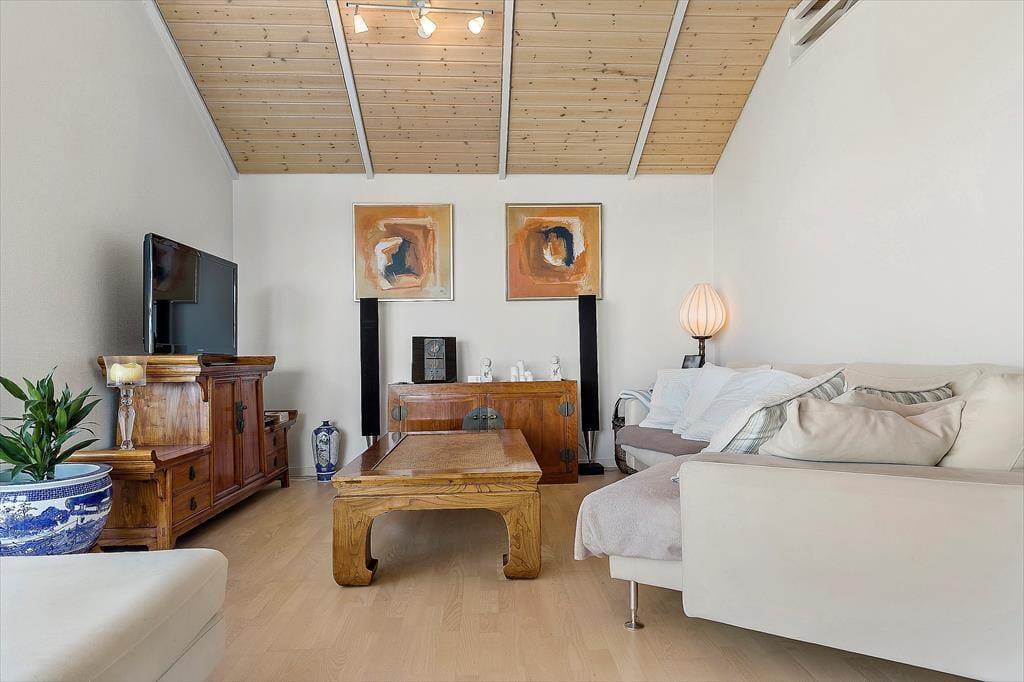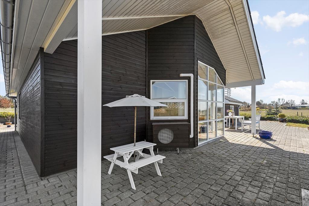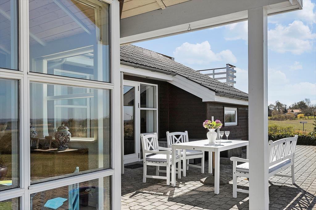 Fra stuen er der direkte adgang til en stor flisebelagt terrasse, som omkranser hele huset. Her finder I masser af muligheder for at slappe af og nyde den friske luft. Terrassen inviterer til lange sommeraftener med grill, vin og udsigten til det smukke terræn og Ebeltoft Vig. Haven er et sandt paradis for børnene med både sandkasse og legehus, der sikrer timevis af leg og sjov. Den vestvendte terrasse er perfekt til at få det sidste med af dagens solstråler, mens I nyder roen og den fantastiske natur omkring jer.
