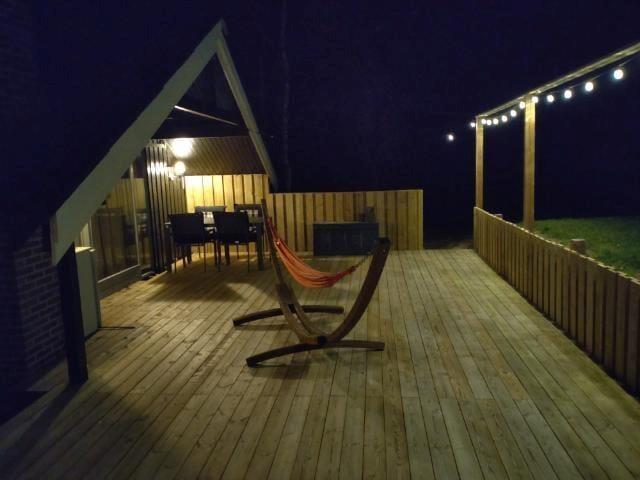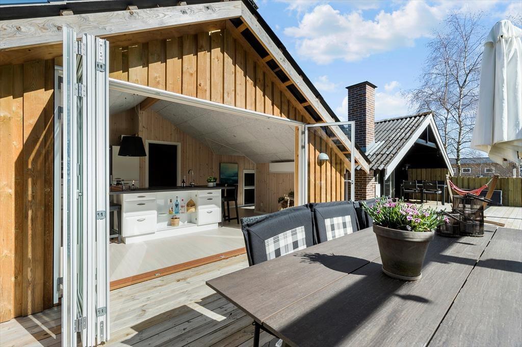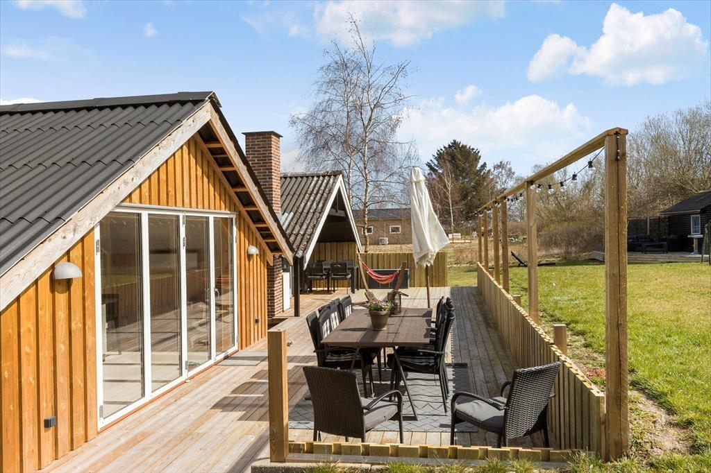 Den store og delvist overdækkede træterrasse er hjertet i de udendørs omgivelser. Her kan I slappe af i havemøblerne, grille aftensmaden eller tage en lur i hængekøjen. Grunden er næsten helt plan og perfekt til leg, boldspil og solbadning. Når dagen går på hæld, er terrassen det ideelle sted at nyde de lune sommeraftener i godt selskab.