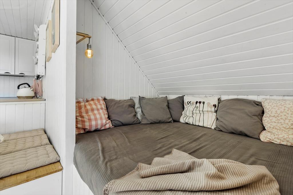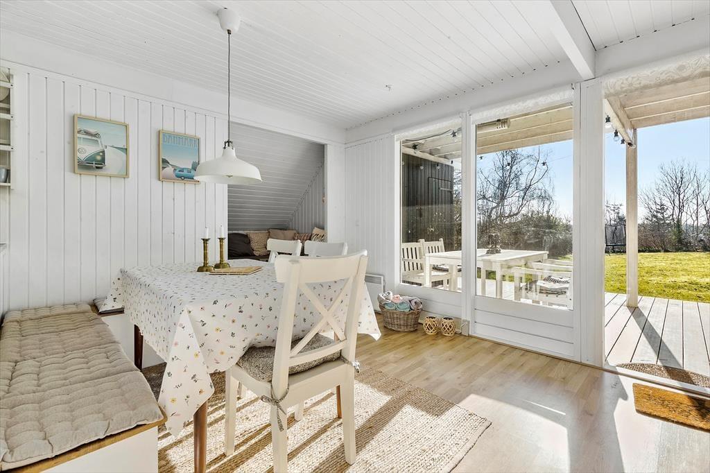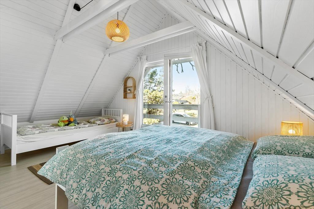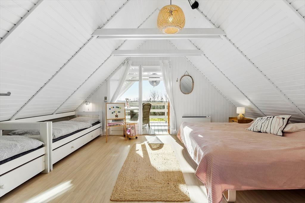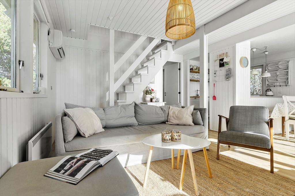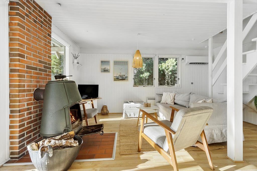 Huset byder på et lyst og åbent opholdsrum med en hyggelig spiseplads og en komfortabel sofa ved brændeovnen. Ved siden af spisepladsen finder du en dejlig hyggekrog, hvor du kan slappe af med en god bog eller nyde en rolig stund. Her kan du også streame en film på tv’et med Chromecast. Det åbne køkken er veludstyret med bl.a. opvaskemaskine, og lige udenfor finder du en terrasse med liggestole – perfekt til en pause i solen, mens maden simrer. Der er tre soveværelser: ét i stueetagen med dobbeltseng og to på første sal. Det ene værelse har dobbeltseng og enkeltseng samt en fransk altan, mens det andet har dobbeltseng og to enkeltsenge samt en overdækket altan med udsigt over haven. Badeværelset på stueetagen er udstyret med sauna, og i skuret finder I både vaskemaskine og mikrobølgeovn.