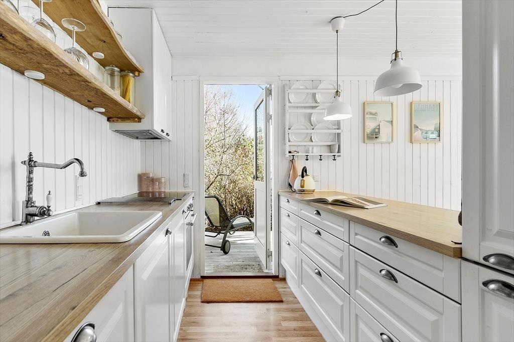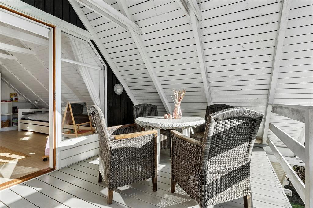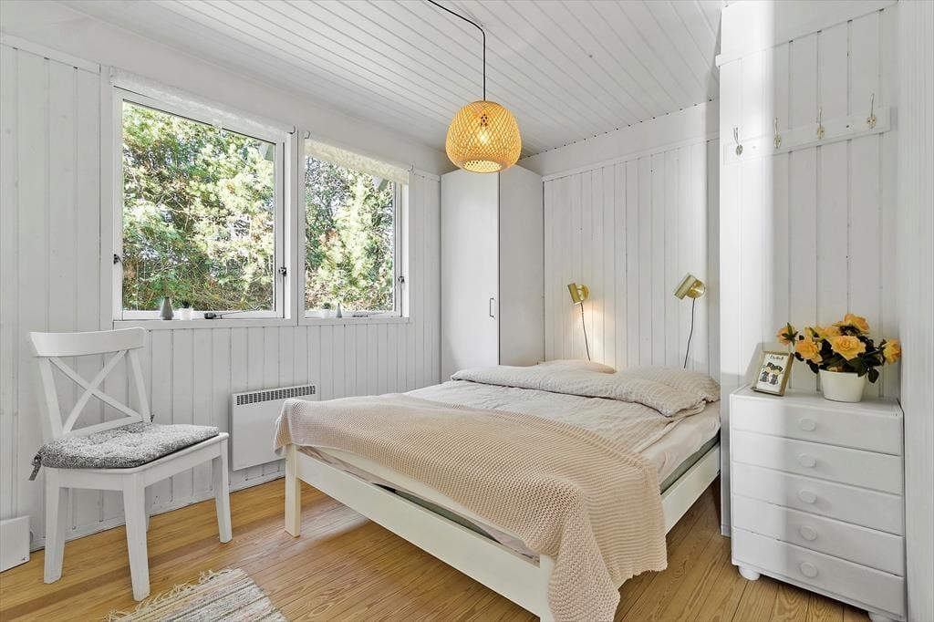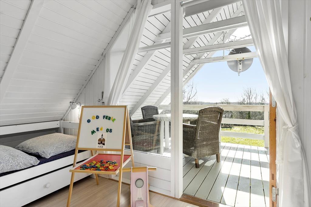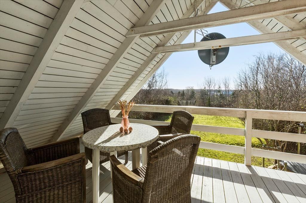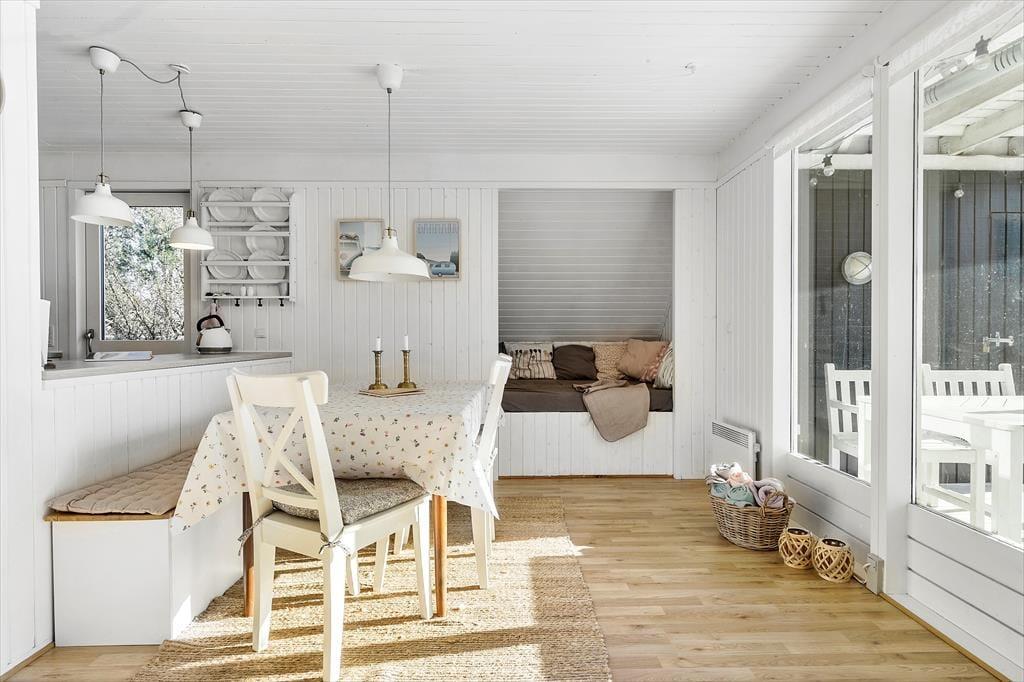 Huset byder på et lyst og åbent opholdsrum med en hyggelig spiseplads og en komfortabel sofa ved brændeovnen. Ved siden af spisepladsen finder du en dejlig hyggekrog, hvor du kan slappe af med en god bog eller nyde en rolig stund. Her kan du også streame en film på tv’et med Chromecast. Det åbne køkken er veludstyret med bl.a. opvaskemaskine, og lige udenfor finder du en terrasse med liggestole – perfekt til en pause i solen, mens maden simrer. Der er tre soveværelser: ét i stueetagen med dobbeltseng og to på første sal. Det ene værelse har dobbeltseng og enkeltseng samt en fransk altan, mens det andet har dobbeltseng og to enkeltsenge samt en overdækket altan med udsigt over haven. Badeværelset på stueetagen er udstyret med sauna, og i skuret finder I både vaskemaskine og mikrobølgeovn.