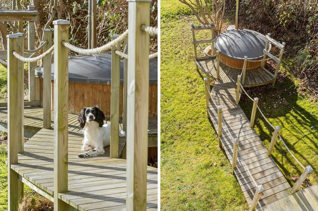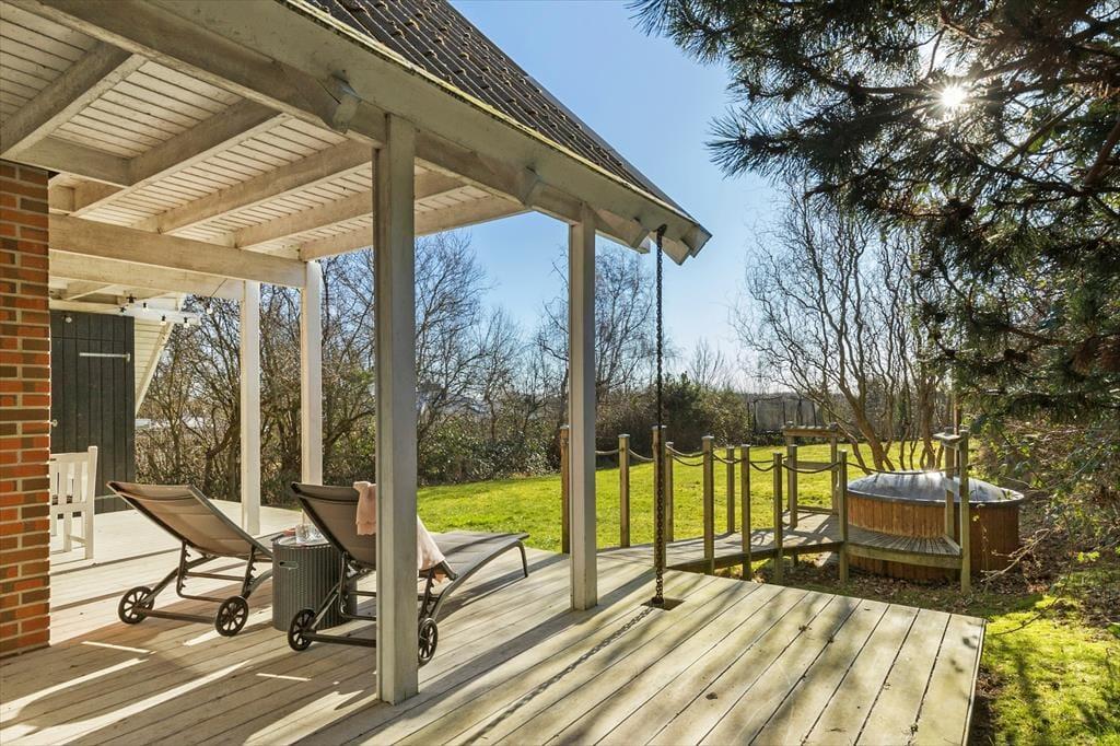 Husets store lukkede have er en drøm for både børn og hunde, der har masser af plads til leg. Den overdækkede terrasse har en bro direkte til vildmarksbadet – ideelt til en afslappende aften under åben himmel. Her kan I grille, nyde roen og mærke den friske luft fra kysten.
