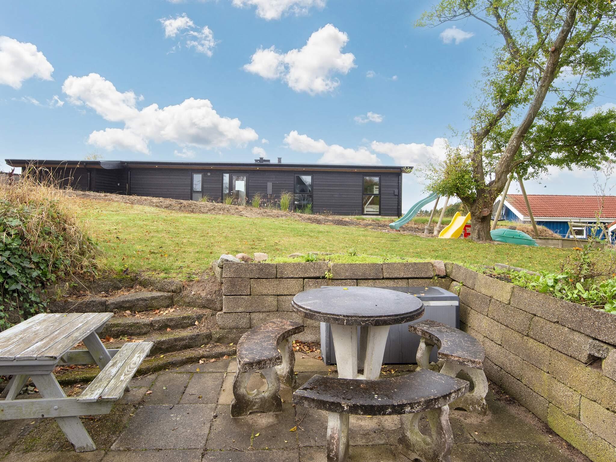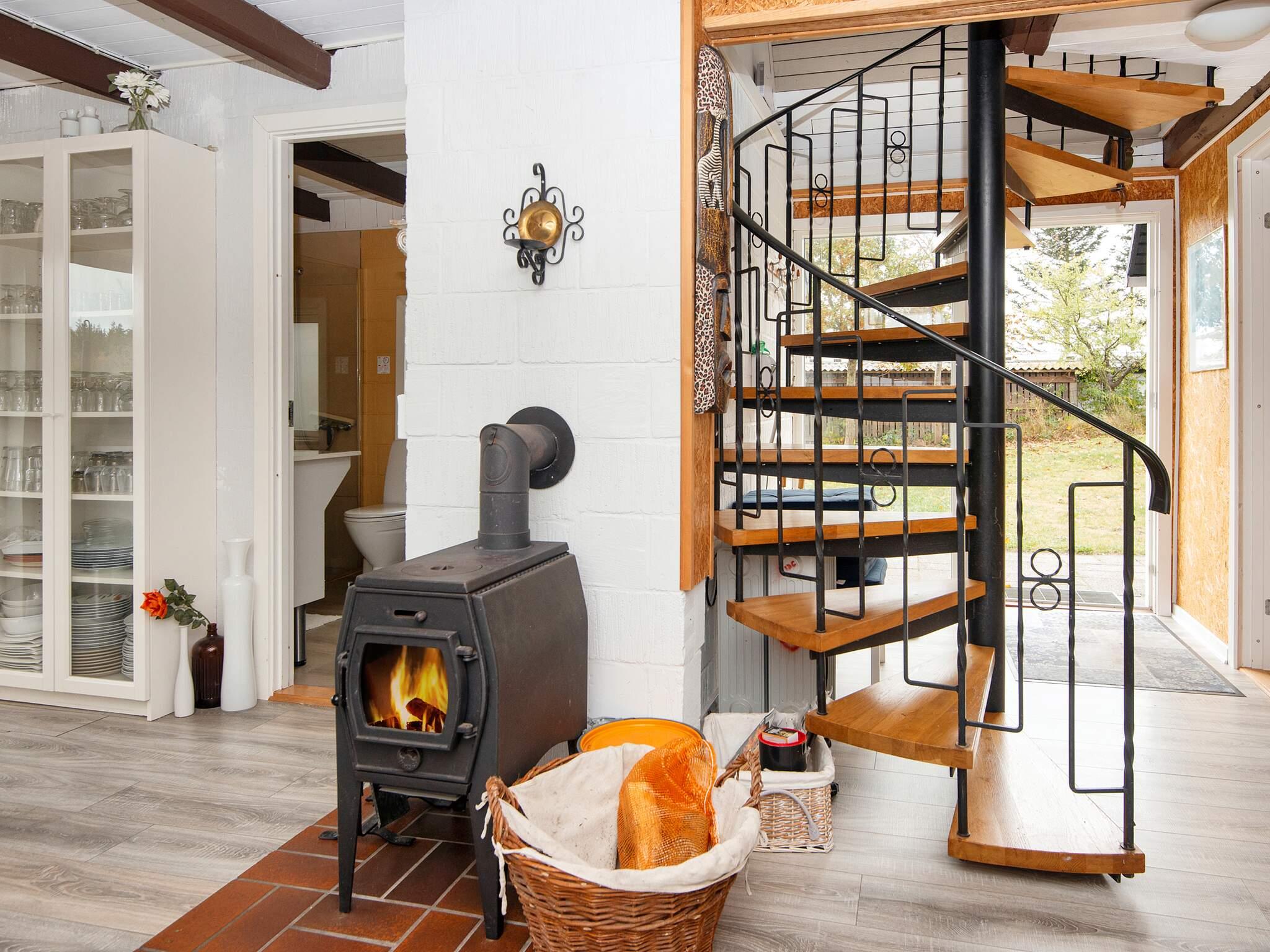Når I sidder på altanen på 1. sal, kan I se ud over vandet. Huset har i stueetagen køkken, spiseplads og et soveværelse samt badeværelse.