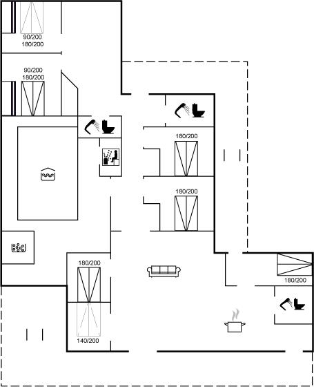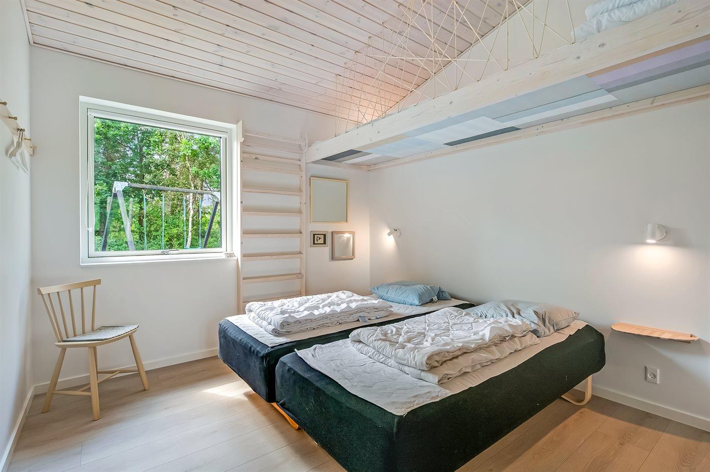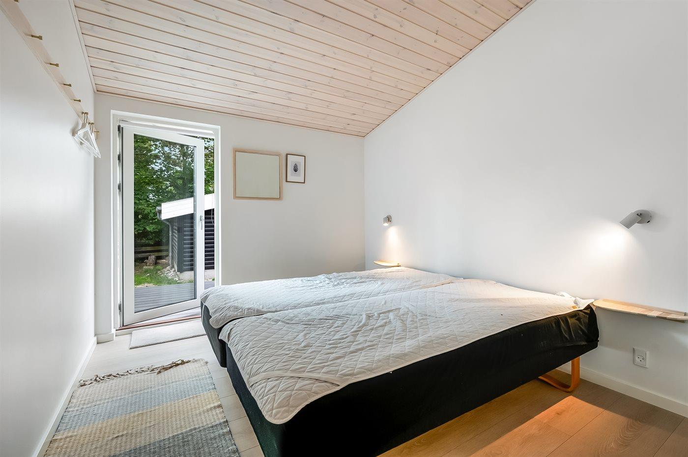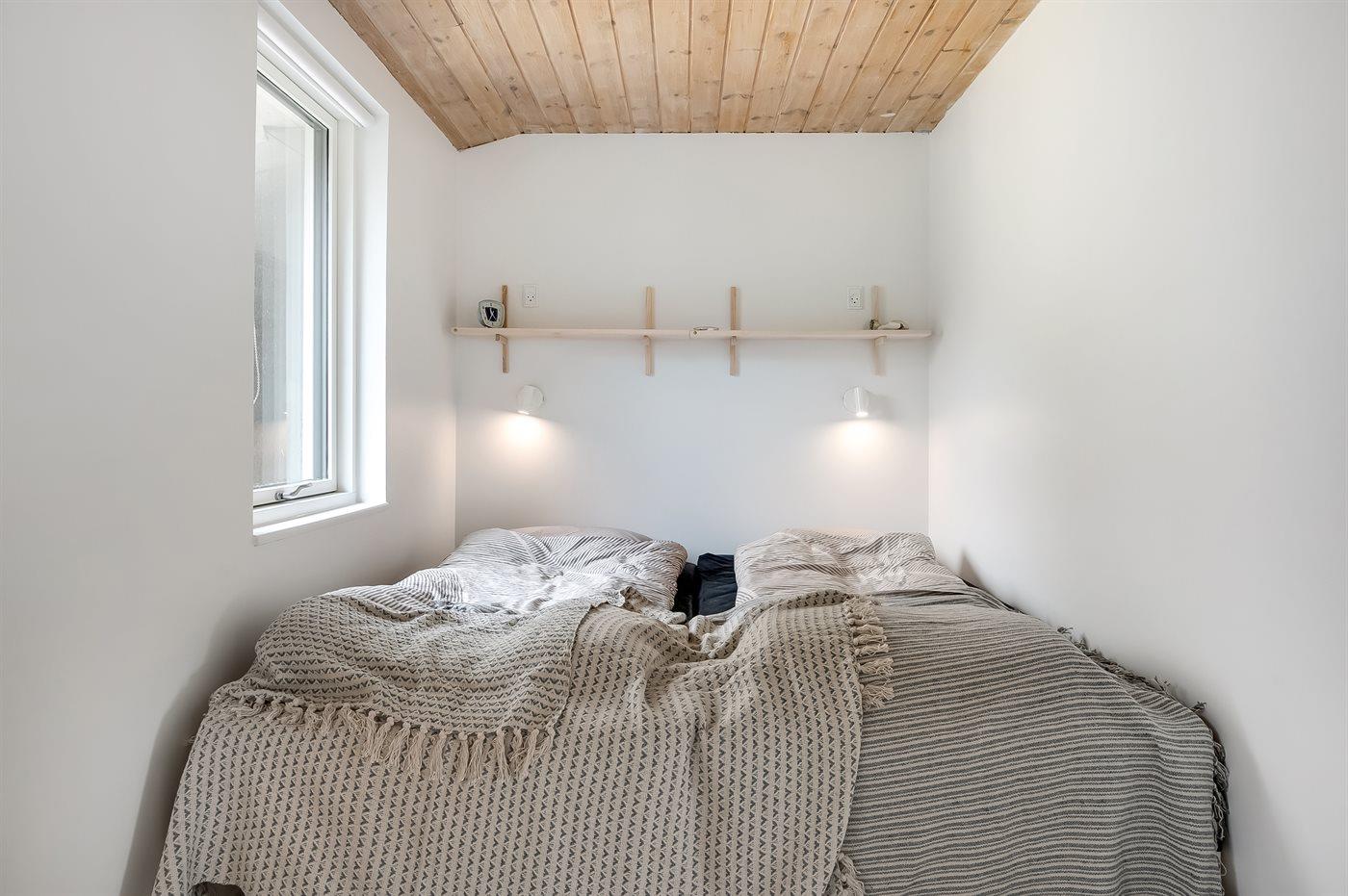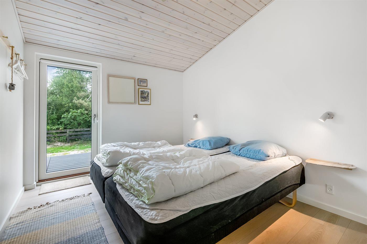 Der er i alt 7 soveværelser. Sovepladserne fordeler sig på: 12 sovepladser i dobbeltsenge. 2 sovepladser i køjeseng. 2 sovepladser i sovesofa (dobbelt). Derudover er der 2 stk. barnesenge.