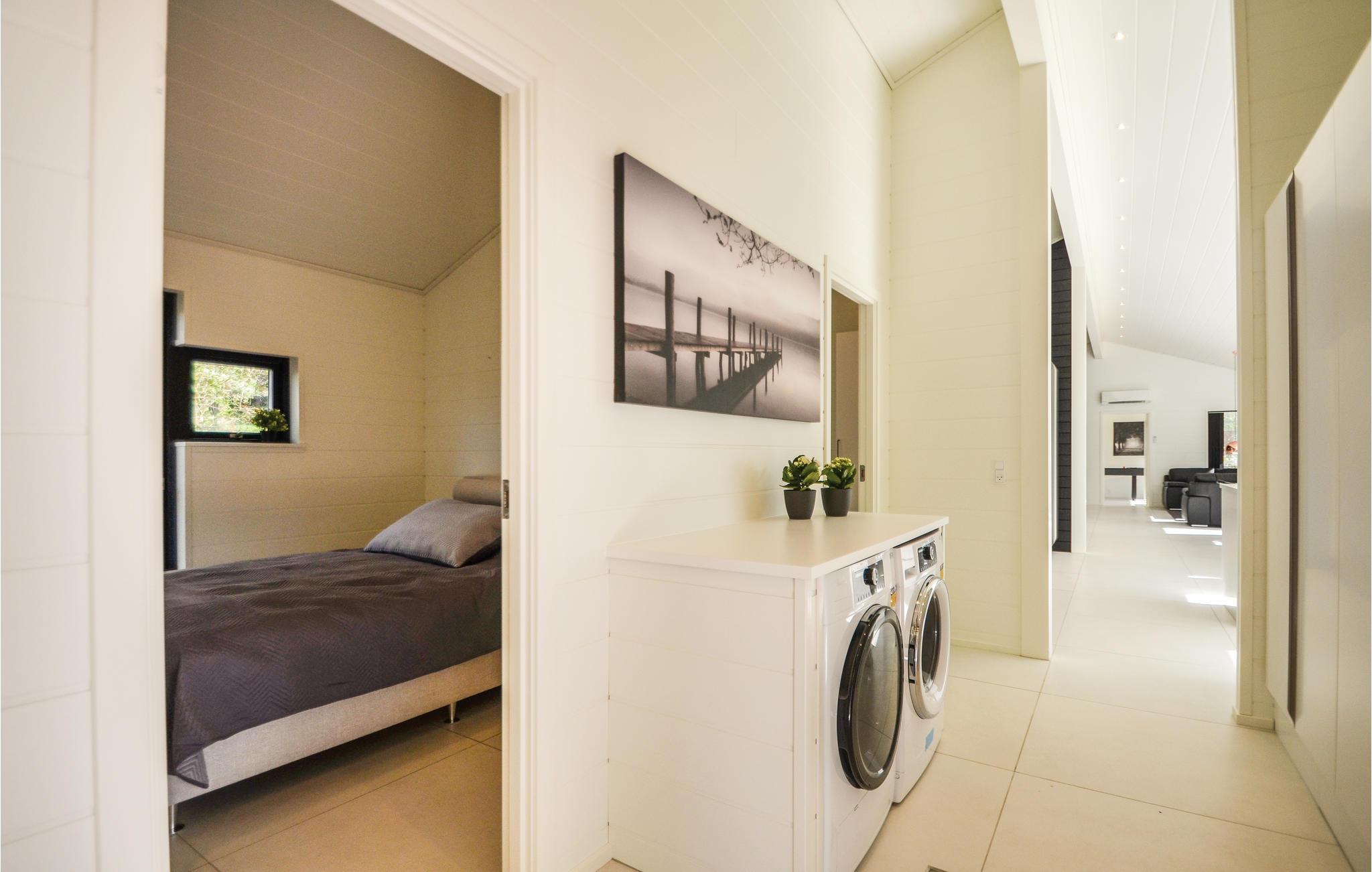 Huset er moderne i sin arkitektur, indretning og udstyr. Det er indrettet med fem gode soveværelser - alle med dør ud til terrasseområdet. Hertil kommer en stor hems, så der samlet er gode sovemuligheder for op til 12 personer. De tre badeværelser er stilfuldt indrettet og indeholder både et topersoners spabad og sauna.