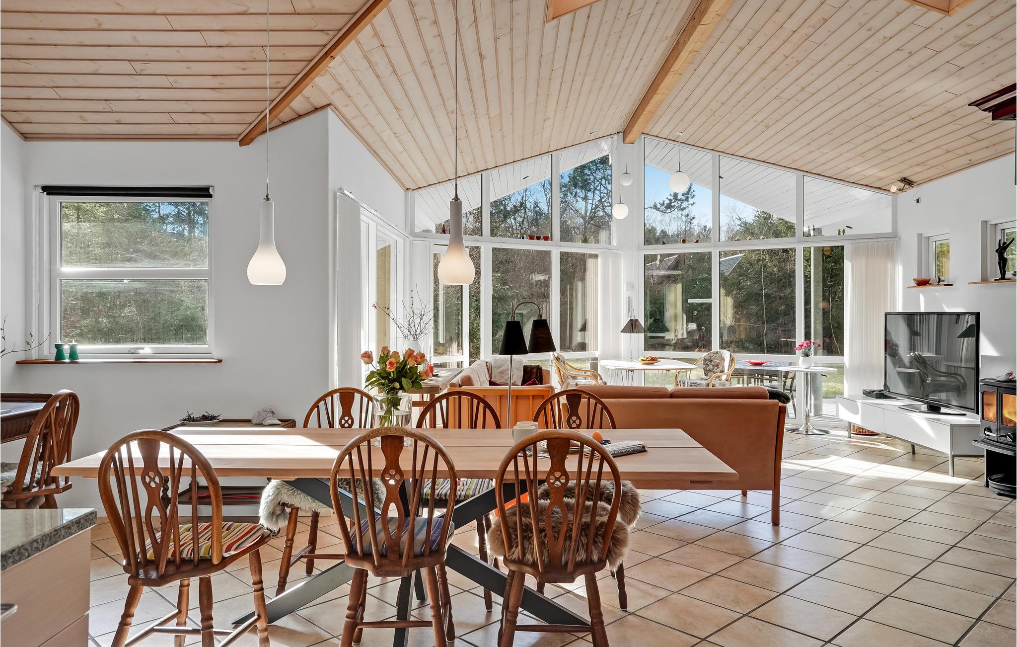 Velkommen til dette dejlige sommerhus, som har plads nok til to familier, der ønsker at holde en skøn ferie sammen. Husets hjerte er den store opholdsstue med lækre møbler og store vinduespartier, der lukker meget lys ind og giver et godt udsyn til haven. Glæd jer til at tilberede lækre feriemåltider i husets store, veludstyrede køkken, som efterfølgende kan nydes ved spisepladsen eller ude på terrassen. Her kan I sidde og sole jer eller læse en god bog i løbet af dagen, mens børnene løber rundt og leger på græsset eller gynger og rutcher. Om aftenen kan I holde en hyggelig grillaften, eller hvad med at sætte sig godt til rette i udespaet med en drink i hånden? Foretrækker I indespa, har I også den mulighed, ligesom I kan varme jer godt op i saunaen. Den store fladskærm med Chromecast i stuen indbyder til hyggelige filmaftener.