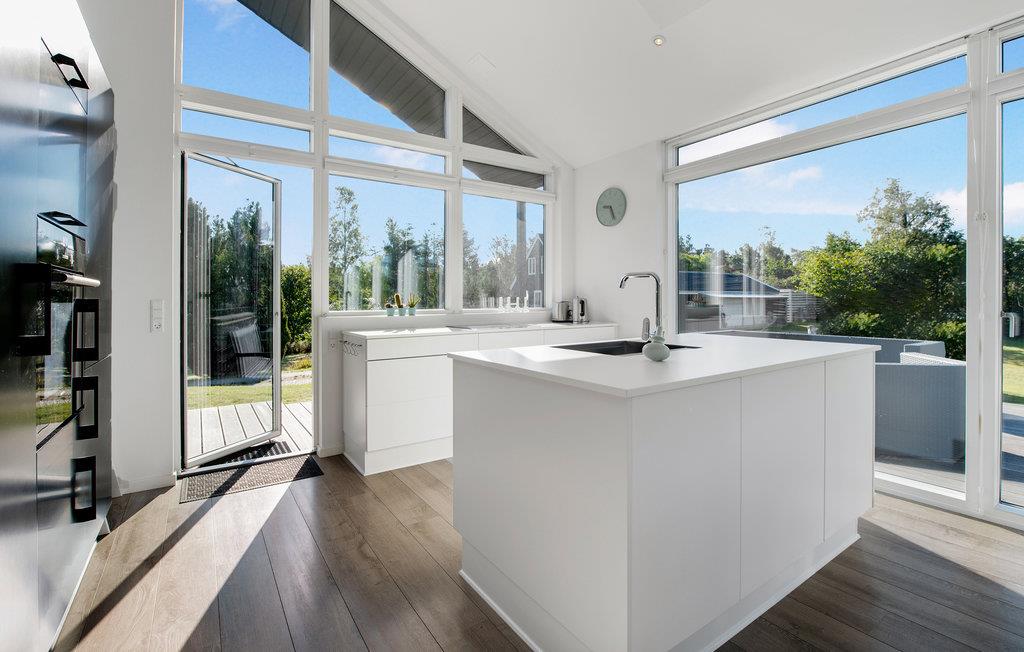 Moderne luksushus i Øer Strand med åbent køkken, terrasse og smuk udsigt over haven og grønne områder.