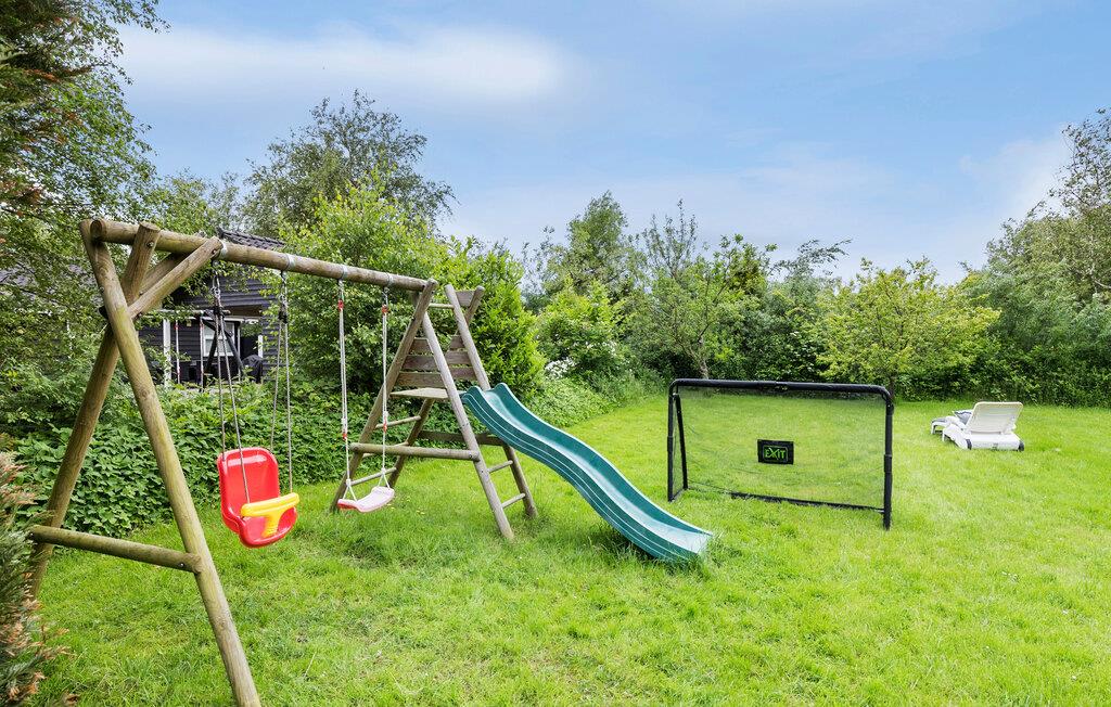To sider af huset er omgivet af en stor træterrasse, som om sommeren bliver stedet, hvor I kan opholde jer udenfor. Se børnene lege på gyngerne, rutsjebanen og i sandkassen. Grill om aftenen, eller sæt jer omkring bålfadet for at riste skumfiduser.