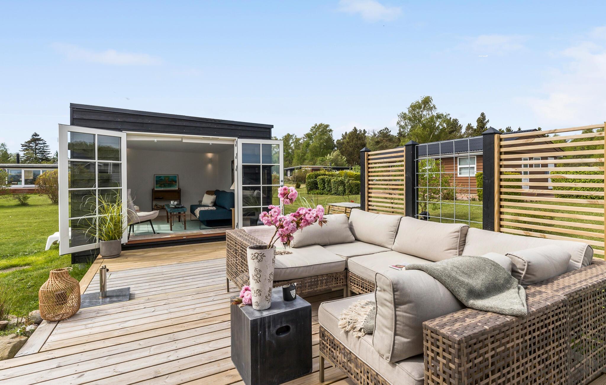 Syd for Ebeltoft byder dette flotte feriehus jer velkommen med en stor træterrasse. Træd indenfor og lad feriestemningen brede sig. Sving grydeskeen i det dejlige køkken, spil Matador ved spisebordet og se en spændende film på sofaen med en skål popcorn. Udover det naturlige lys i huset skiller det moderne hus sig ud med den store terrasse, der omkranser det meste af huset. Afhængigt af tidspunktet på dagen kan I nyde solen eller søge et skyggefuldt sted. Sæt jer godt til rette på terrassens store havesofa, nyd solens stråler og se jeres børn boltre sig på græsplænen.
