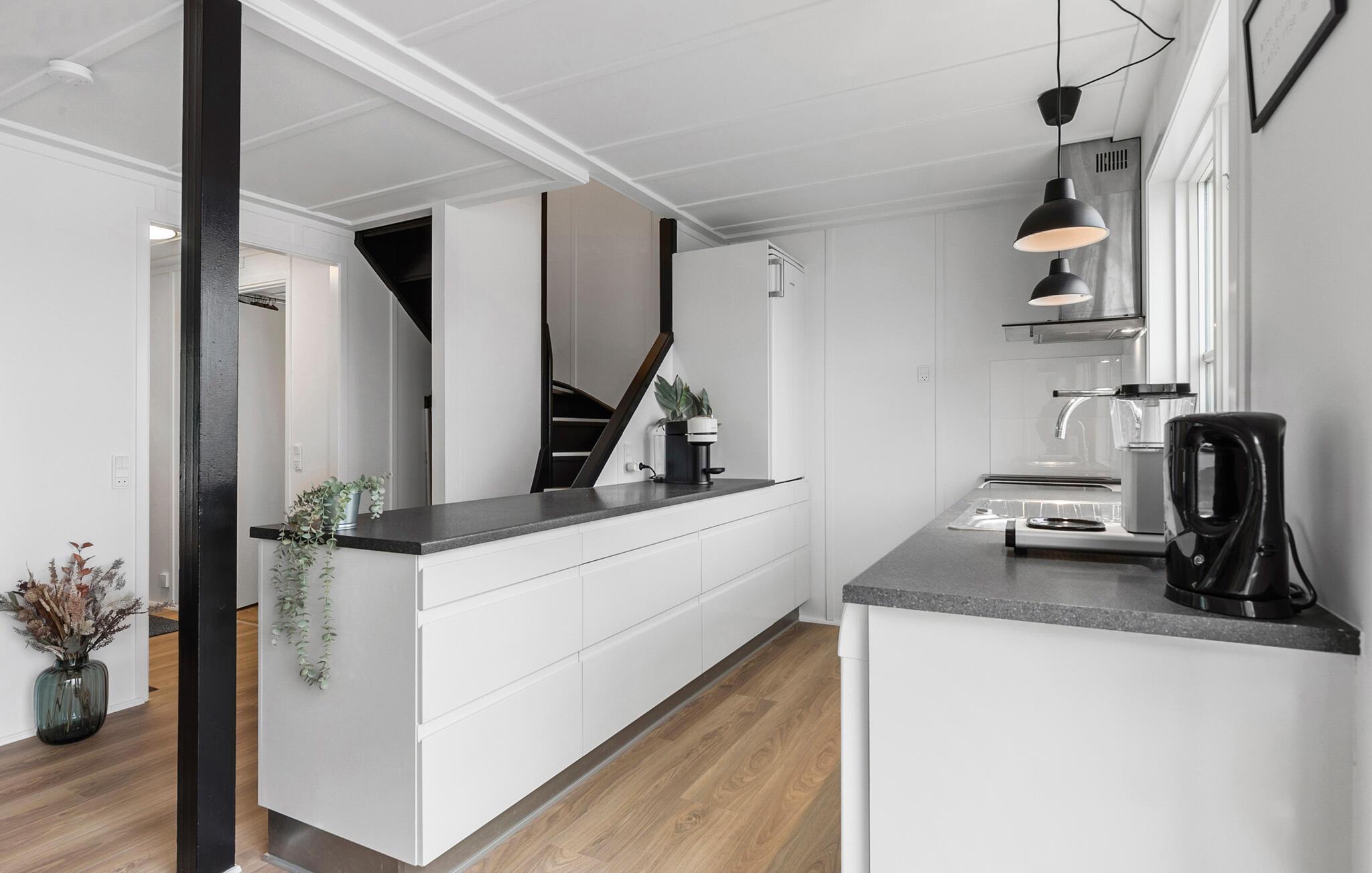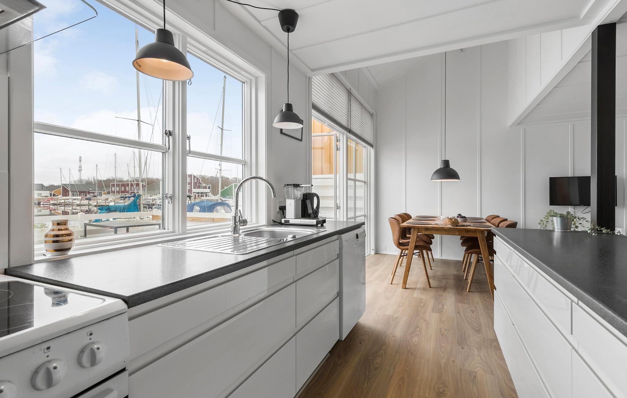 Huset er indrettet med kvalitetsmøbler og med sans for farver og sammensætning. Fra huset er der direkte udgang til en dejlig terrasse, som er beliggende lige ved vandet Her kan man nyde solen og udsigten det meste af dagen.