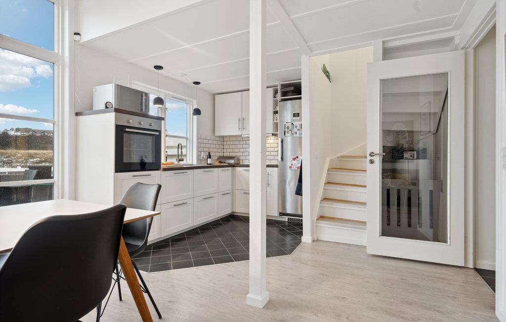 Fra den lyse og åbne stue med spisebord og køkken kan I gå udenfor til terrassen.