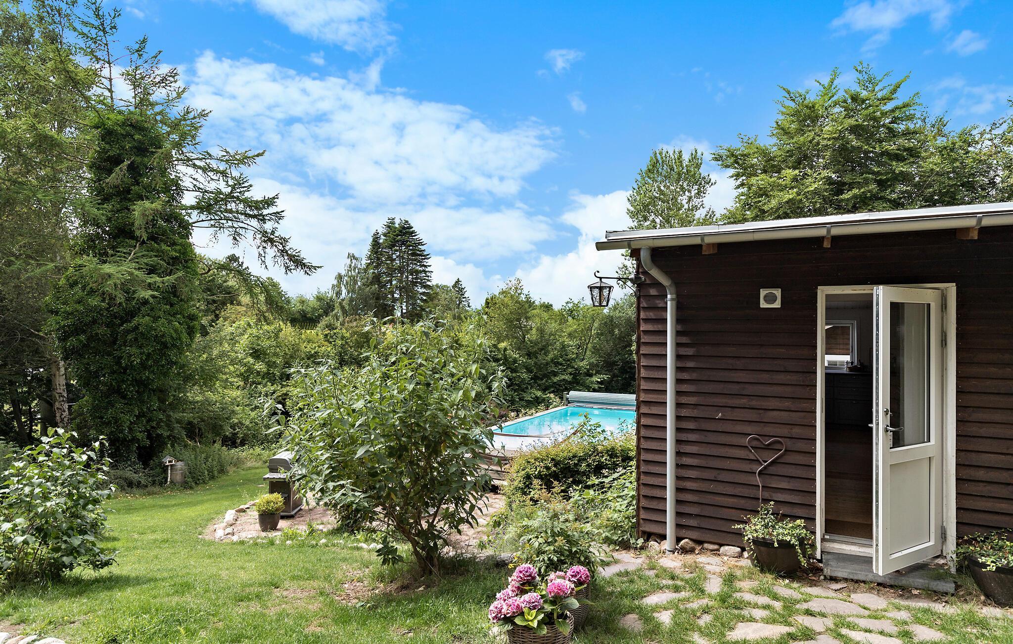 Stilfuldt poolhus ved Ølsted Strand med have, trampolin og nærhed til Roskilde Fjord.