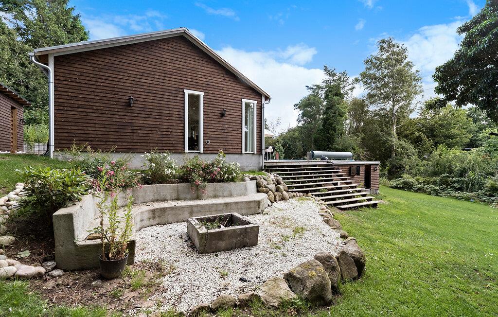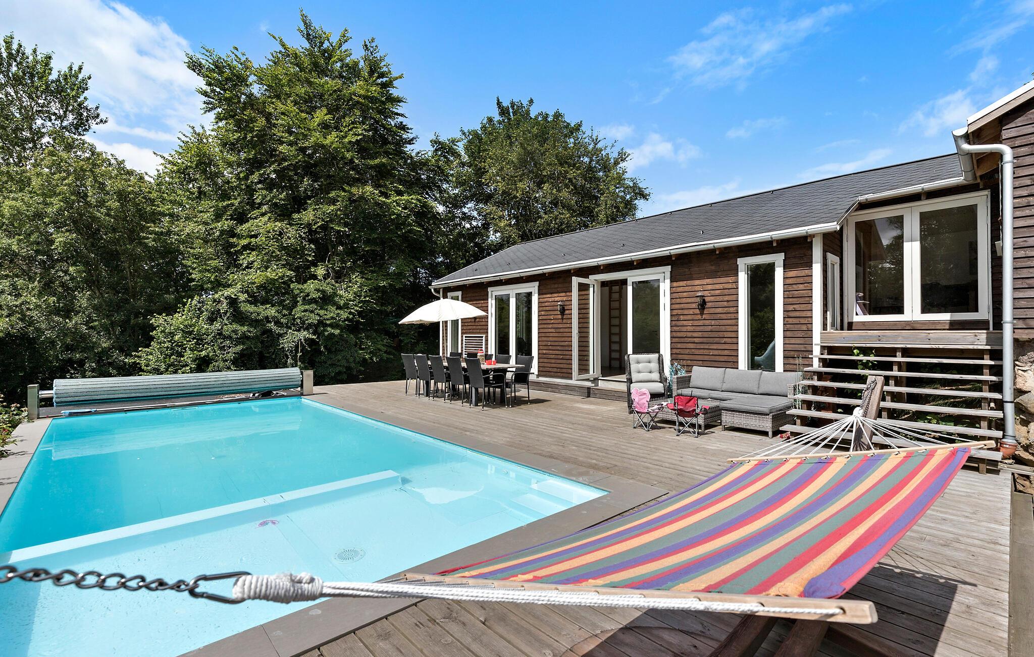 Nyd en ferie i dette moderne poolhus ved Ølsted Strand med stor terrasse, have, trampolin og privat opvarmet pool.