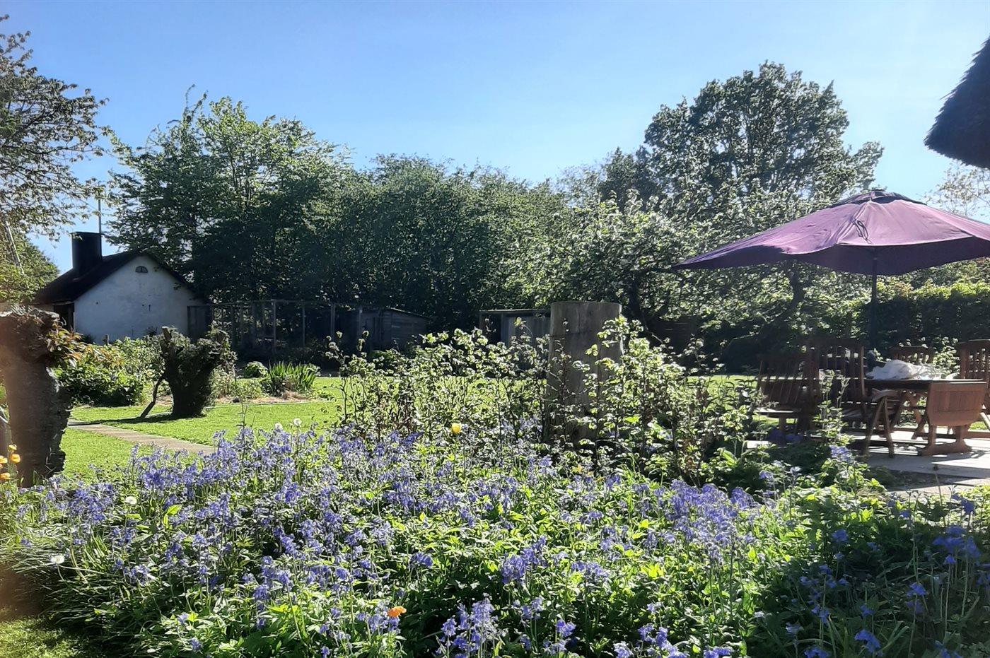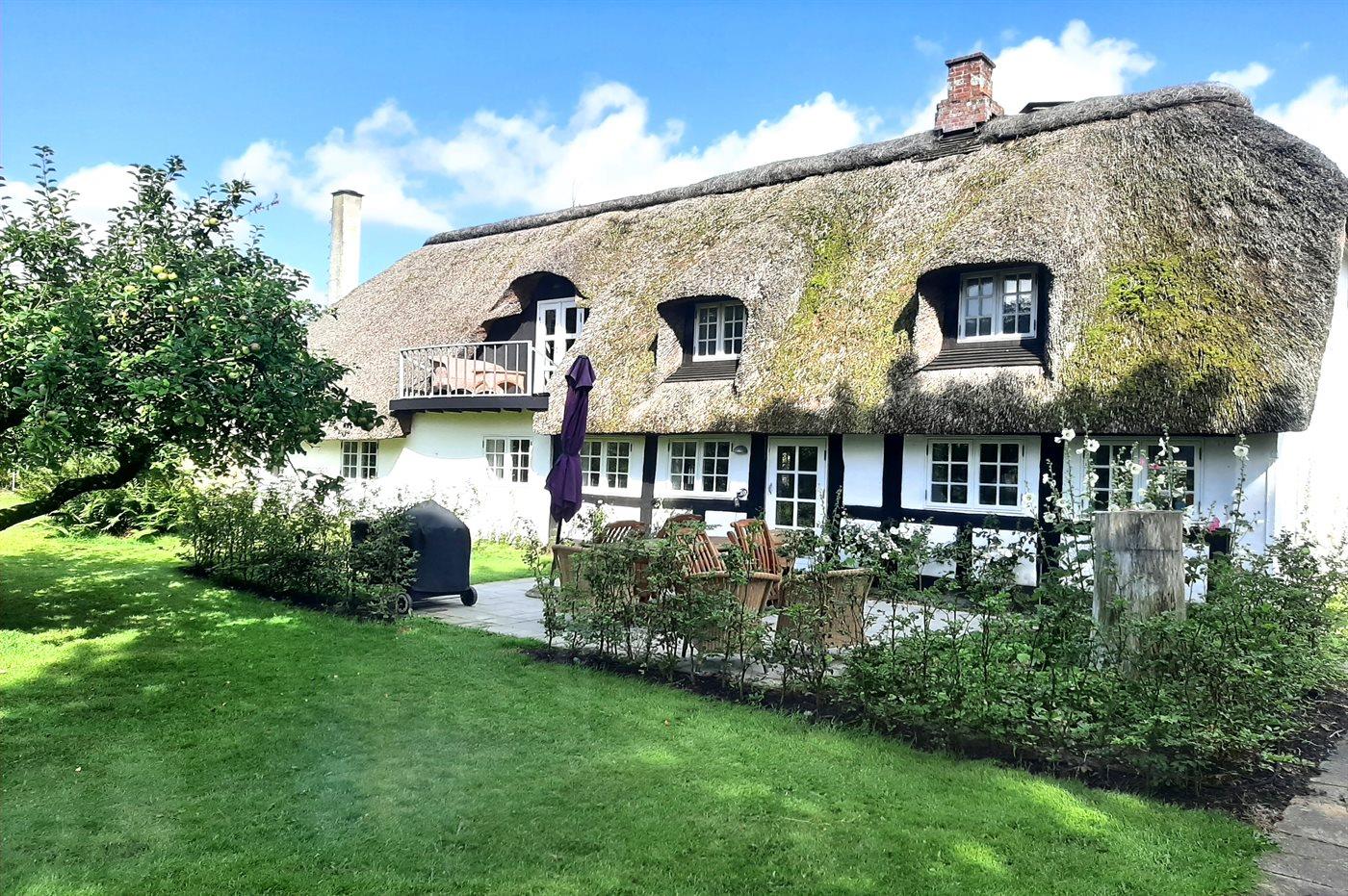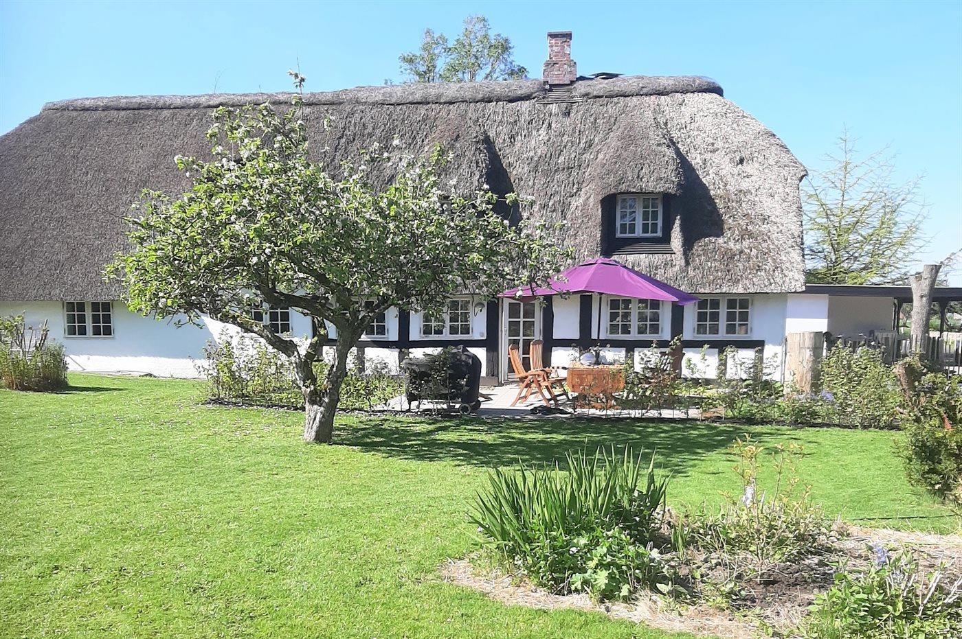 Charmerende totalrenoveret stråtækt sommerhus nær Ørby Strand med stor have og moderne komfort.