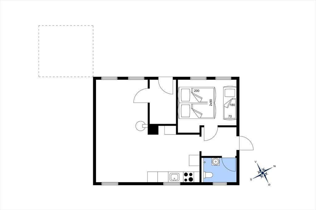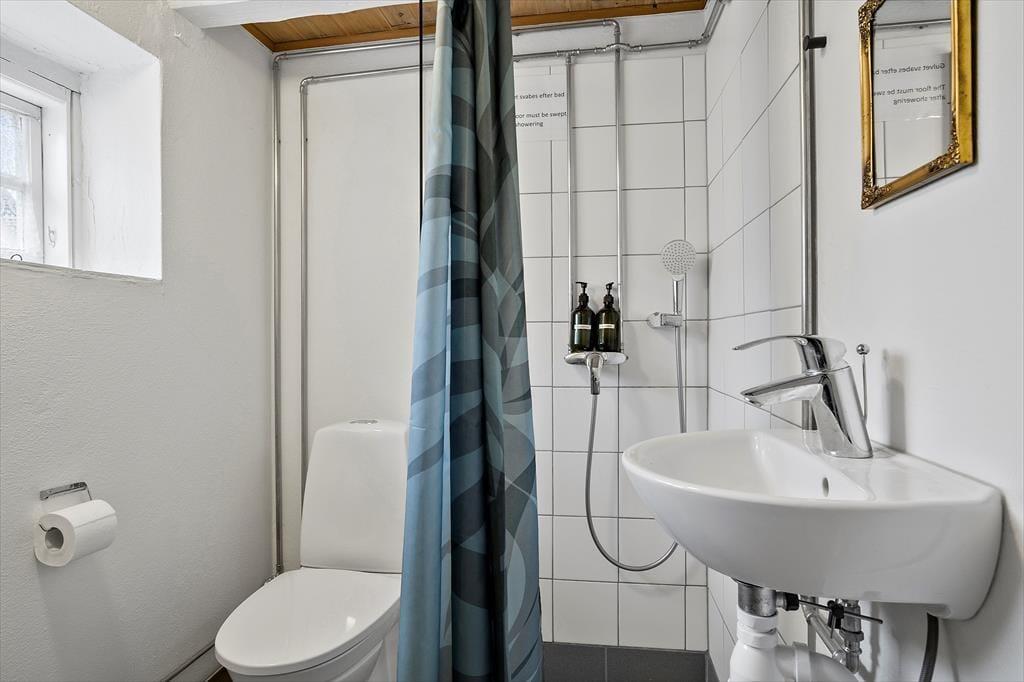 Fra parkeringspladsen er der via den gamle stalddør indgang til stor baggang med adgang til nyt badeværelse, samt lyst vestvendt soveværelse med el radiator, dobbeltseng og enkelt seng med mål 70 x 180.