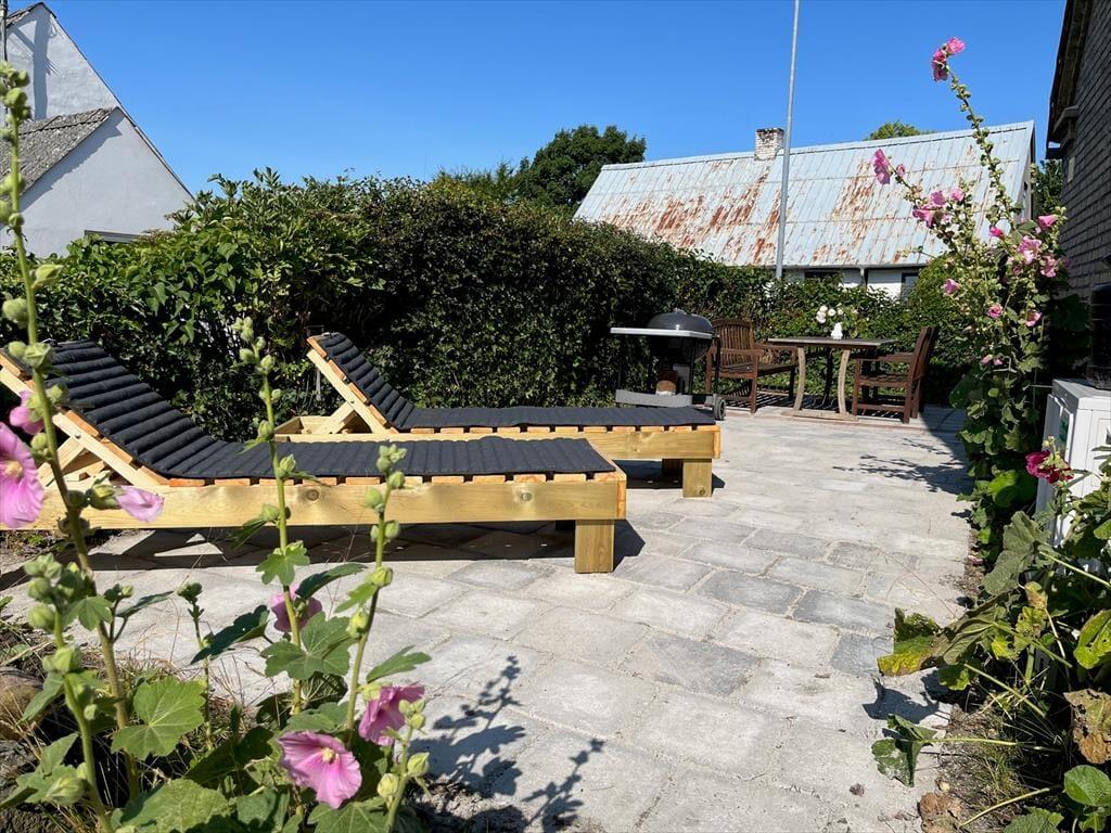 Haven mod vest bag huset er naturgrund med græs og privat aflåst udhus.