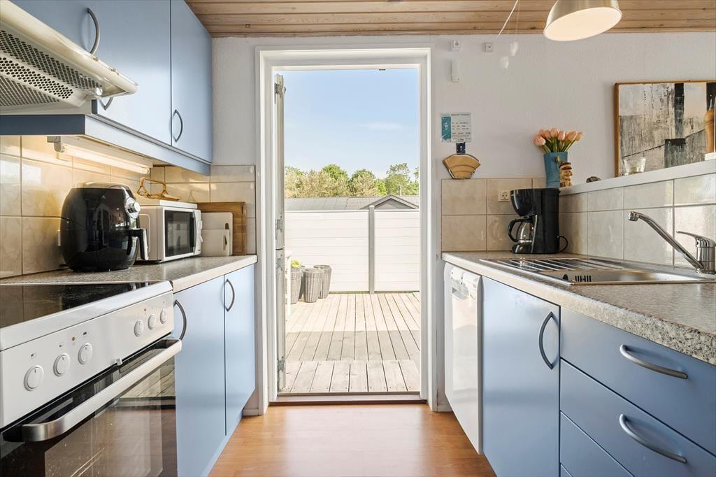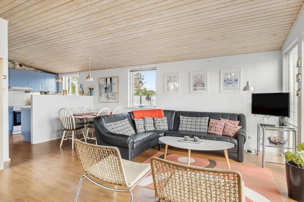 Huset er lyst og superhyggeligt indrettet i ægte sommerhusstil. Fra husets stue og køkken-alrum kan man betragte havet.